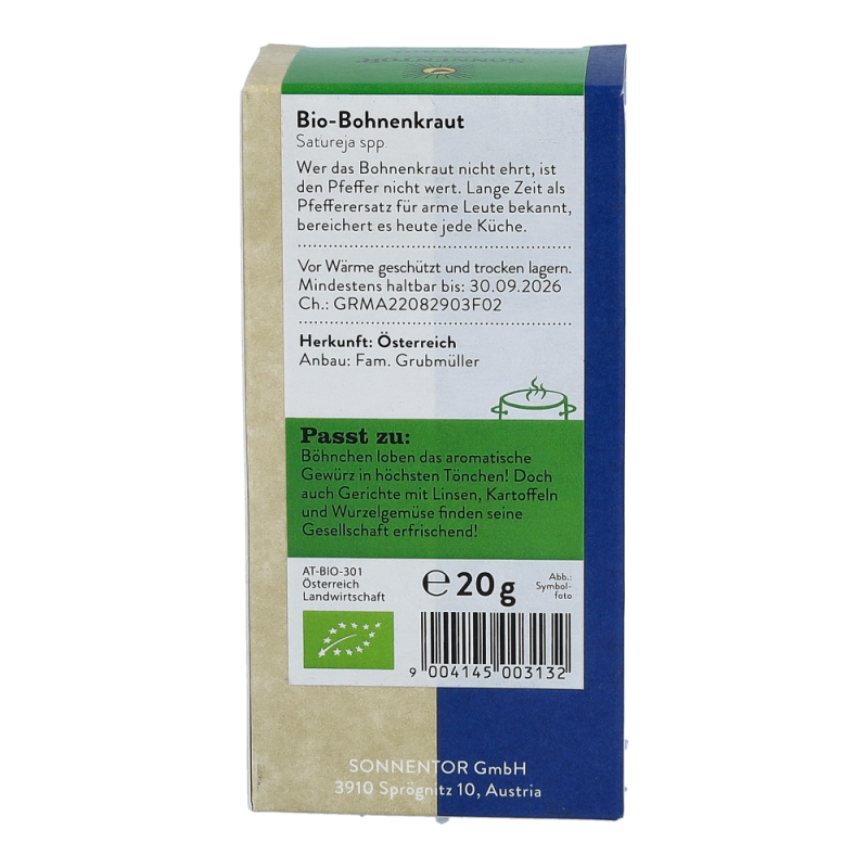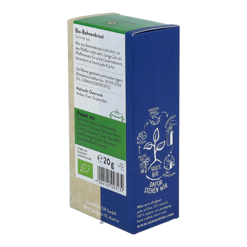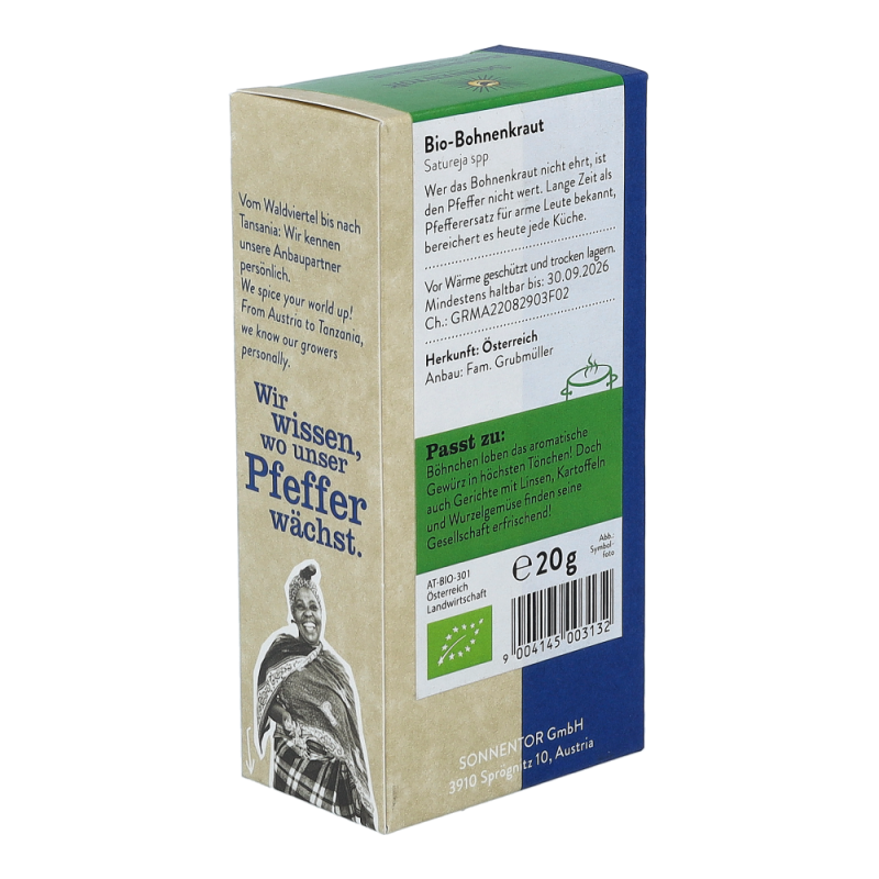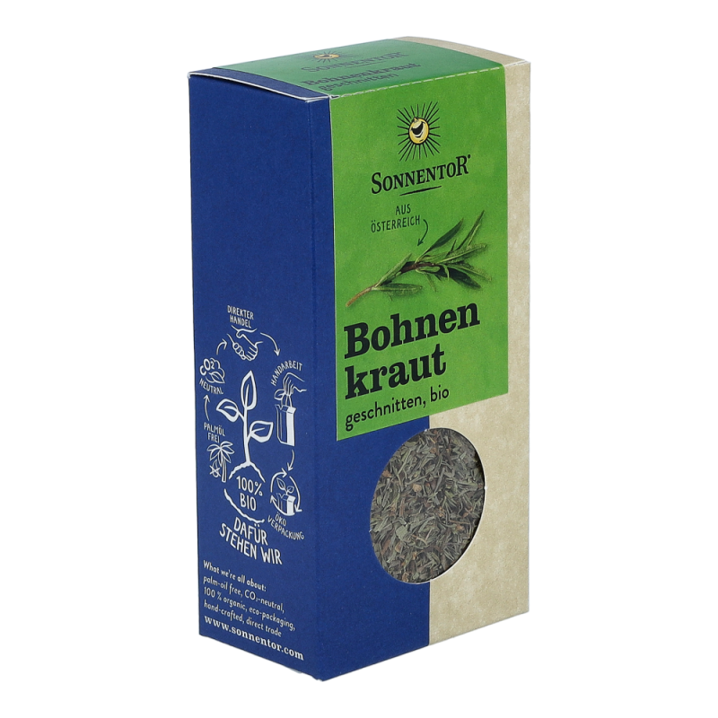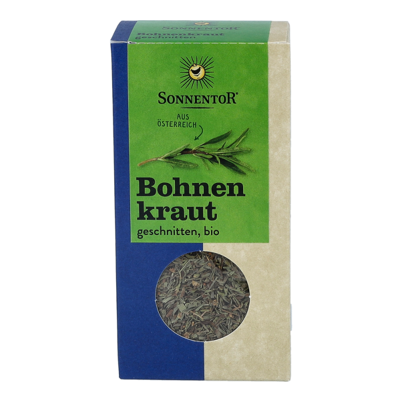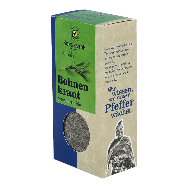 Das Sonnentor Bohnenkraut in der 20 g Packung duftet angenehm nach Majoran und Thymian und hinterlässt einen langanhaltenden, sehr erfrischenden Geschmack. Hervorragend schmeckt das aromatische Kraut nicht nur zu Bohnen, sondern auch zu anderen Hülsenfrüchten, Kartoffeln und Wurzelgemüse und ist auch aus der Balkanküche nicht wegzudenken.