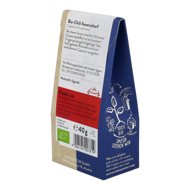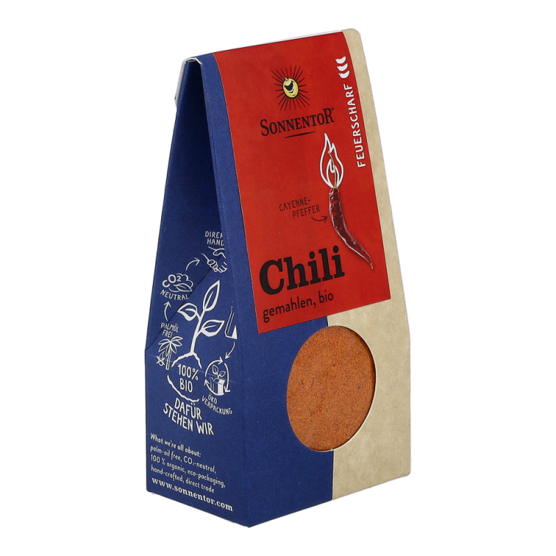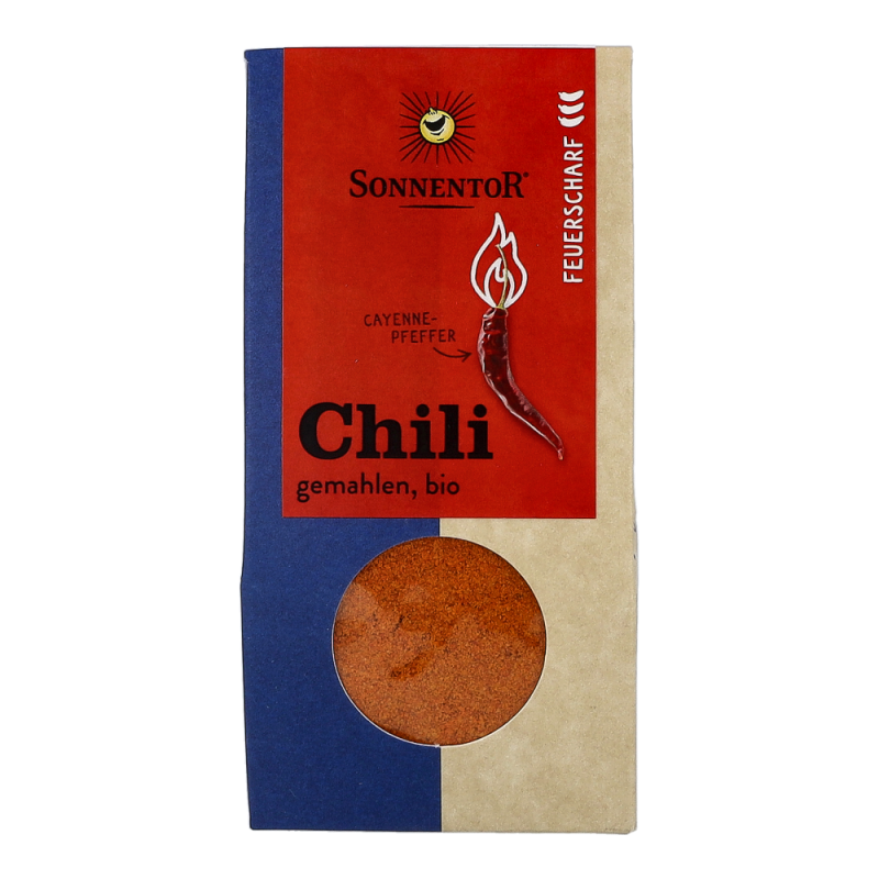 Sonnentor Chili feuerscharf gemahlen in der 40 g Packung begeistert all jene, die mit Ihrer Liebe zu scharfem Essen oftmals die Grenze zwischen Genuss und Schmerz überschreiten. Der fruchtige Duft der Bio Chilischoten zeichnet ein harmloses Bild, jedoch bewegen sich die Schärfegrade aber in einem Bereich von 6 bis 10 feurigen Punkten (genauere Informationen zum Schärfegrad sind auf der Verpackung angegeben). Soll’s doch lieber ein bisschen milder sein? Sonnentor Chili gemahlen in der 40 g Packung übzeugt auch die etwas sensibleren Liebhaber von pikantem Essen.