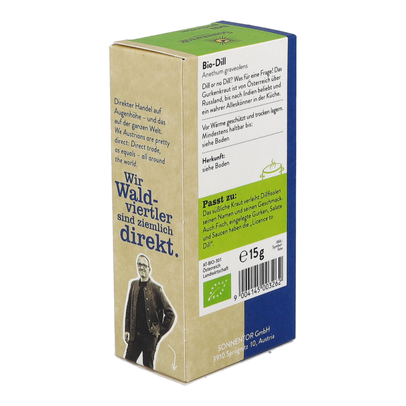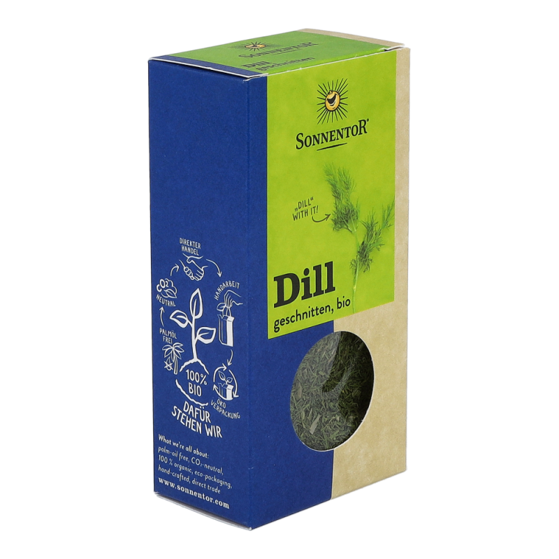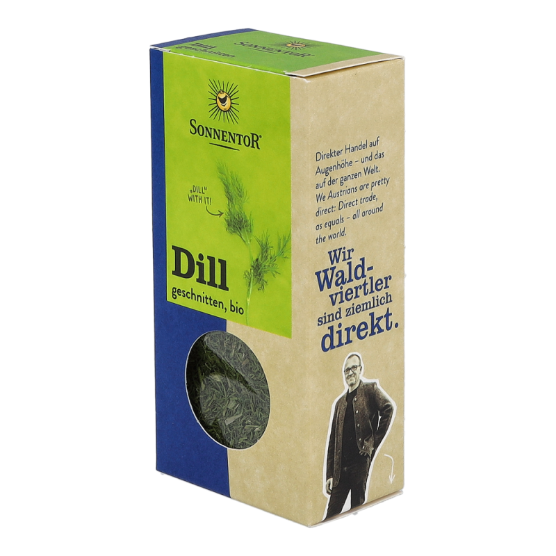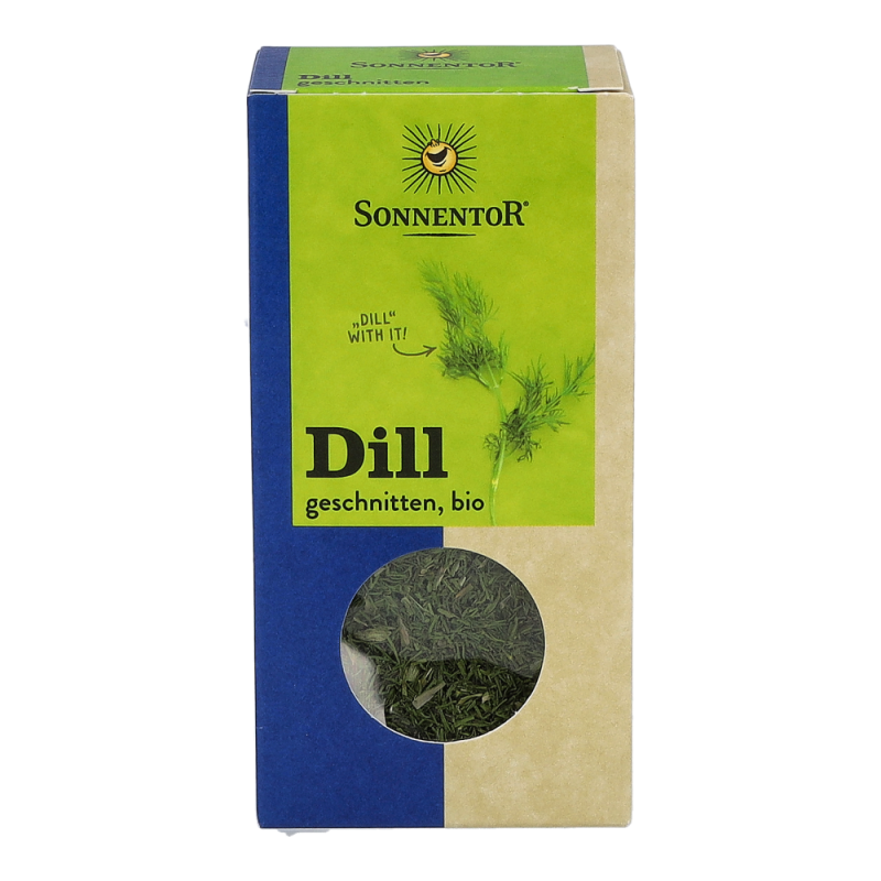 Der Sonnentor Dill in der 15 g Packung geht locker als wahrer Alleskönner in der Küche durch! Dillfisolen und -erdäpfel, ein erfrischend-sommerliches Dill-Gurken-Joghurt oder auch typisch indische Gerichte mit Spinat und Linsen sind nur einige Beispiele für Gerichte, in denen der Dill, auch genannt Gurkenkraut, die Hauptrolle spielt.
