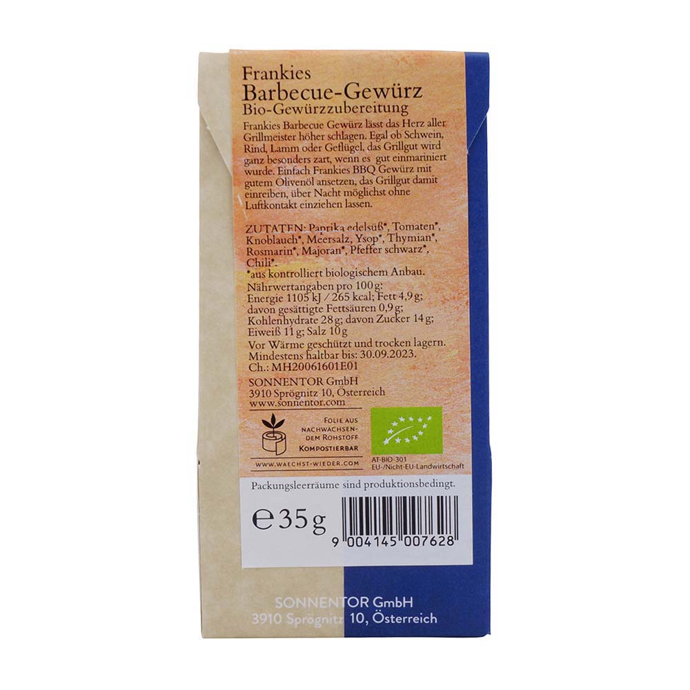 Wenn der Grillrost glüht, das Bier eingekühlt ist und die Messer gewetzt sind, dann ist die Barbecue-Saison voll im Gange. Grillen, der sommerliche Nationalsport auf der ganzen Welt aber ganz besonders in den USA und in Down Under. Frankies Barbecue Gewürz lässt das Herz aller Grillmeister höher schlagen. Die vielen grob geschnittenen Kräuter machen den Gang in den Garten überflüssig. Auch in der Streudose und als Gastrodose erhältlich.