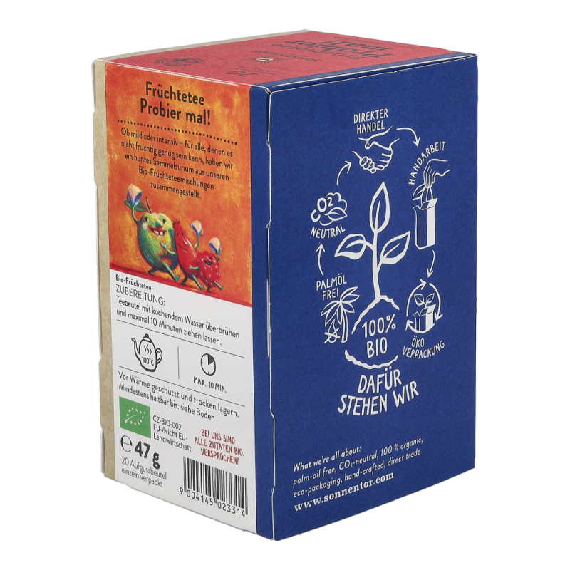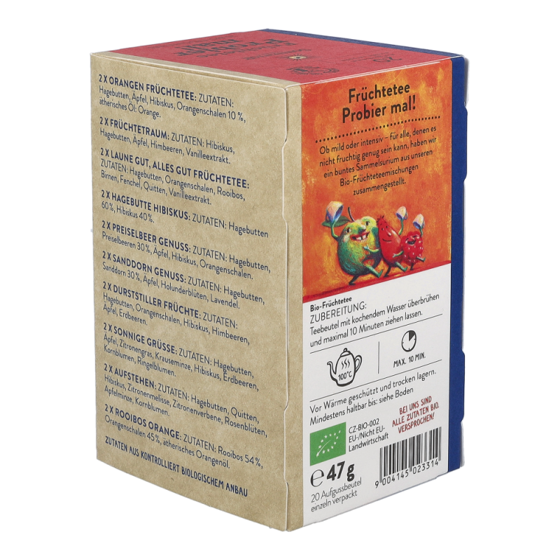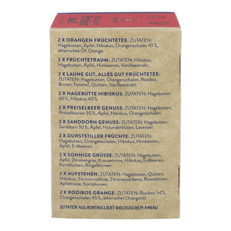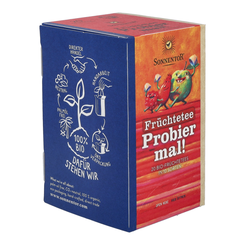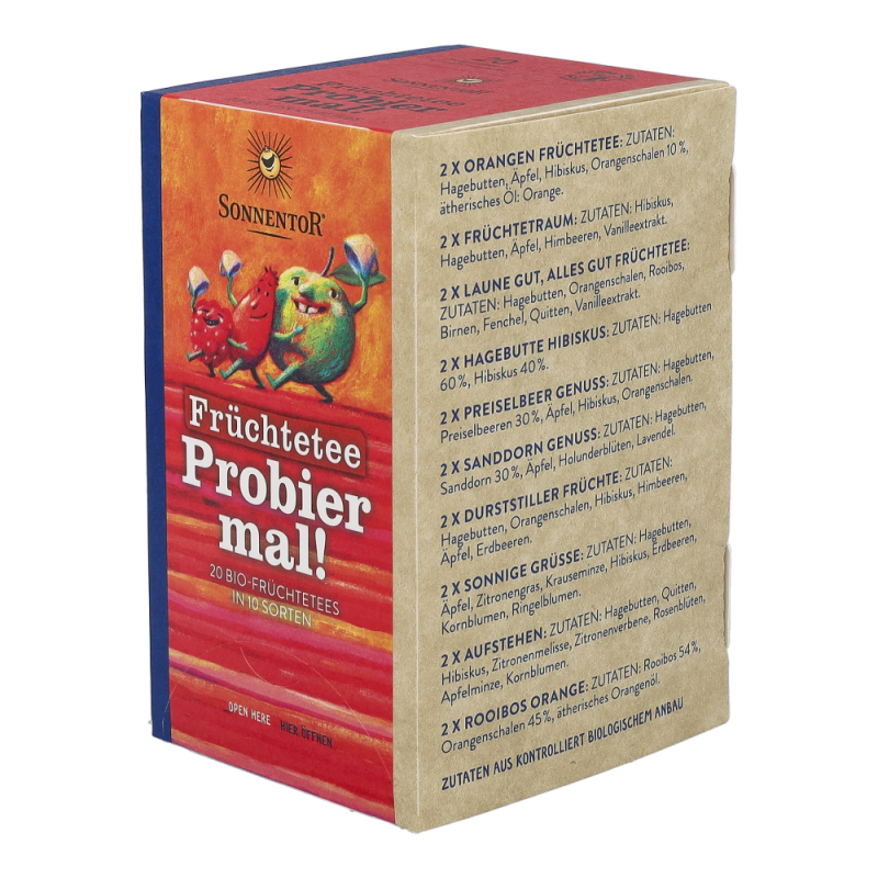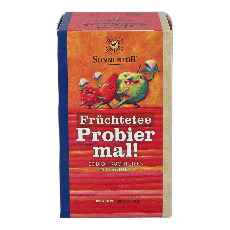 In dieser Sonnentor Früchtetee Probier mal!-Packung warten 20 köstlich-fruchtige Tees in 11 verschiedenen Sorten darauf, verkostet zu werden. Neues kennenlernen, Vielfalt erleben und sich dem Teegenuss hingeben, ist mit dieser Mischung von köstlichen Früchtetees ganz einfach. Probier mal! jetzt alle Produkte von Sonnentor stark preisreduziert bestellen!