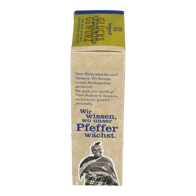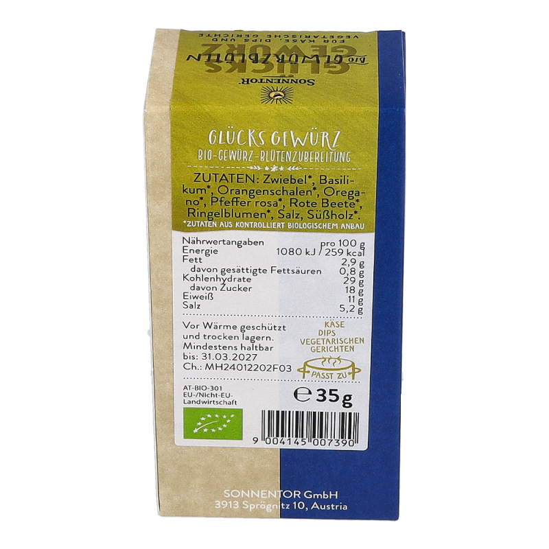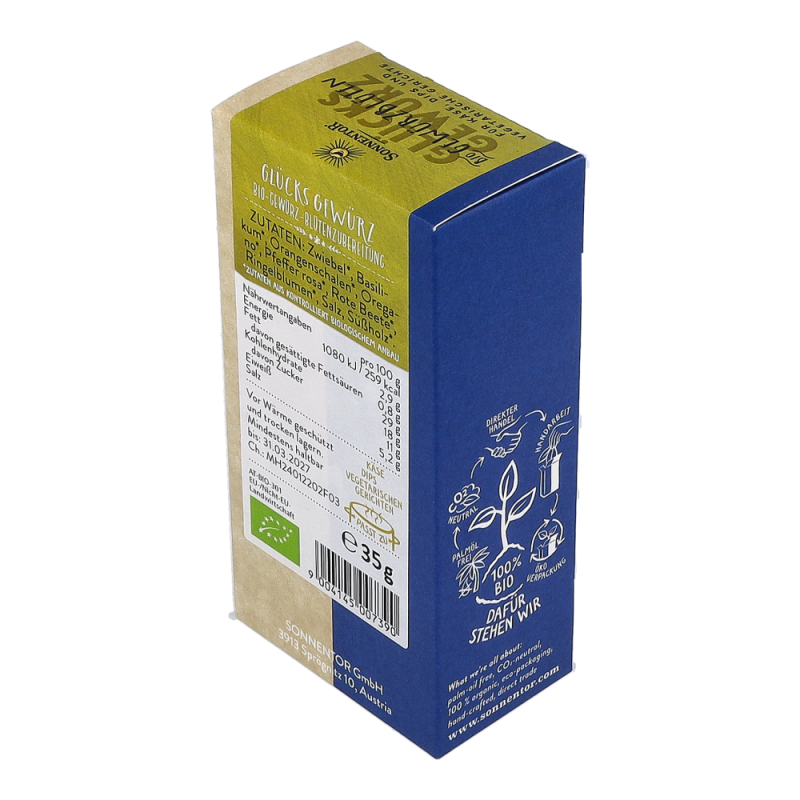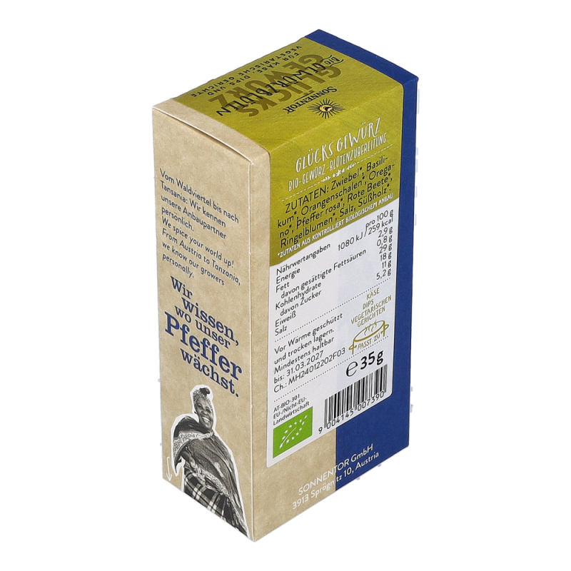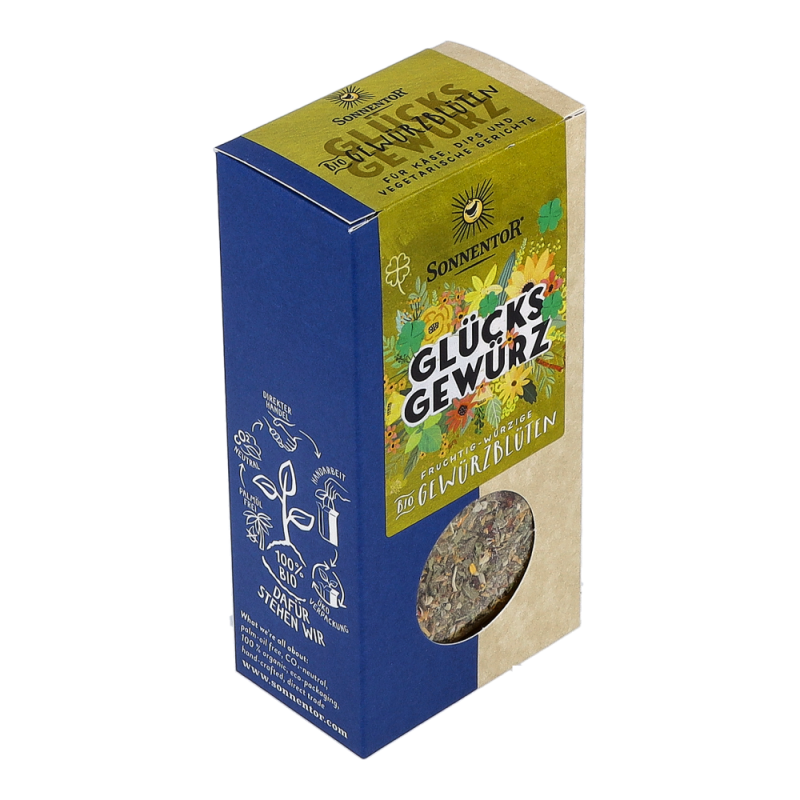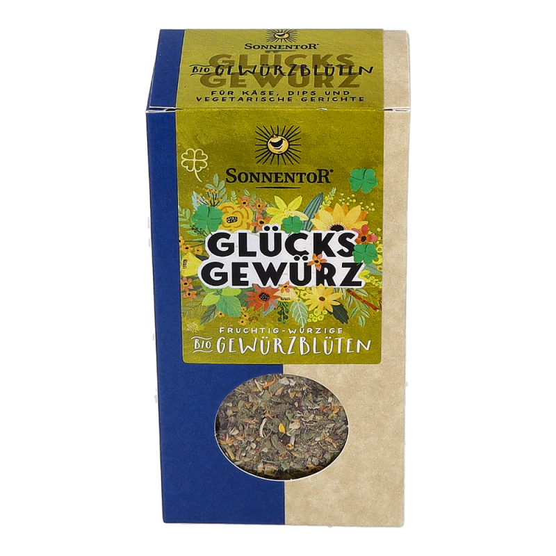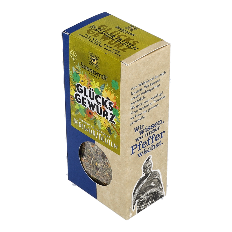 Die Sonnentor Glücks Gewürz-Blüten-Zubereitung in der 35 g Packung sorgt mit mediterranen Kräutern wie Basilikum und Oregano, abgerundet mit rosa Pfeffer, roter Beete und Ringelblumen und einer würzigen Lauchnote für nachhaltige Glücksgefühle! Wunderbar schmeckt diese Mischung zu Kartoffeln, Wurst und Speck und sie verleiht den italienischen Klassikern Nudeln, Pizza und Bruschetta-Brötchen einen neuen Touch.