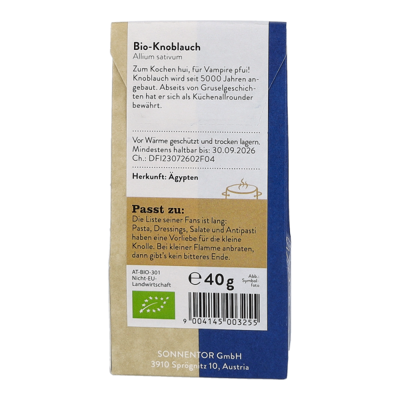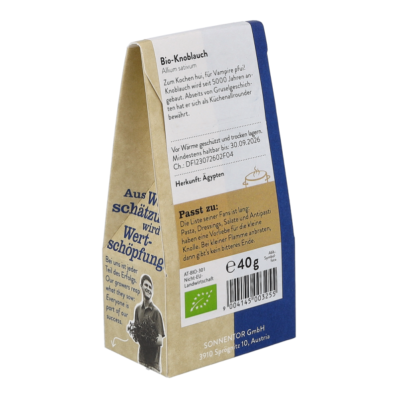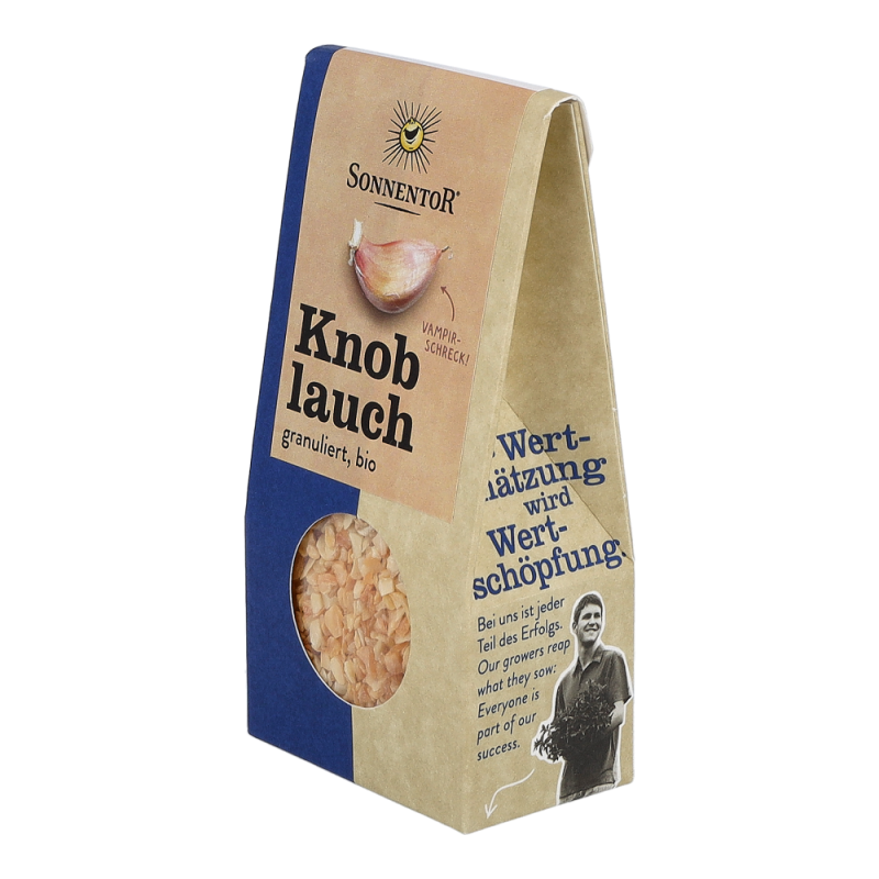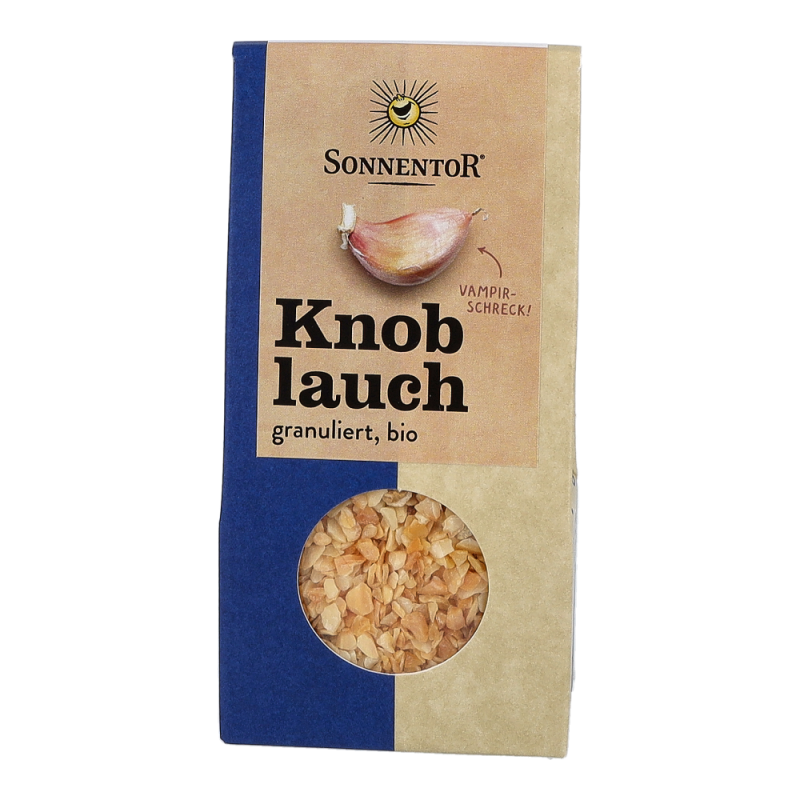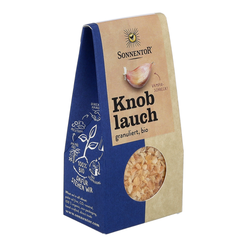 Sonnentor Knoblauch granuliert bio in der 40 g Packung besitzt einen aromatisch-scharfen Geschmack, der sich beim Kochen zu einem süßlichen und wesentlich milderen Alleskönner in der Küche verwandelt. In Mittel- und Südosteuropa, wo er Pasta und Gemüsegerichte verfeinert, ist der Knoblauch nicht wegzudenken. Aber auch auf dem traditionell-deftigen Sonntagsbraten schmeckt das Sonnentor Knoblauch Granulat unschlagbar