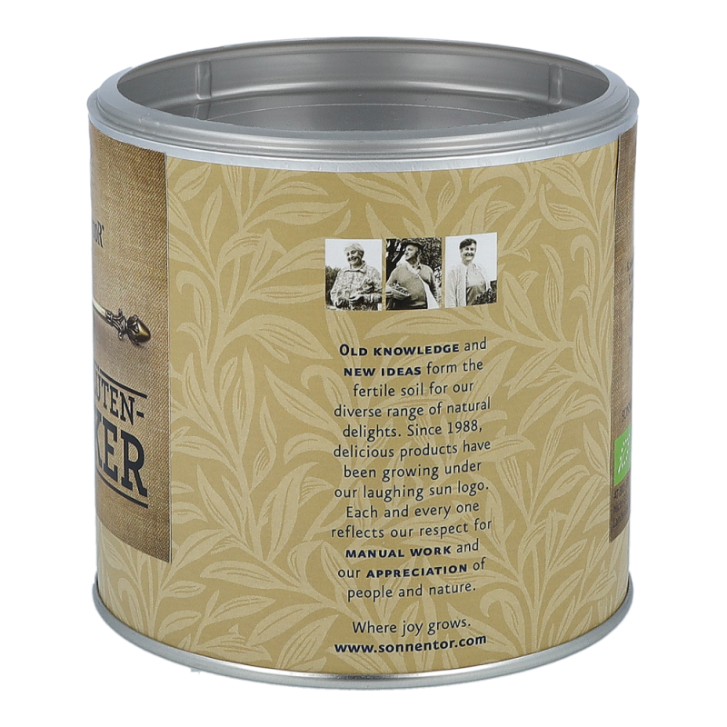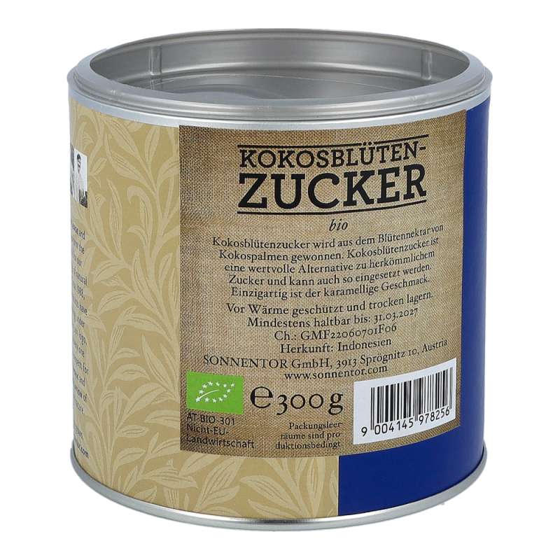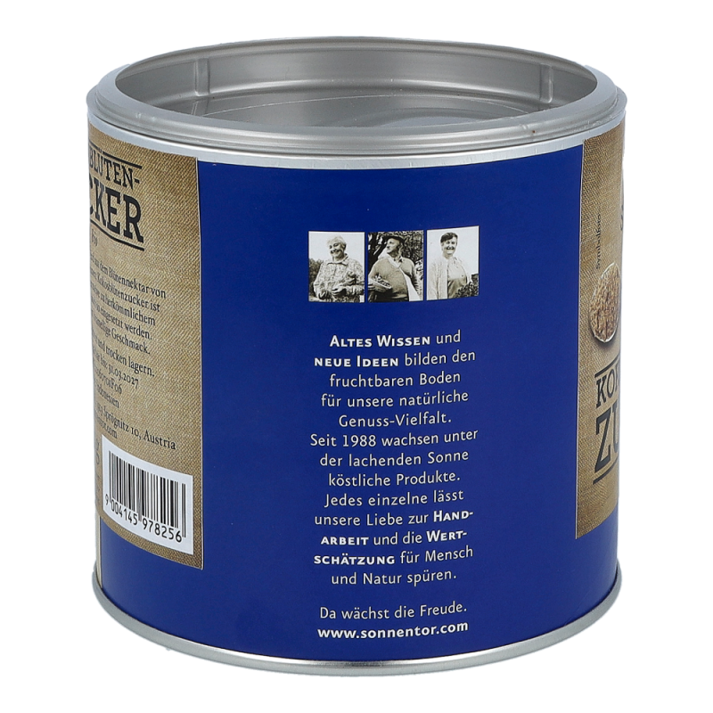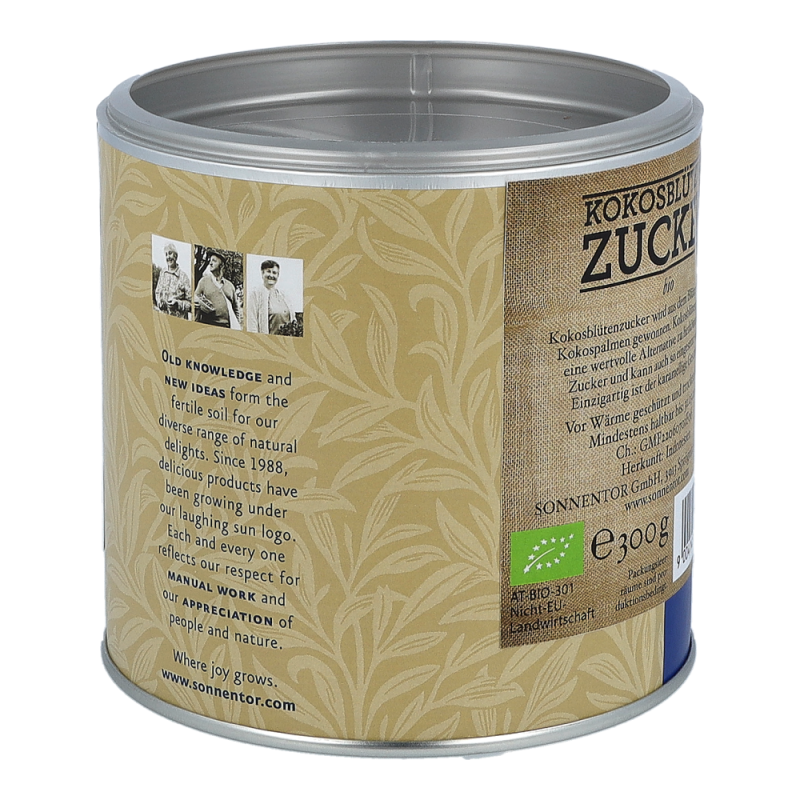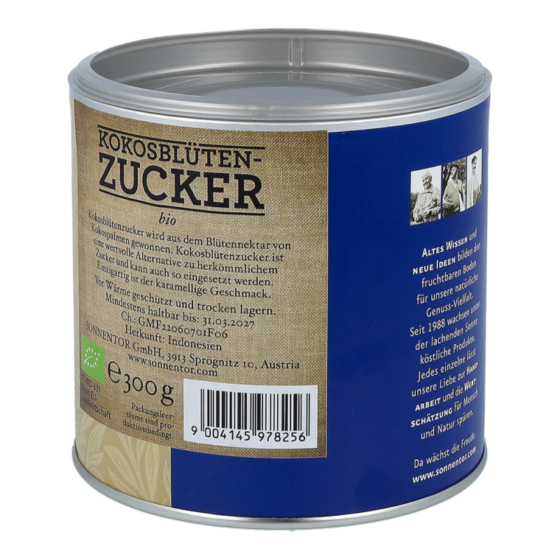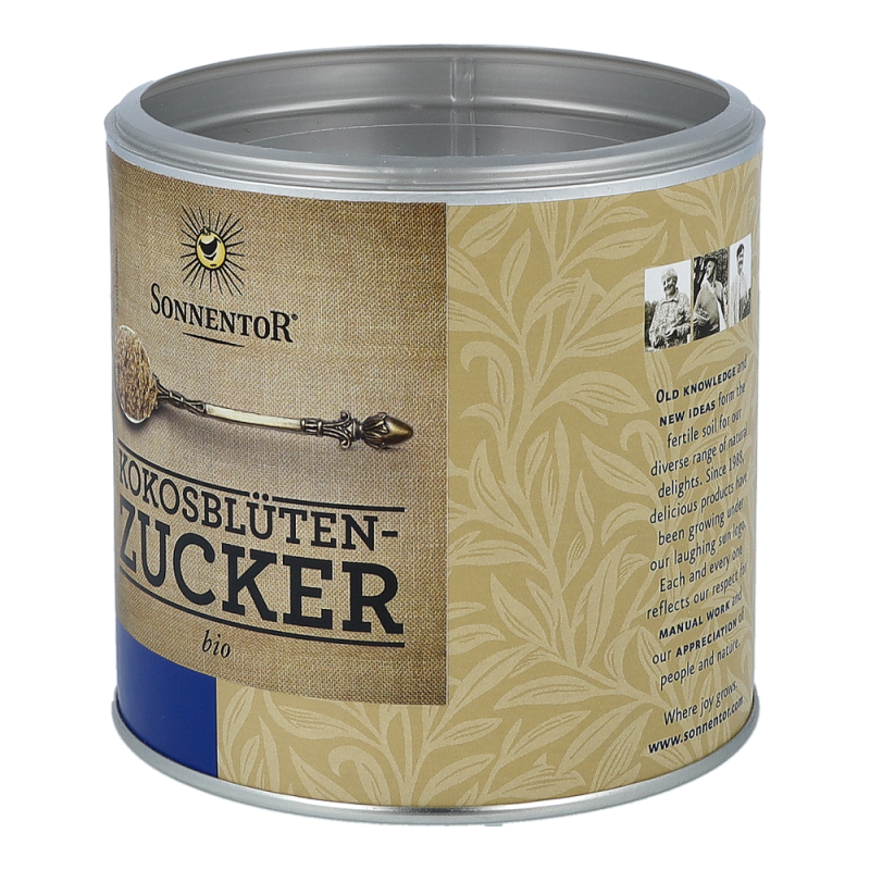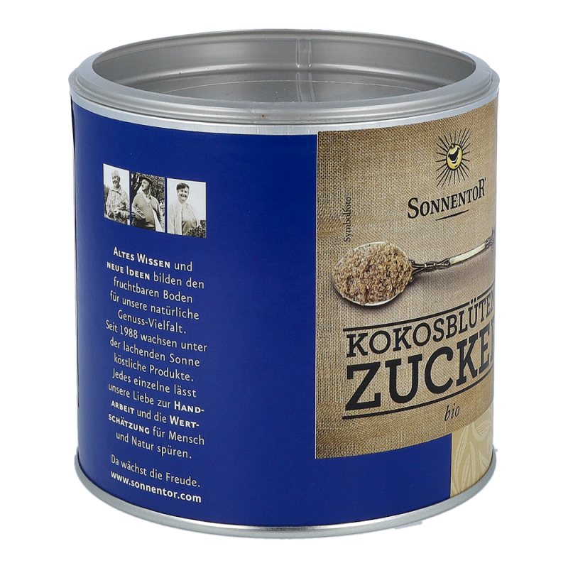 Der Sonnentor Kokosblütenzucker in der 300 g Gastrodose wird aus dem Blütennektar der Kokospalme gewonnen und dann in Kesseln über dem Feuer erhitzt bis er granuliert. Kokosblütenzucker ist nicht nur der nachhaltigste Zucker sondern er verführt auch mit seinem einzigartigen, karamelligen Geschmack.