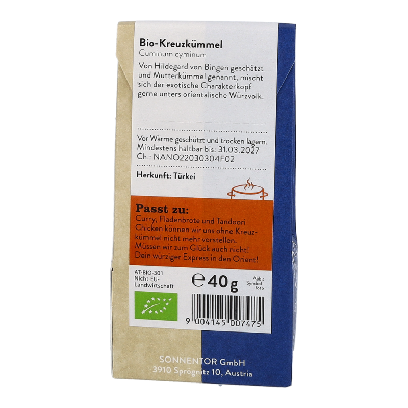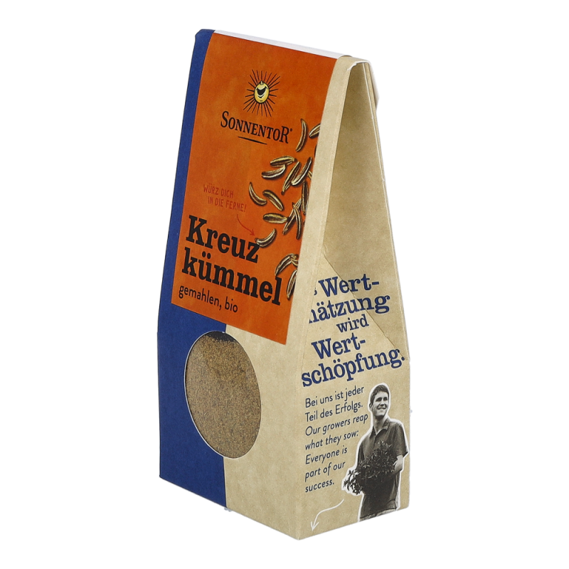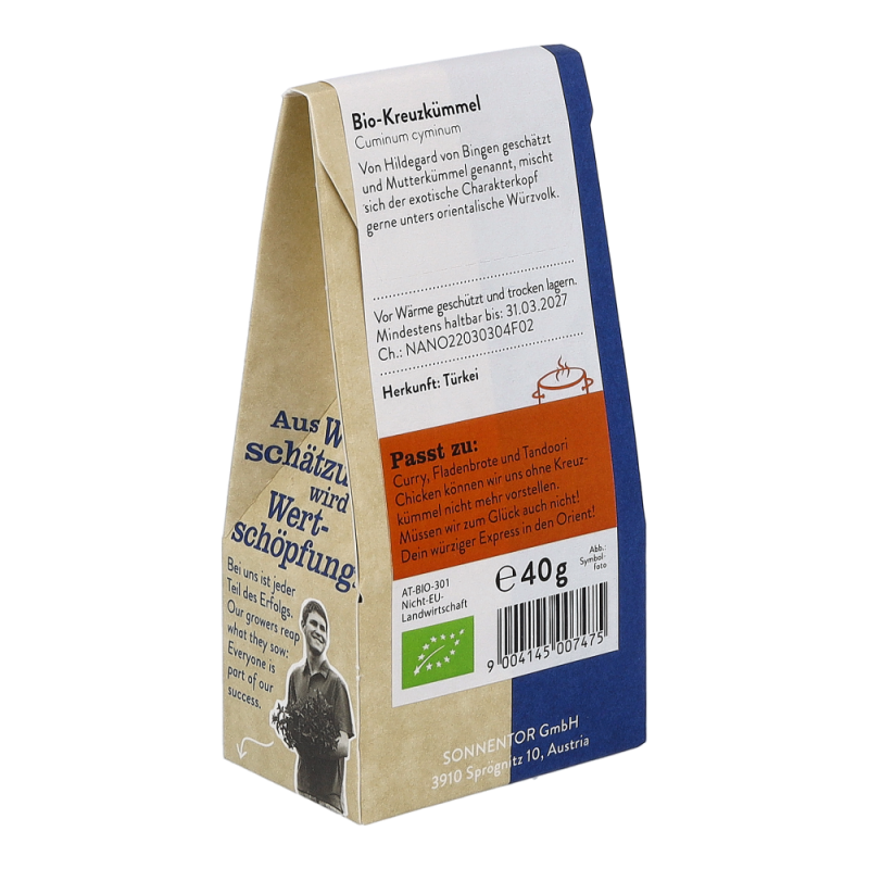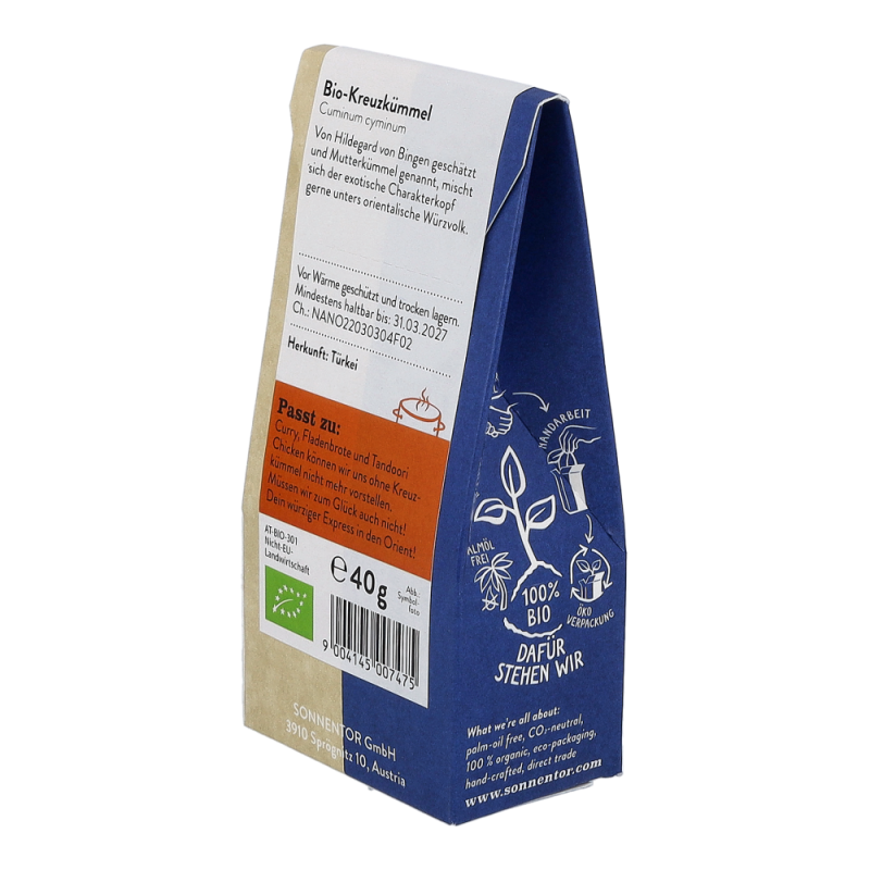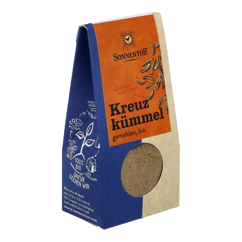 Der Sonnentor Kreuzkümmel gemahlen im 40 g Päckchen besitzt ein schweres, volles, aber auch süßliches Aroma, das von einer frischen Mentholnote abgerundet wird und ist absolut einzigartig. Kreuzkümmel ist wohl das Hauptgewürz der indischen Küche, Gewürzmischungen wie Curry oder auch Garam Masala und Tandoori-Mischungen wären ohne ihn undenkbar. Ihren vollen Geschmack entfalten die Kreuzkümmelsamen, wenn man sie vor der Verwendung leicht anröstet.