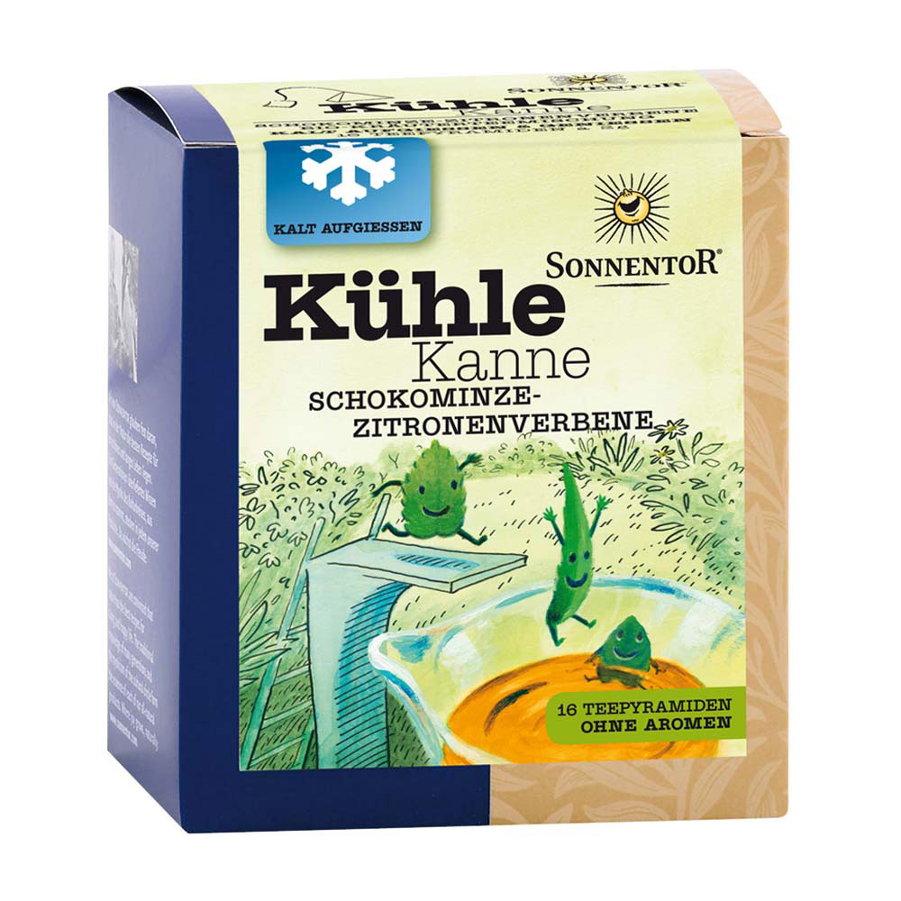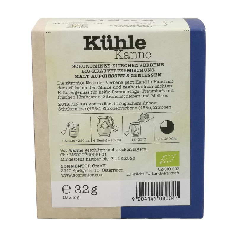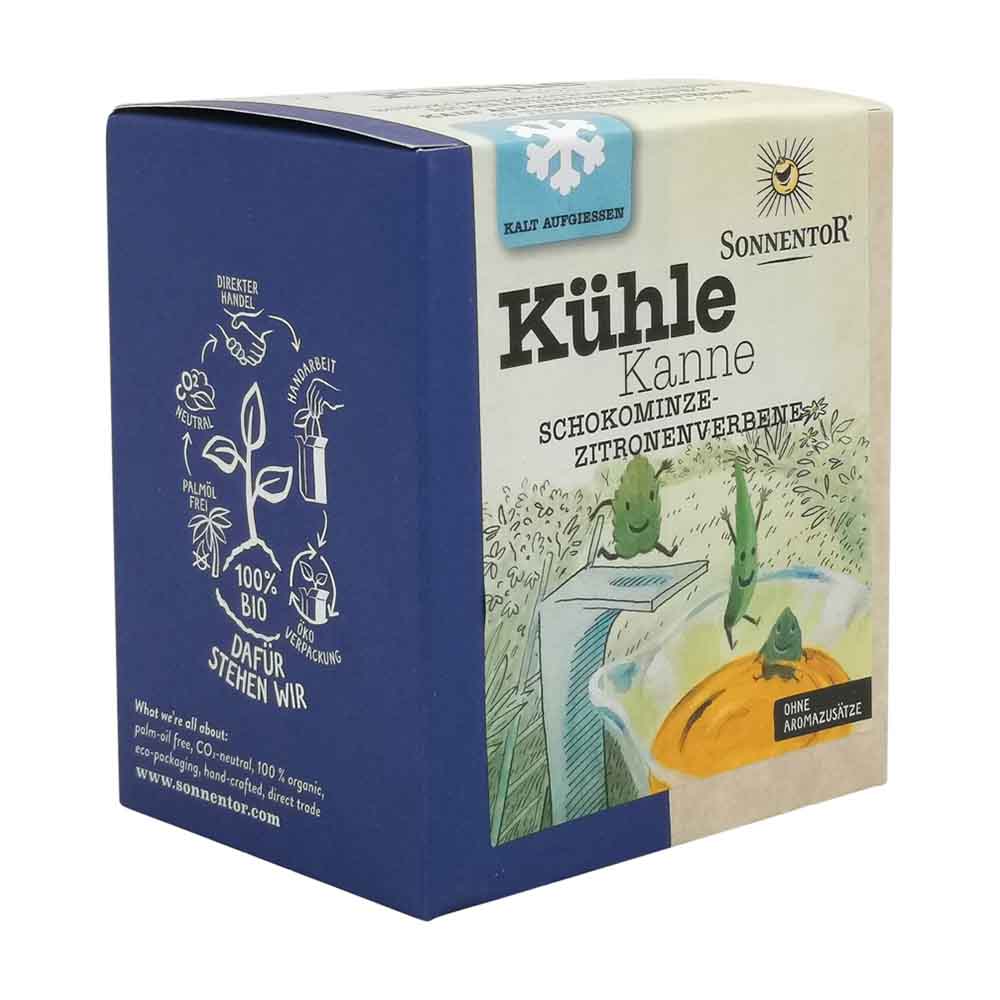 Der Sonnentor Kühle Kanne Schokominze-Zitronenverbene Tee in Kannenbeutel (16 Stk.) verfeinert kühlende Schokominze mit zitroniger Verbene und zaubert einen leichten Kräutergenuss für heiße Sommertage. Kalt aufgegossen und mit Zitronenscheiben, frischen Himbeeren und Melisse aus dem Garten verfeinert, sorgt diese Komposition ganz schnell für Abkühlung und sommerliche Gefühle .