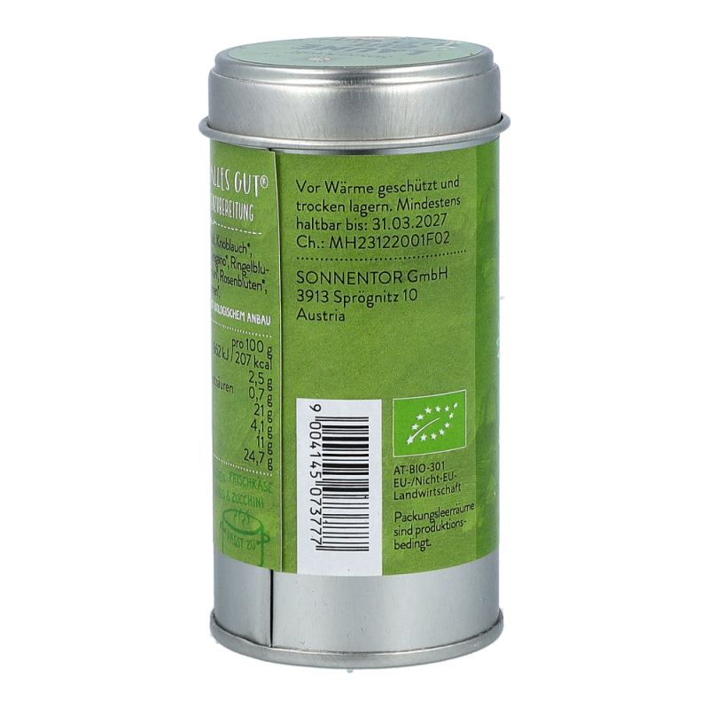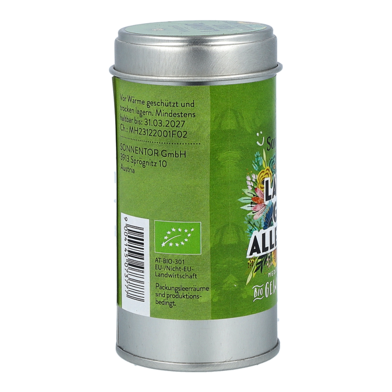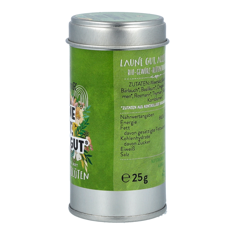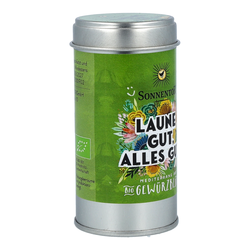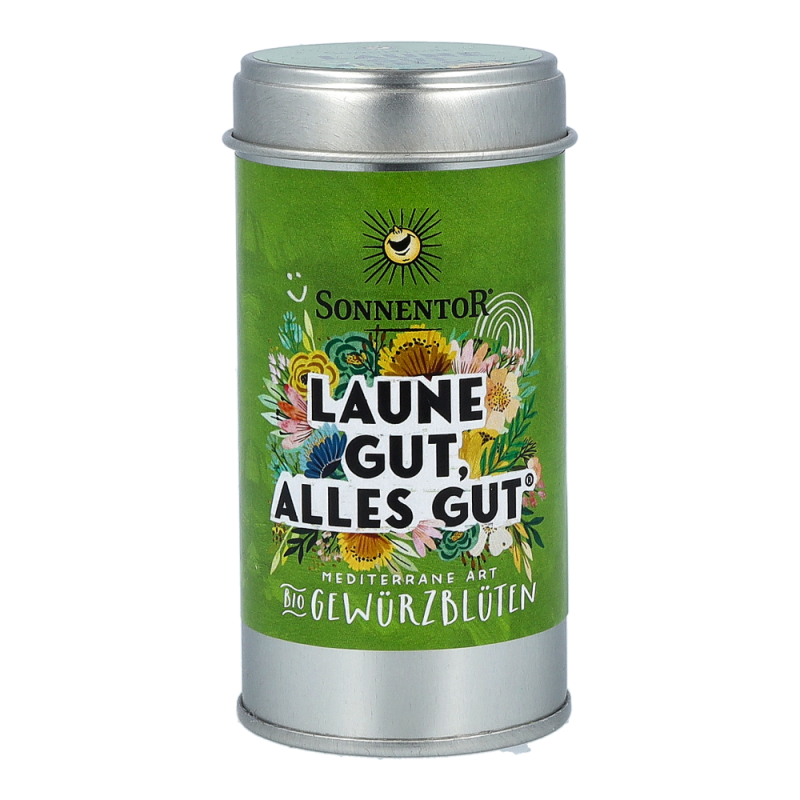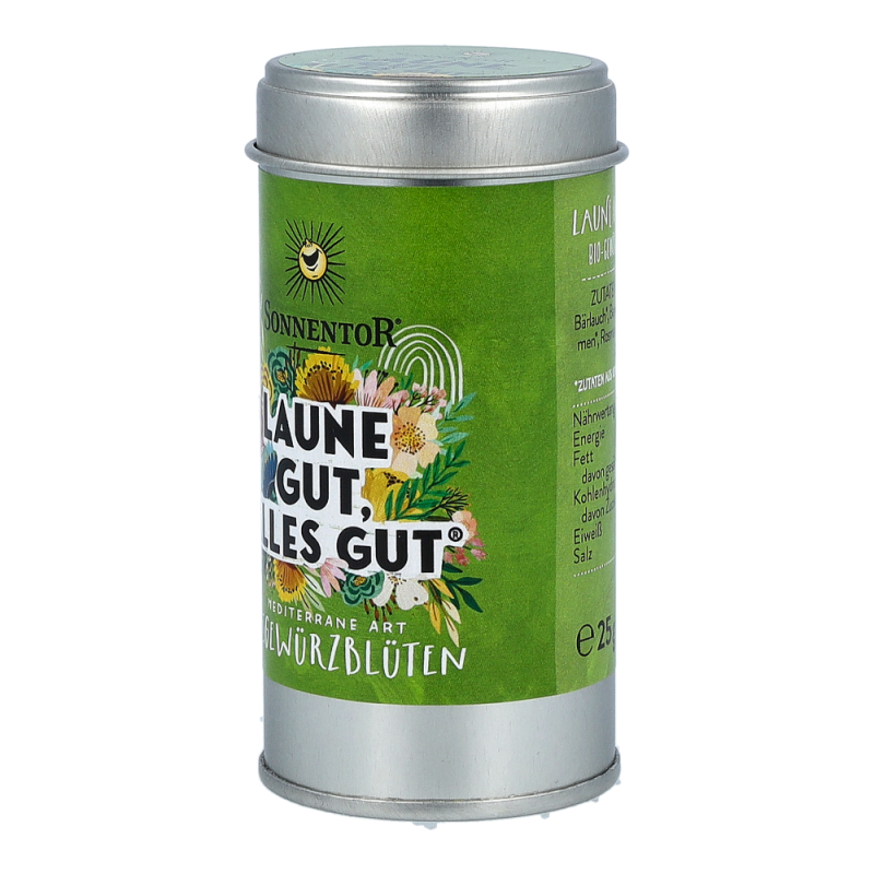 Die Sonnentor Laune gut, alles gut® Gewürz-Blüten-Zubereitung in der 25 g Streudose sorgt mit ihrer mediterranen Komposition aus Knoblauch, Oregano, Basilikum, Thymian, Rosenblüten und Rosmarin für einen herrlichen Gute-Laune-Schub. Das feine Aroma dieser Zubereitung schmeckt hervorragend in Gemüse-, Nudel- und Reisgerichten sowie Vorspeisen, Salaten und Terrinen.