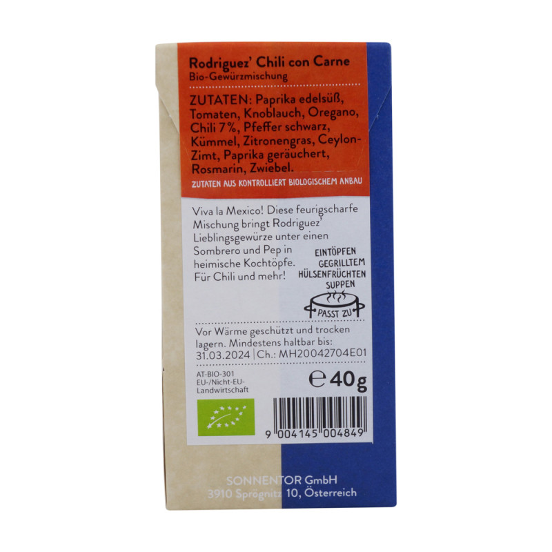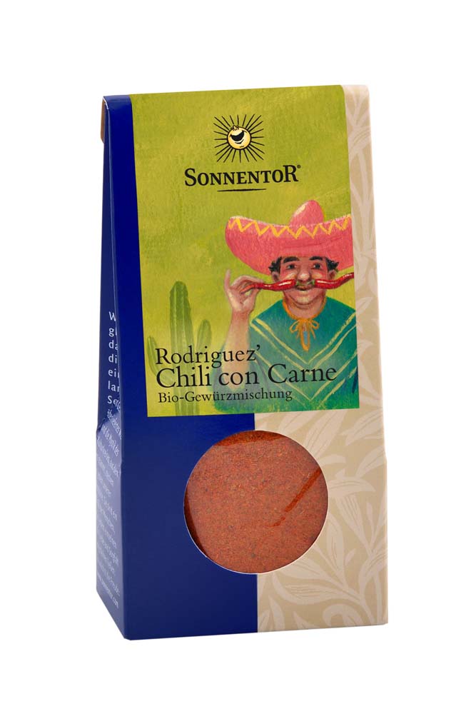 Sonnentor Rodriguez‘ Chili con Carne in der 40 g Packung ist eine feurig-scharfe Komposition aus Paprika edelsüß, Tomaten, Oregano, Knoblauch, Kreuzkümmel, Chili und Zimt, die die richtige Abwechslung in Ihre Chilis con oder sin Carne, Nudel-, Reis- und Hackfleischgerichte bringt