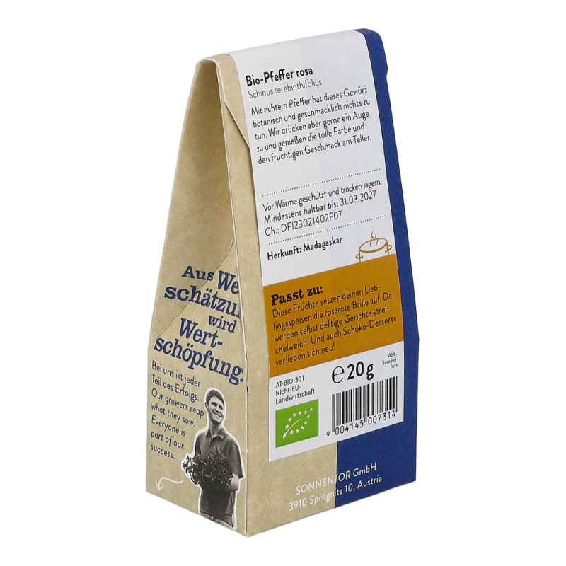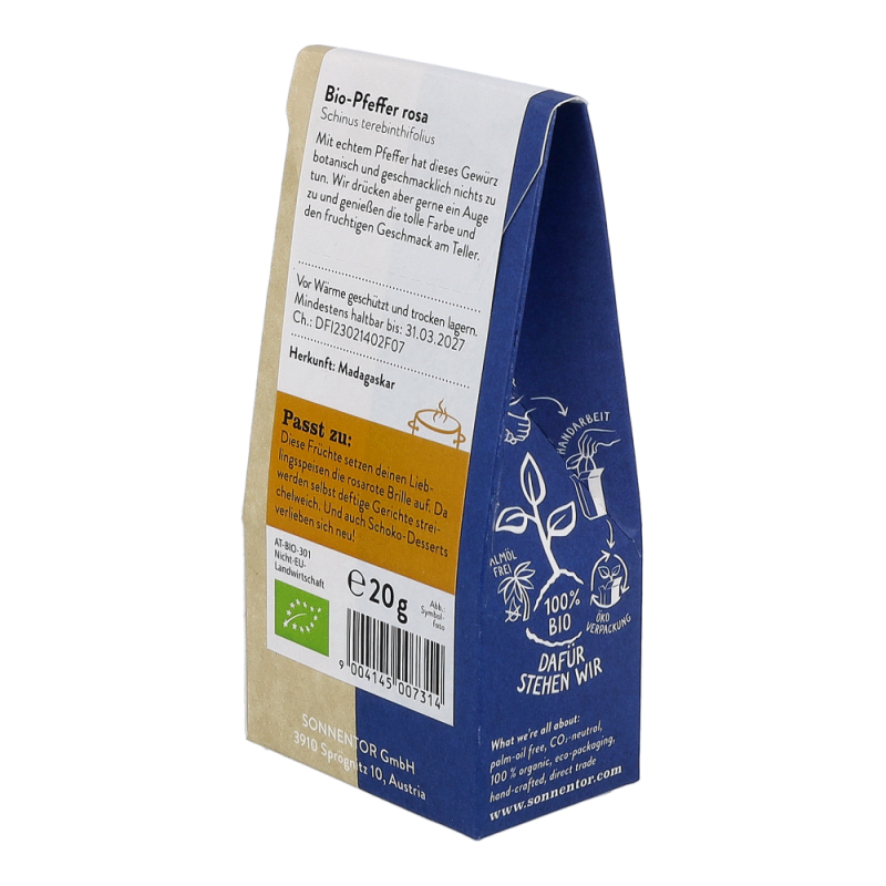 Der Sonnentor Rosa Pfeffer ganz in der 20 g Packung hat mit echtem Pfeffer nicht viel am Hut: Es sind die Beeren des Schinus-Baums, der zur Familie der Sumachgewächse gehört. Die Beeren schmecken herrlich fruchtig, leicht süßlich und sind mild pfeffrig im Abgang. Geschmacklich erinnern sie leicht an Wacholderbeeren. Daher passt Rosa Pfeffer hervorragend zu mild gewürzten Gerichten wie Fisch, Spargel und anderem Gemüse und kann ausgezeichnet zum Dekorieren eingesetzt werden.