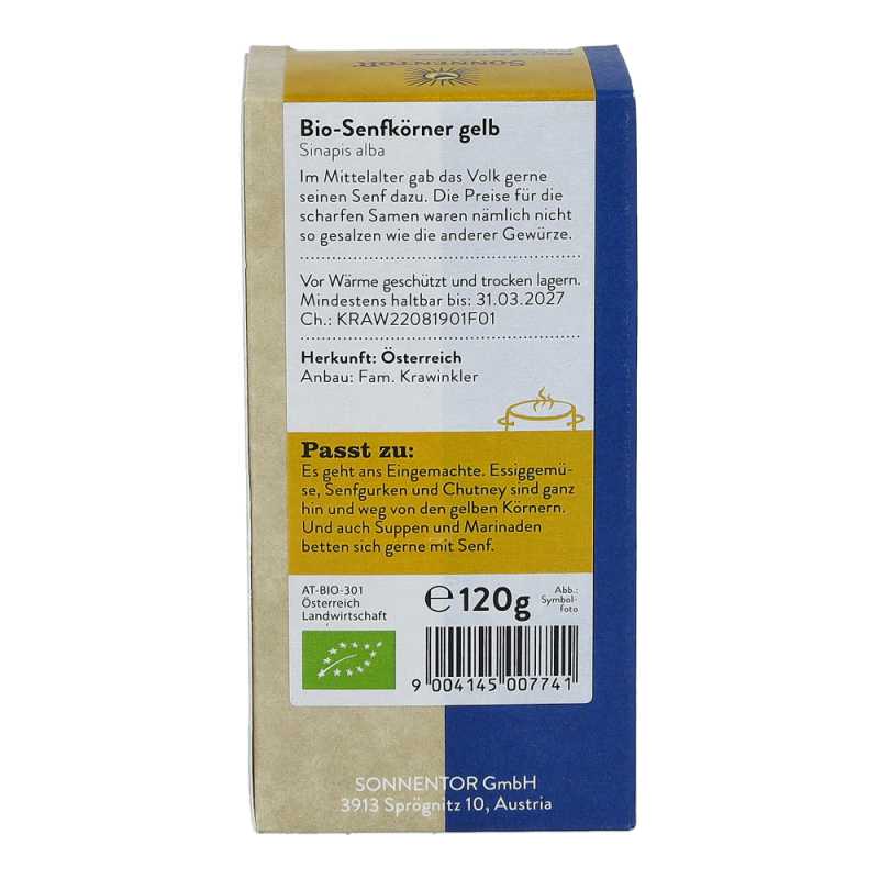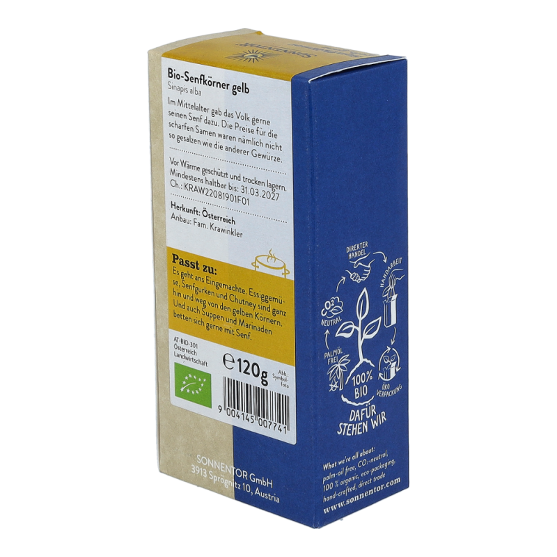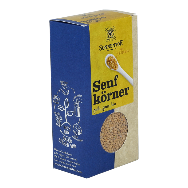 Die Sonnentor Senfkörner gelb in der 120 g Packung werden vor allem für Marinaden, zum Einlegen von Essiggemüse und zum Würzen von scharfen Saucen verwendet. Die scharfen Senföle werden erst durch den Kontakt mit Flüssigkeit freigesetzt und begeistern mit einem einzigartigen Aroma..