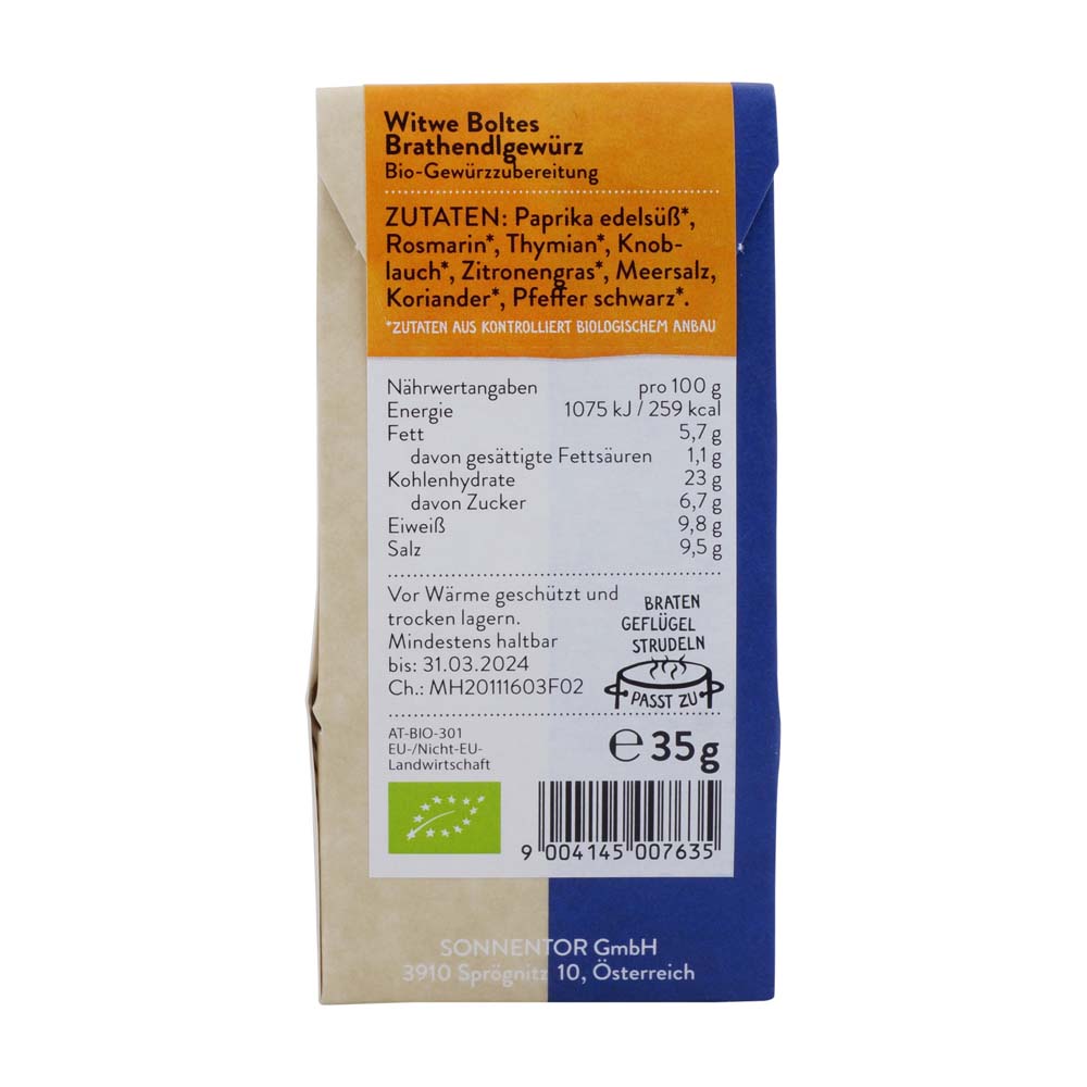 Der Inbegriff eines guten Brathendls ist die knusprige Haut und das saftige Fleisch. Witwe Boltes Brathendlgewürz ist eine Kompostion der besonderen Art – es kann eben nur Eine geben, die so eine einzigartige Verbindung zu ihrem Federvieh hatte. Neben den Klassikern Paprika und Knoblauch geben die zahlreichen Gewürze den Ton an. Rosmarin, Thymian und Koriander verleihen Witwe Boltes Brathendlgewürz einen runden Körper und Lemongras macht sie leicht und erfrischend. Witwe Bolte hätte das sicher gefallen. Auch in der Streudose und als Gastrodose erhältlich.