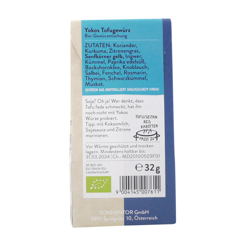Yokos Tofugewürz duftet frisch orientalisch und erinnert an Curry. Neben sinnlich-fernöstlichen Gewürznuancen und einer erfrischenden Komponente, dominiert der süße Mutterkümmel das Geschmackserlebnis.