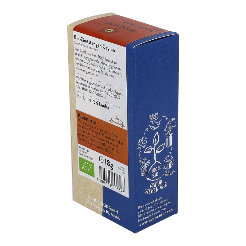 Sonnentor Zimt Ceylon Stangen im 18 g Päckchen schmecken etwas milder als der nahe Verwandte des Ceylon, der Cassia-Zimt. Der Geschmack von Zimt ist aus unseren Küchen nicht wegzudenken, das Gewürz passt zu Milchreis, in Kompotte und Kuchen, gehört aber auch in so manche pikante arabische, äthiopische und indische Gerichte.