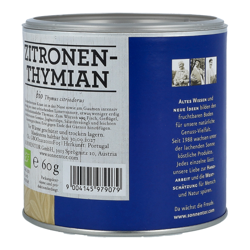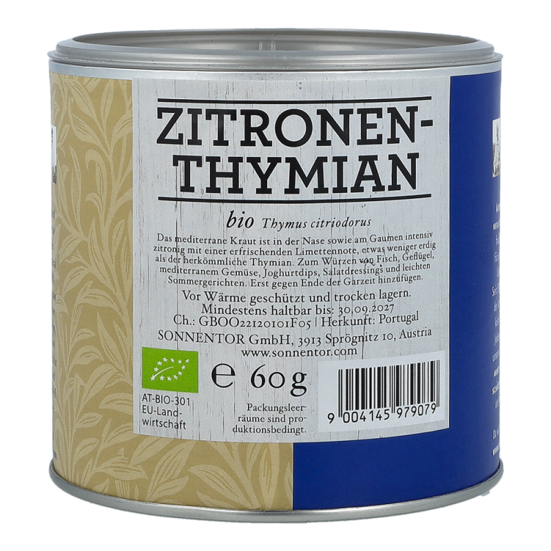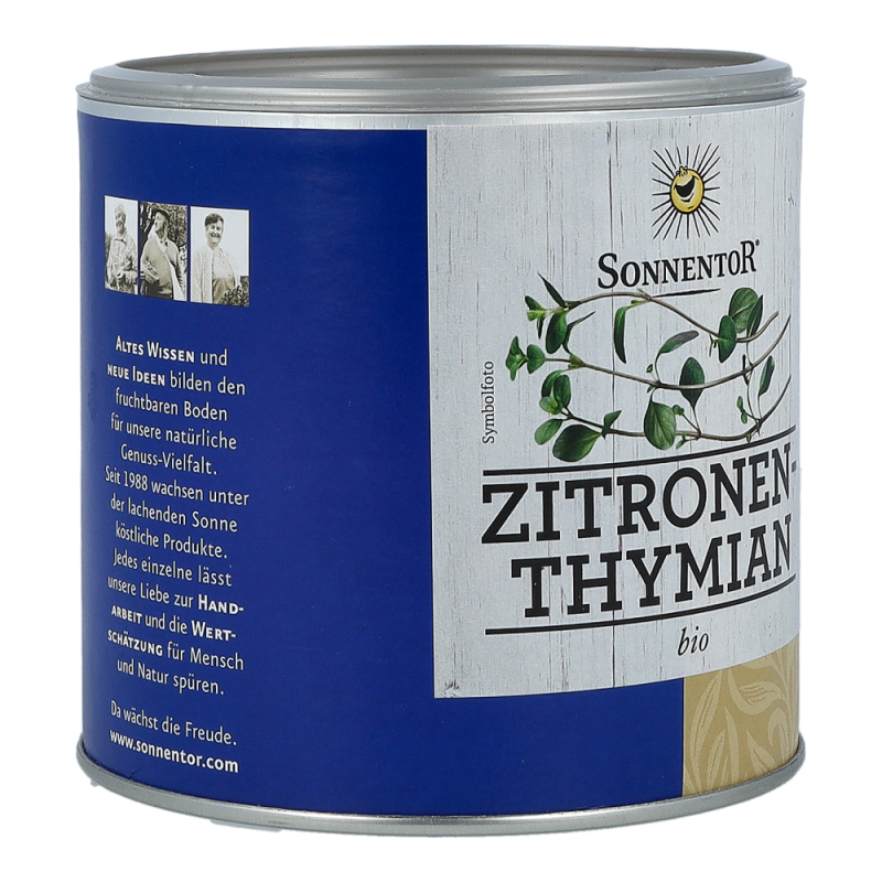 Der Sonnentor Zitronenthymian in der 60 g Gastrodose begeistert mit seinem erfrischend mediterranen und intensiven Geschmackt und zaubert Sie ganz schnell wieder zurück in Ihren letzten Urlaub am Mittelmeer. Zitronige, limettenähnliche Noten vereint mit dem Aroma des Thymians sind ein wahrlich eleganter Begleiter von Fisch, Geflügel, Gemüse und mediterranen Salatdressings. Zitronenthymian sollte erst gegen Ende der Garzeit hinzugefügt werden, denn seine Aromen verflüchtigen sich schnell