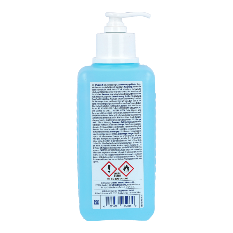 Ausreichend Händedesinfektionsmittel unverdünnt auf den trockenen Händen mind. 30 Sekunden einreiben. Nicht mit Wasser nachspülen.