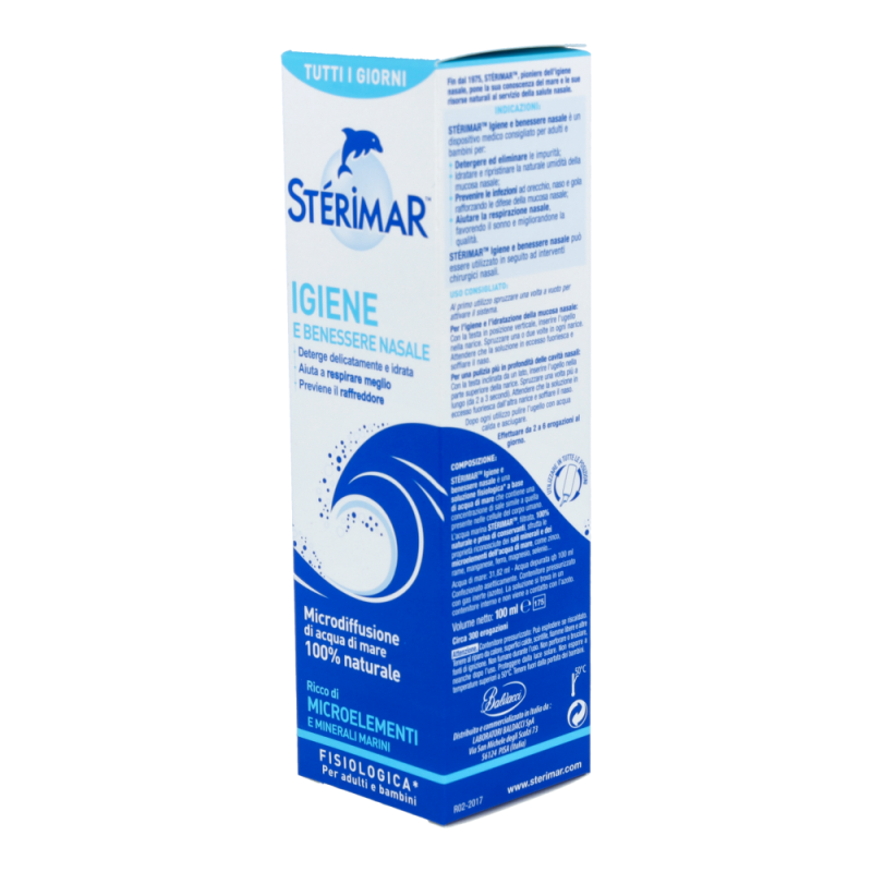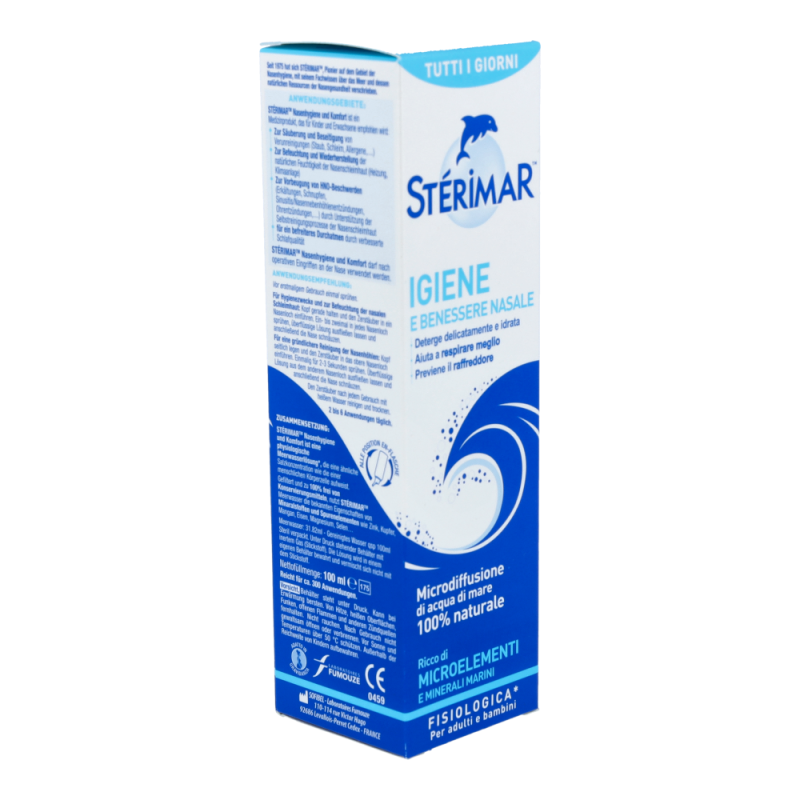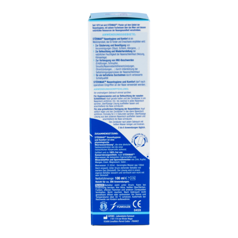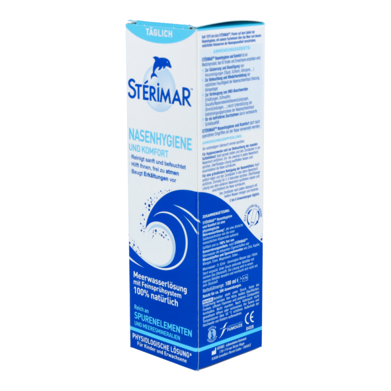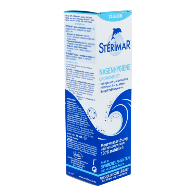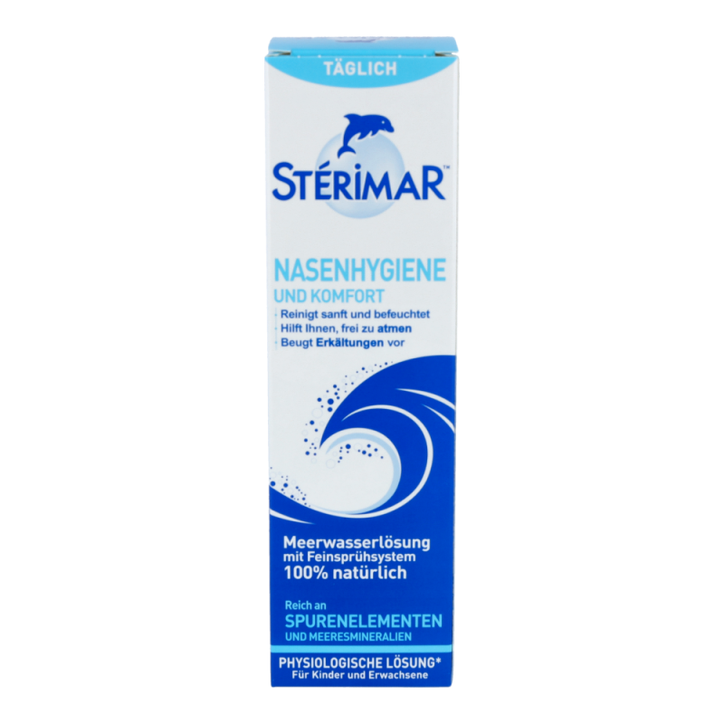 Sterimar Meerwasser Nasenspray ist ein Medizinprodukt für die tägliche Nasenhygiene und eignet sich sowohl für Erwachsene, als auch für Kinder. Die Nasenschleimhaut wird befeuchtet und gereinigt und der Selbstreinigungsprozesses wird angeregt.