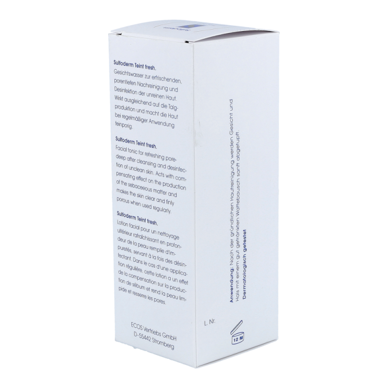 Sulfoderm S Teint Gesichtswasser Fresh ist ein porentief reinigendes und desinfizierendes Gesichtswasser, welches ausgleichend auf die übermäßige Talgproduktion der Haut wirkt.