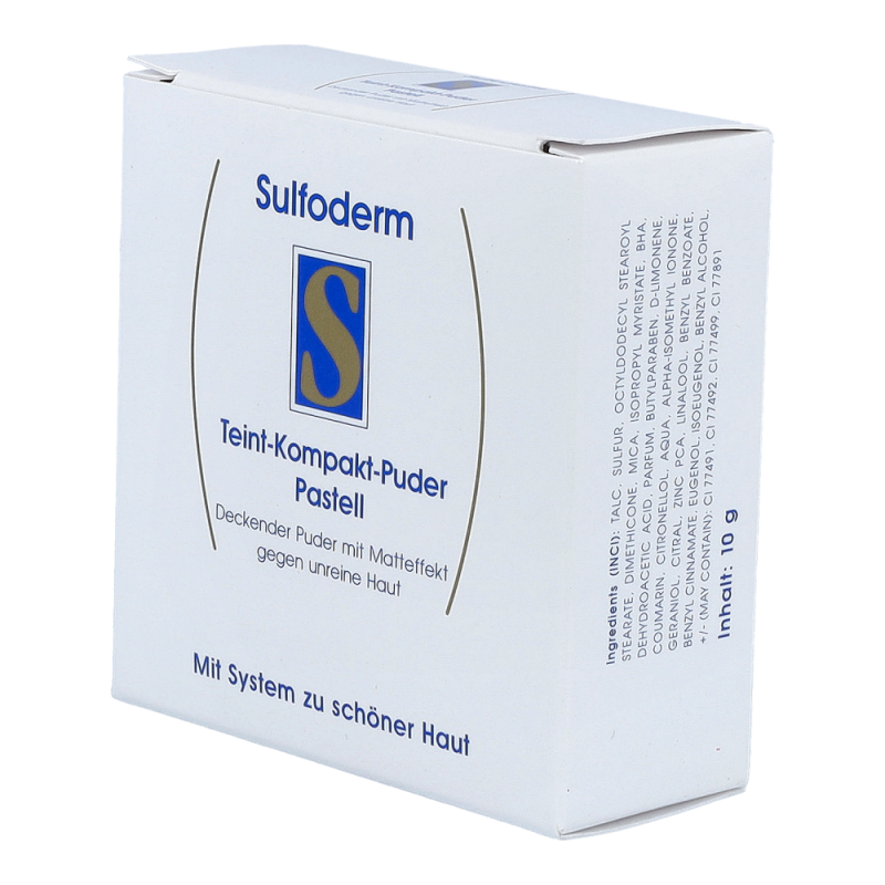 Sulfoderm S Teint Puder Pastell wirkt dank seiner Inhaltsstoffe antibakteriell, entzündungshemmend und beruhigend. Das Kompaktpuder eignet sich bestens zur Anwendung als leicht deckendes Makeup in einem mittleren Farbton.