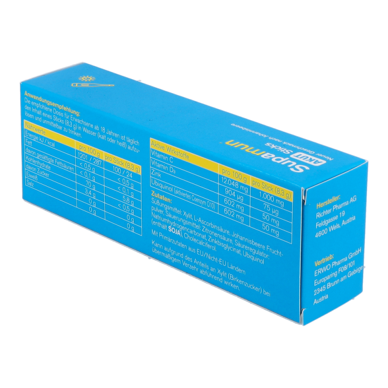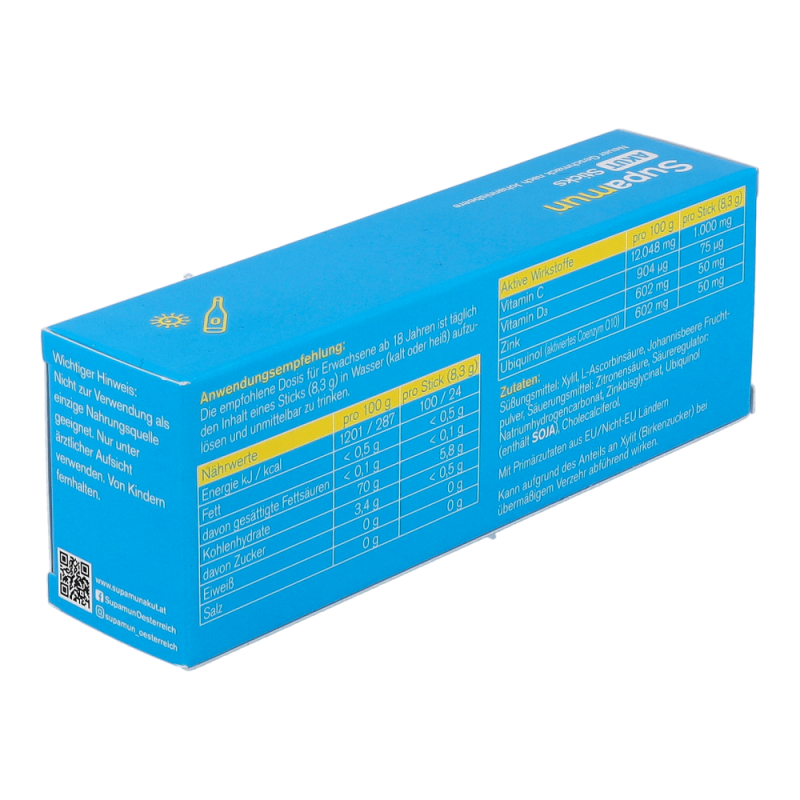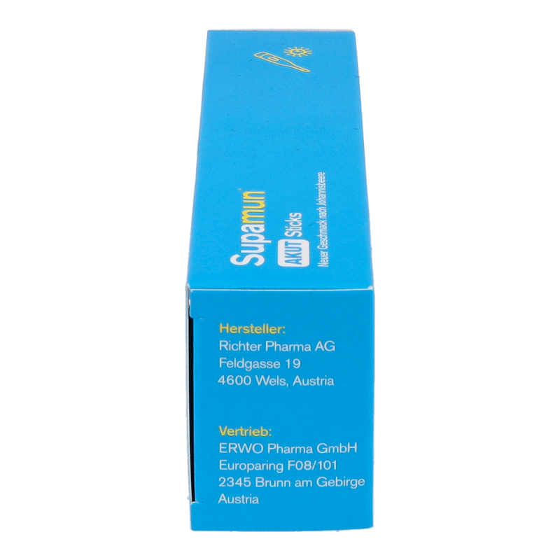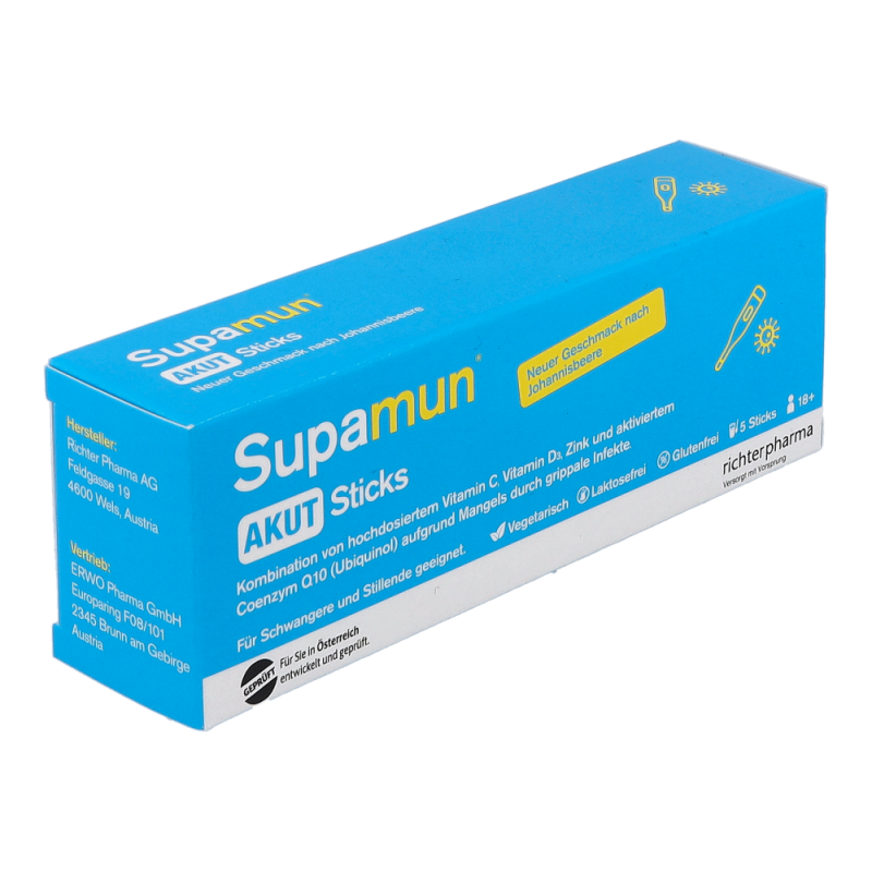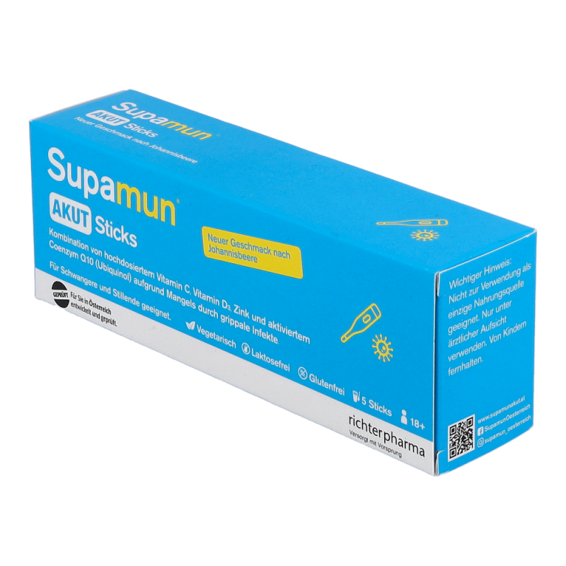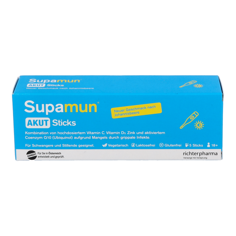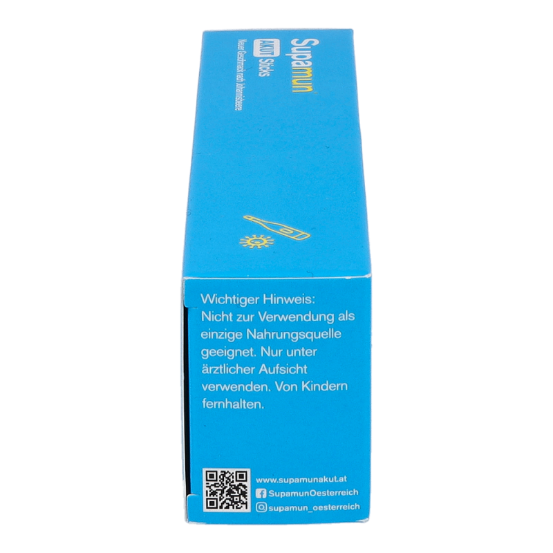 Supamun AKUT Sticks ist ein Lebensmittel für besondere medizinische Zwecke (Bilanzierte Diäten). Für Kinder oder Jugendliche ist Supamun® AKUT Sticks nicht geeignet. Die Einnahme von Supamun® AKUT Sticks während der Schwangerschaft und Stillzeit ist möglich. Zum Diätmanagement bei grippalen Infekten.
