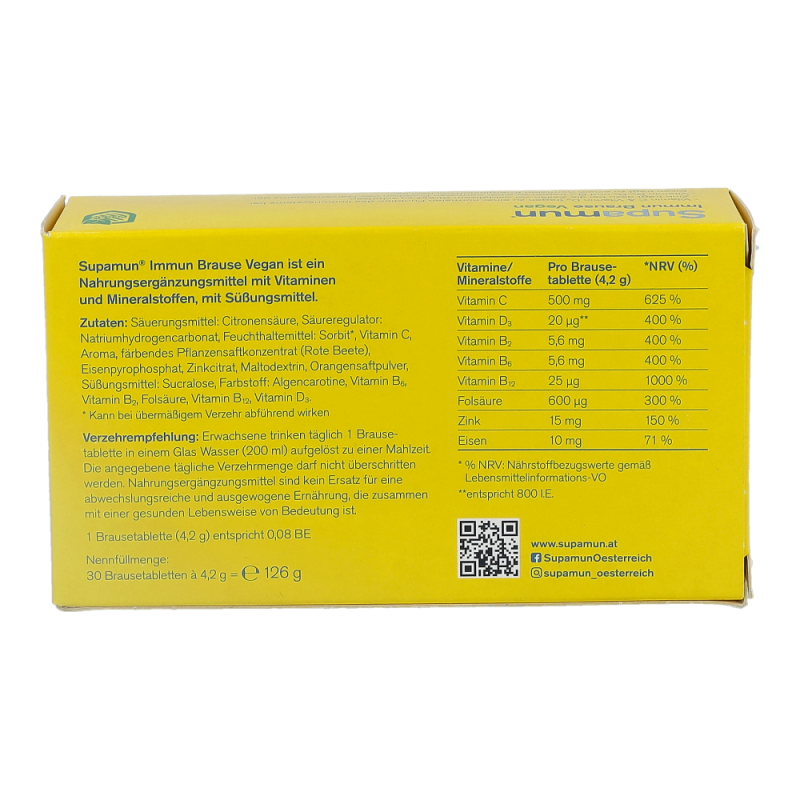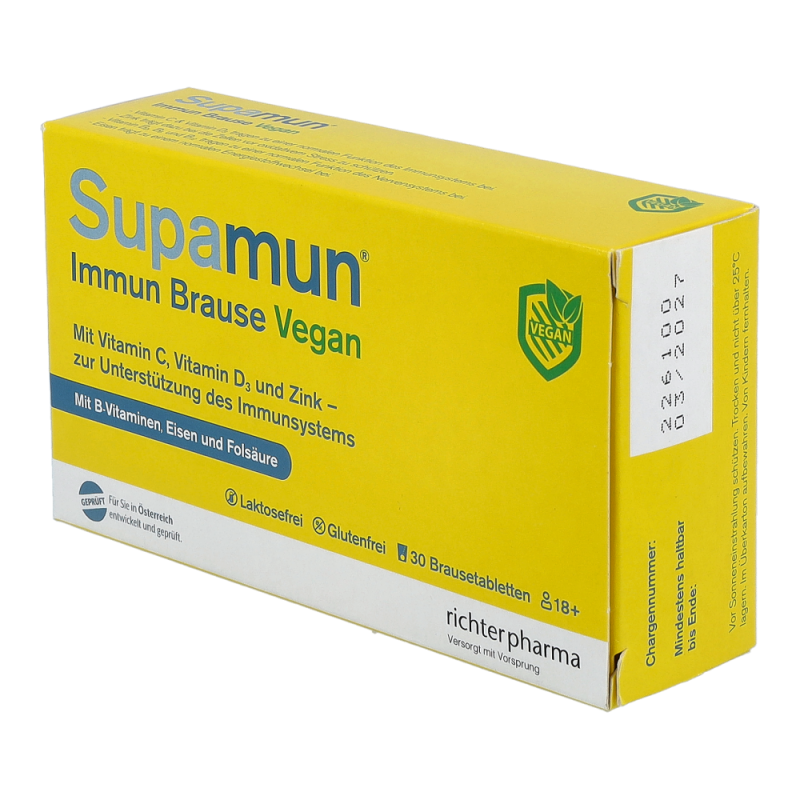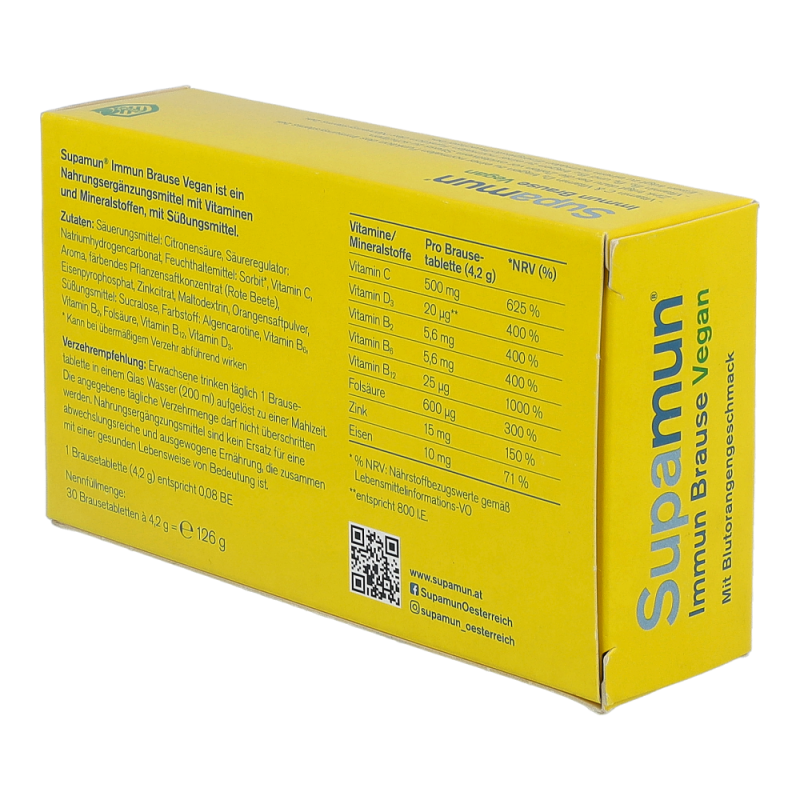 Supamun® Immun Brause ist ein Nahrungsergänzungsmittel in Brauseform mit Blutorangengeschmack. Es enthält veganes Vitamin D3, B-Vitamine, Folsäure und Eisen – speziell für die vegetarische und vegane Lebensweise..
