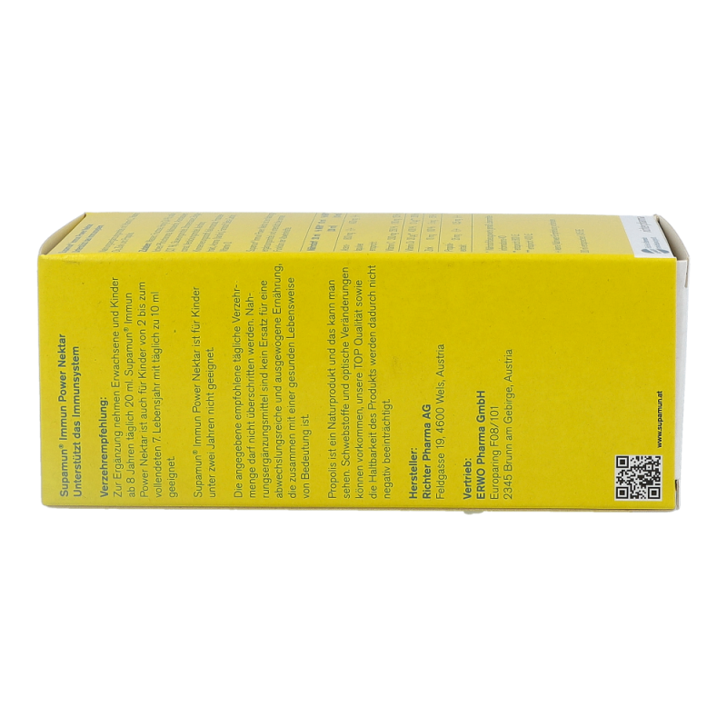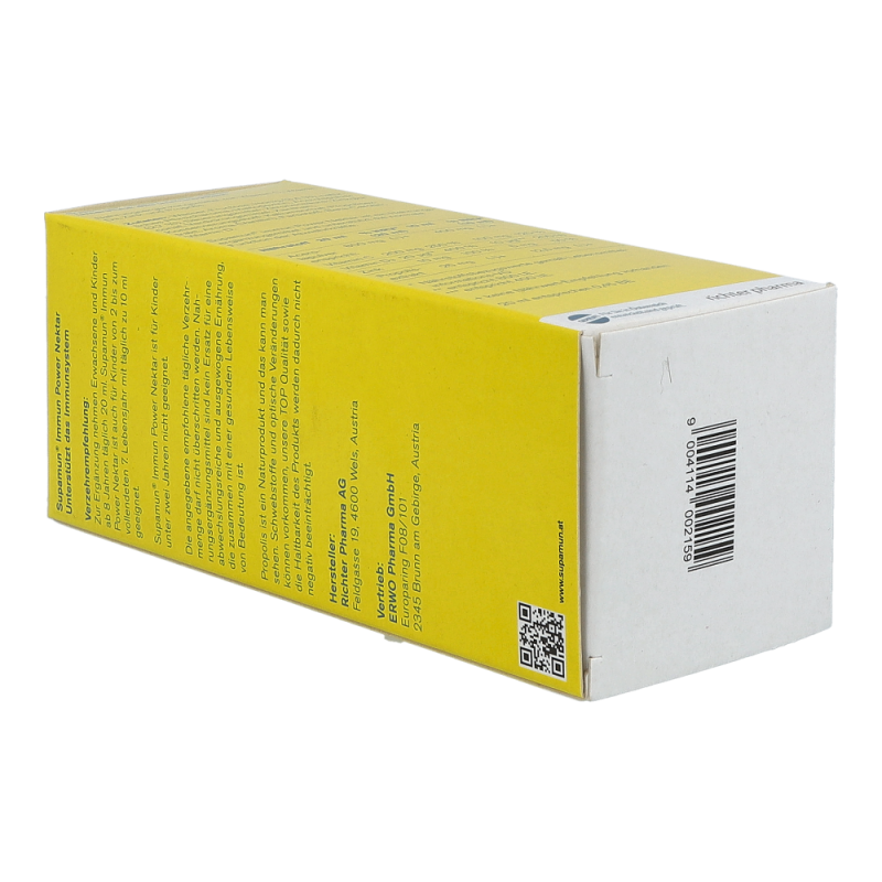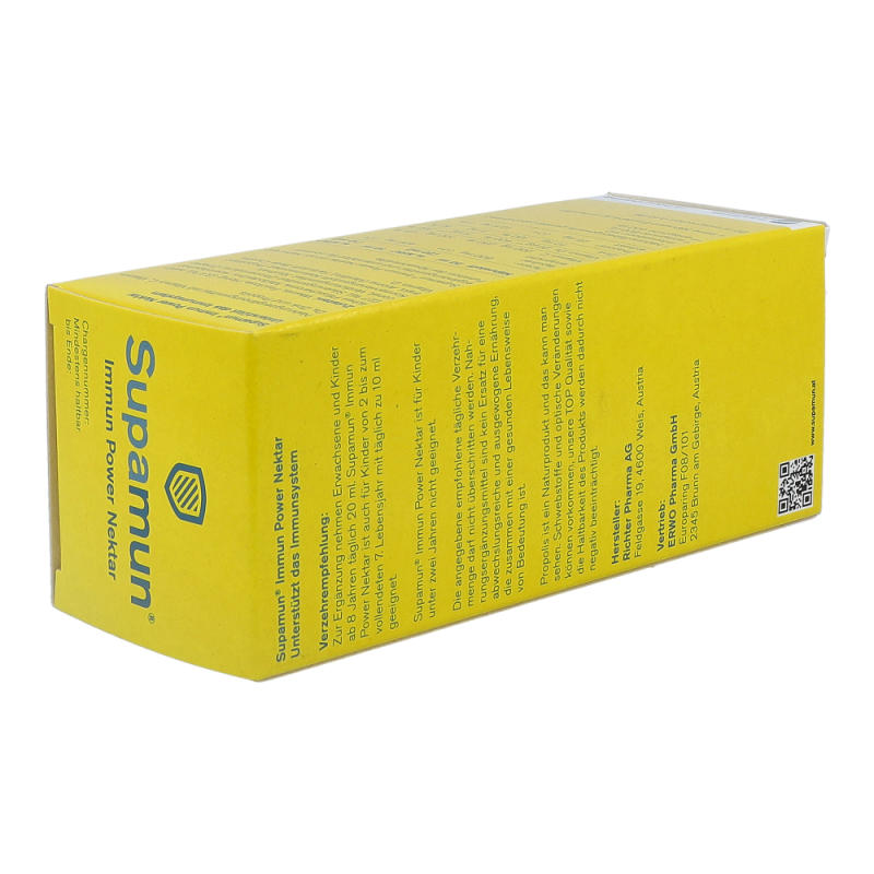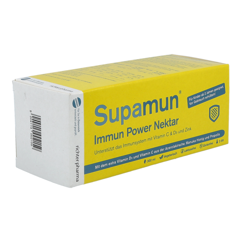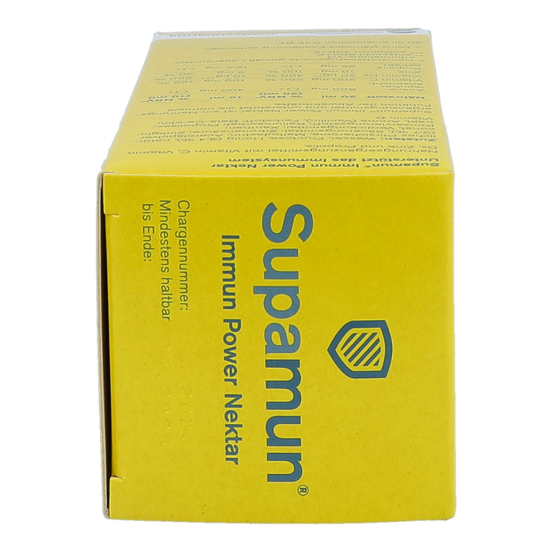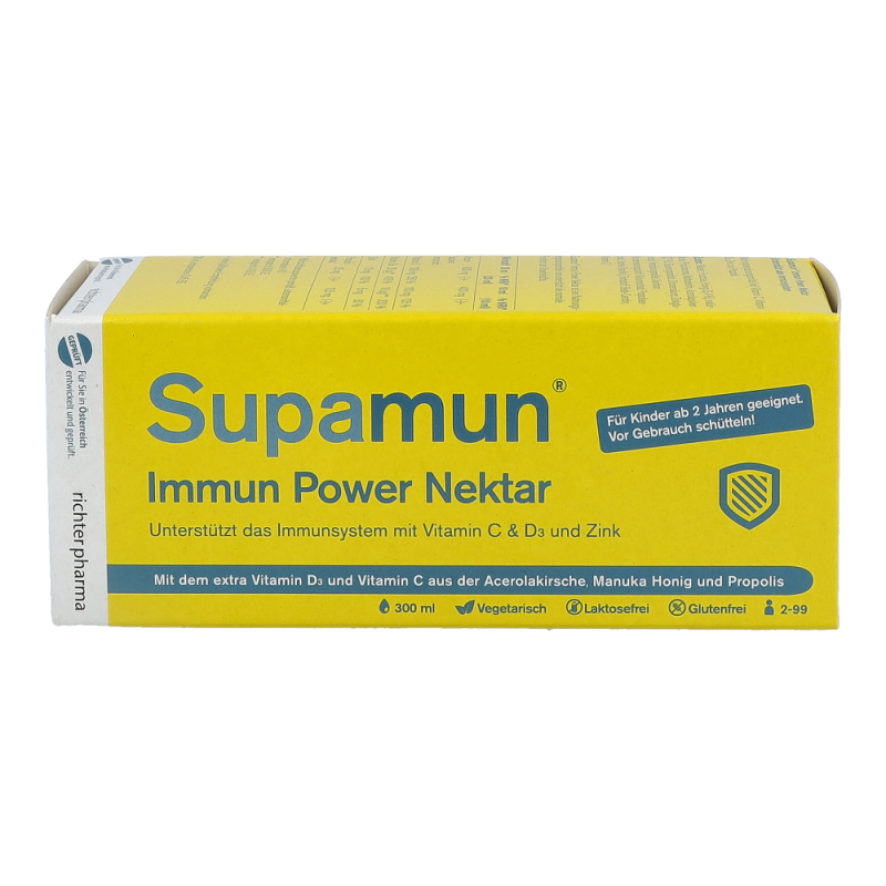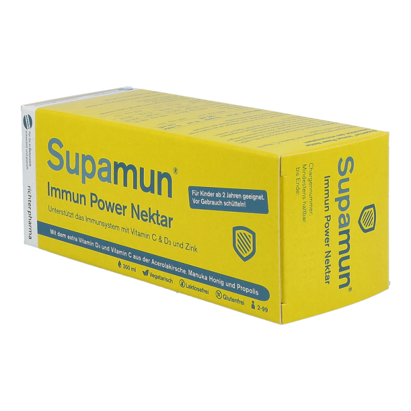 Durch Stress und körperlicher Anstrengung ist unser Organismus vielen Belastungen ausgesetzt. Um diesen Belastungen standhalten zu können, ist es wichtig, ausreichend mit Vitaminen und Spurenelementen versorgt zu werden. Supamun® Power Nektar, nur einmal täglich eingenommen, kann durch die ausgewogene Dosierung von Vitamin C (gewonnen aus der Acerola Kirsche) und D3 sowie dem Spurenelement Zink zur normalen Funktion des Immunsystems beitragen. Außerdem enthält Supamun® Power Nektar Manuka Honig und Propolis