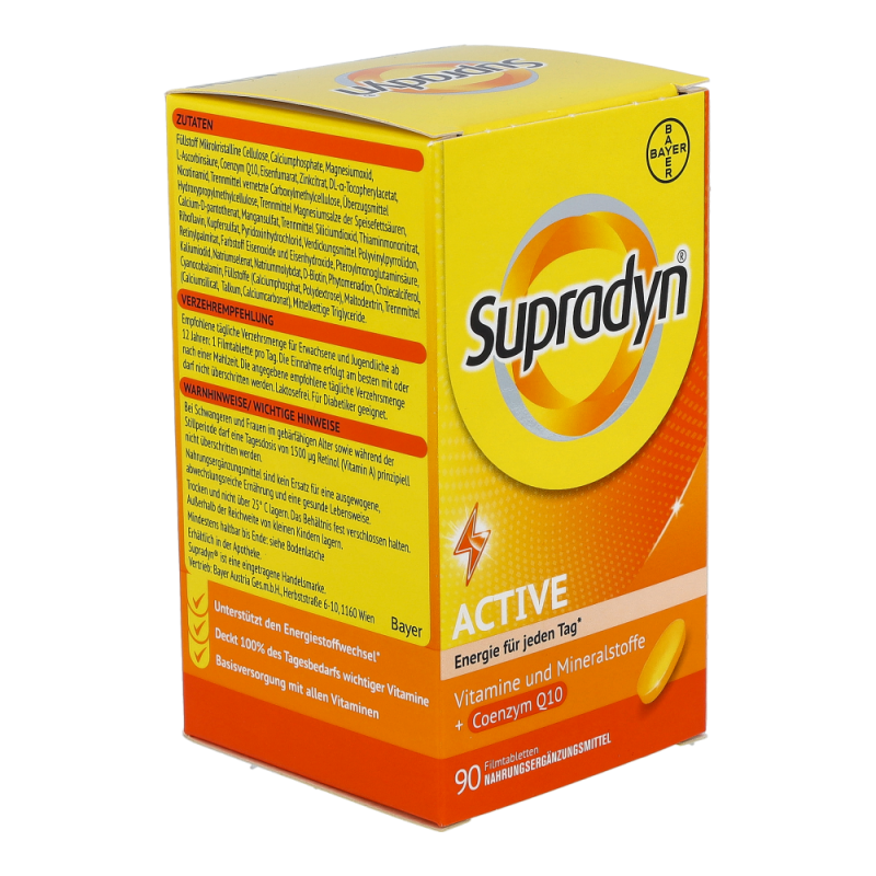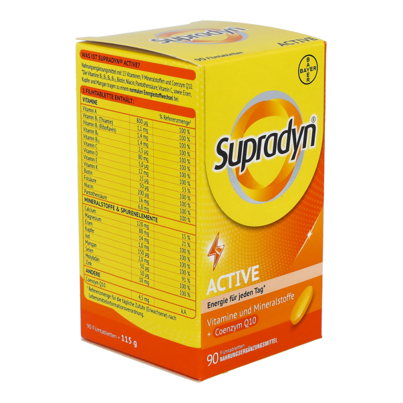 Supradyn® active aktiviert die natürliche Energie. Die spezielle Formulierung mit zahlreichen Vitaminen und Mineralstoffe hilft, das körpereigene Energiepotential besser freizusetzen. Die Vitamine C und E sowie Selen & und Zink schützen die Zellen vor oxidativem Stress durch freie Radikale.