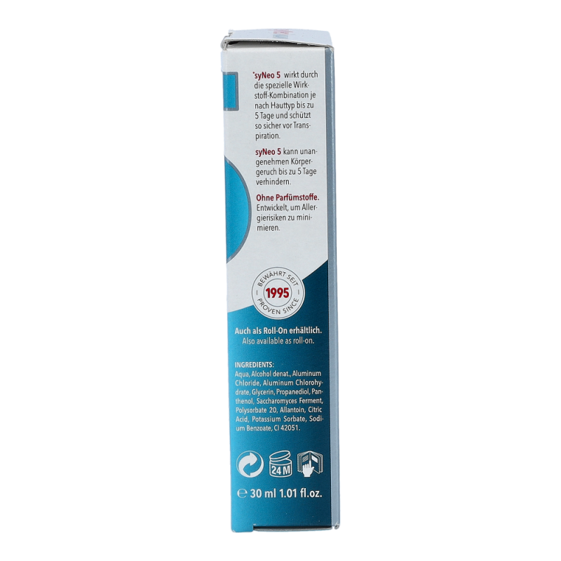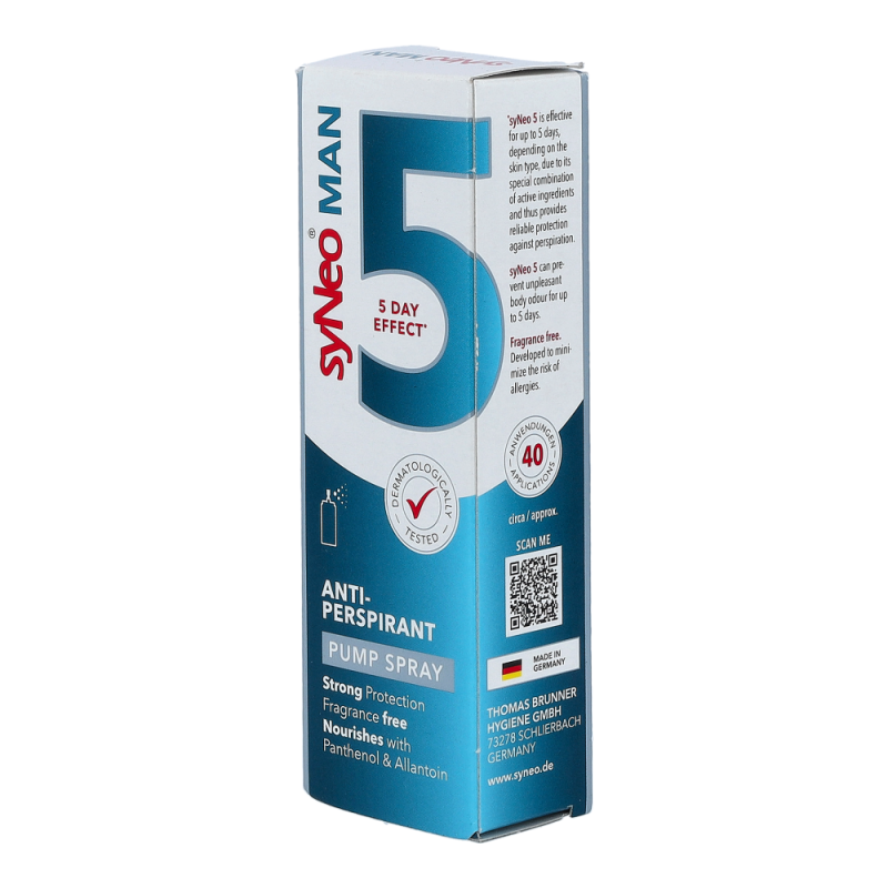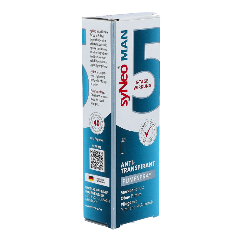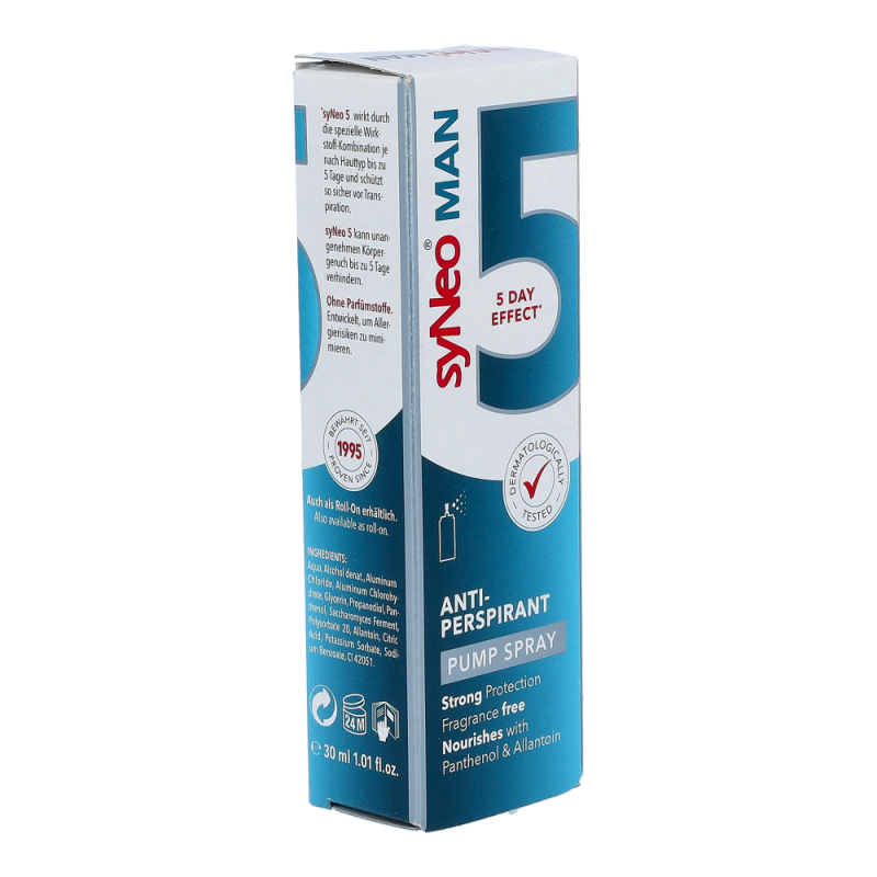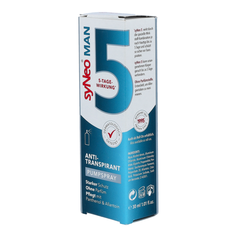 Syneo 5 Man Deo Pumpspray wird zur Reduzierung des Schweißgeruchs bei Männern angewendet. Das enthaltene Aluminiumchlorid bildet mit Proteinen auf der Haut eine Verbindung, welche die Schweißdrüsen verschließt. Durch Anwendung dieses Produktes wird außerdem die Vermehrung von Hautbakterien gehemmt.