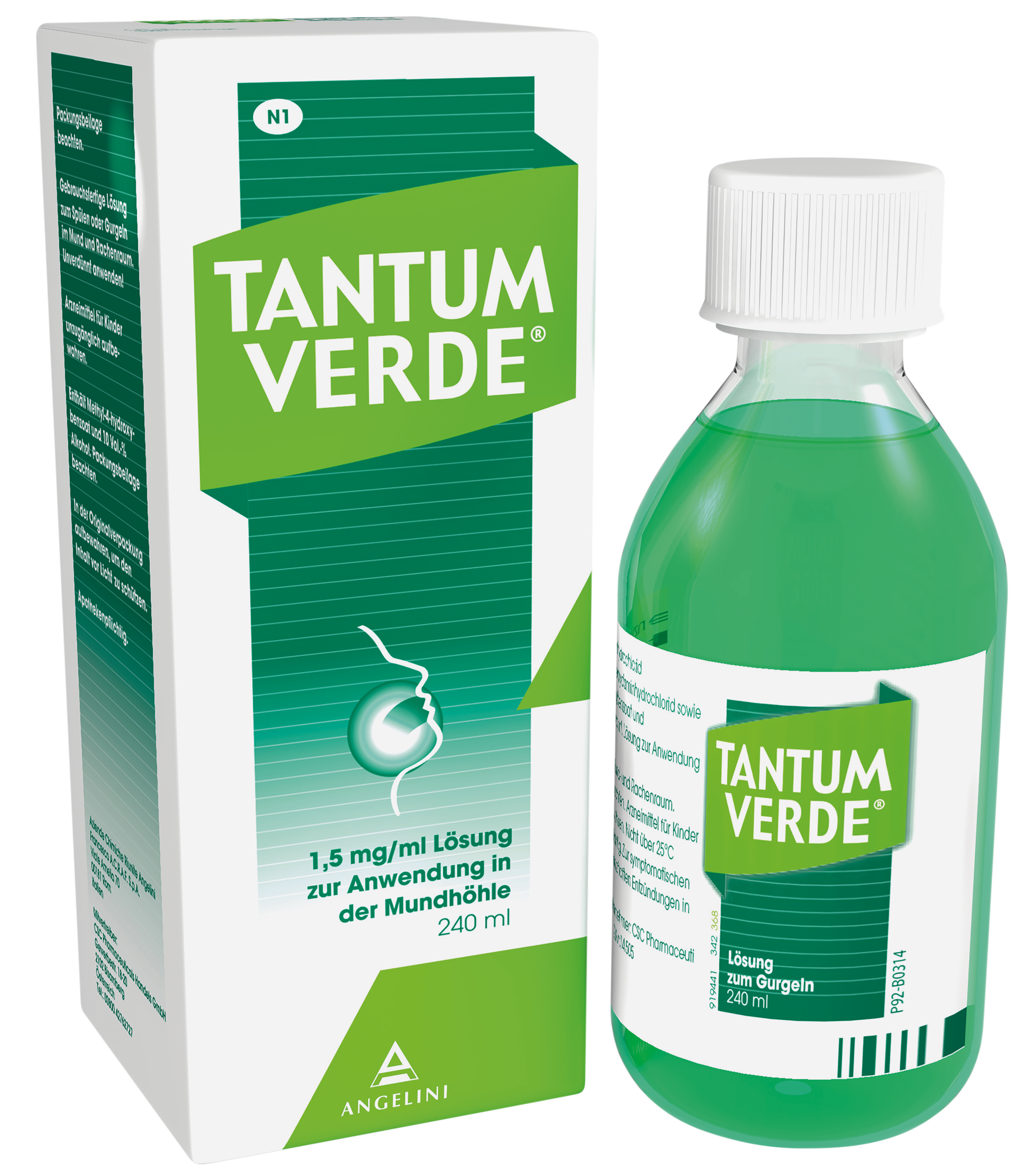 Der Wirkstoff Benzydamin besitzt entzündungshemmende und schmerzlindernde Eigenschaften. Auf Grund der raschen Aufnahme und der lokalen Anreicherung in entzündeten Geweben kommt es zu einem baldigen Nachlassen der Beschwerden. Tantum Verde – Lösung zum Gurgeln ist lokal gut verträglich und bewirkt eine gezielte Therapie der Entzündugssymptome und Schluckbeschwerden.