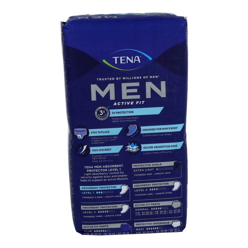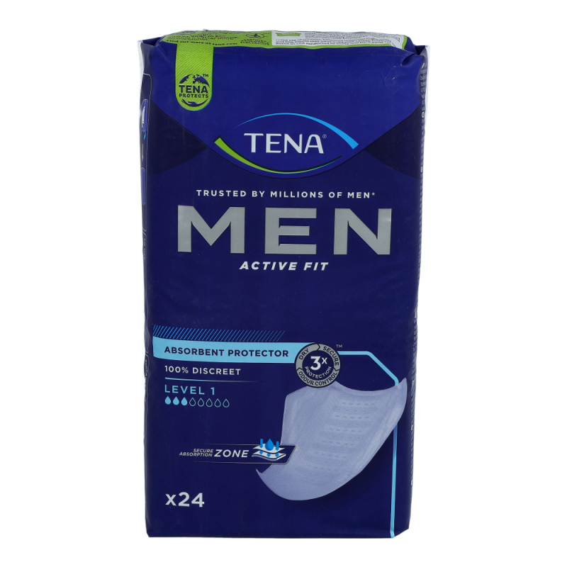 TENA Men – speziell für Männer entwickelte Einlagen, für leichte bis mittlere Blasenschwäche. Überzeugen Sie sich von den speziell an die männliche Anatomie angepassten TENA Men Produkten. Dank ihrer Passform und des speziellen Geruchsschutzes ist TENA Men ganz besonderes diskret.Perfekter Sitz durch die speziell auf die männliche Anatomie abgestimmte Schalenform. Länger trocken, länger sicher durch doppeltem Saugkern: Schnellere Aufnahme der Flüssigkeit, höhere Trockenheit durch weniger Rücknässung. Das Plus an Diskretion durch den Geruchsbinder Odour Control™, der Gerüche verhindert, bevor sie entstehen. Hautfreundlich dank der atmungsaktiven Rückseite. Ideal, auch für unterwegs durch die hygienische Einzelverpackung. Optimaler Sitz, sichere Fixierung durch den extra-breiten Klebestreifen.