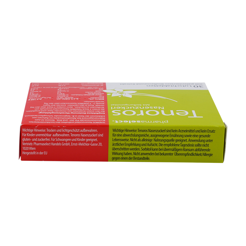 Tenoros Nasenzuckerl sind kein Arzneimittel und kein Ersatz für eine abwechslungsreiche, ausgewogene Ernährung sowie eine gesunde Lebensweise. Nicht als alleinige Nahrungsquelle geeignet. Anwendung unter ärztlicher Empfehlung und Aufsicht. Die empfohlene Tagesdosis sollte nicht überschritten werden. Sorbitol kann bei übermäßigem Konsum abführende Wirkung haben. Nicht anwenden bei bekannter Überempfindlichkeit/Allergie gegen einen der Bestandteile. Trocken, lichtgeschützt und für Kinder unerreichbar aufbewahren.