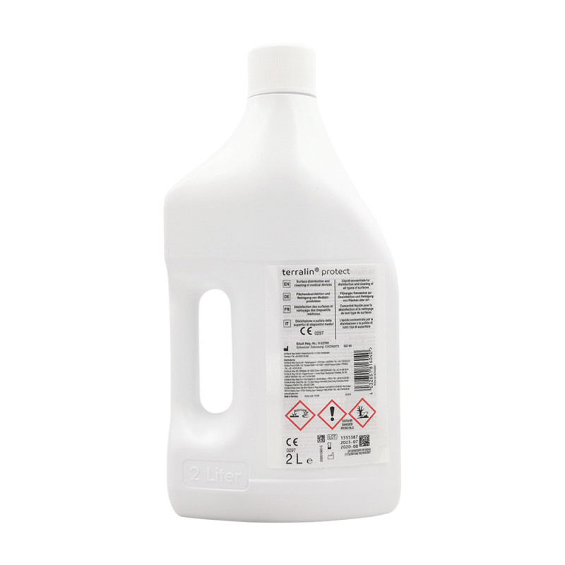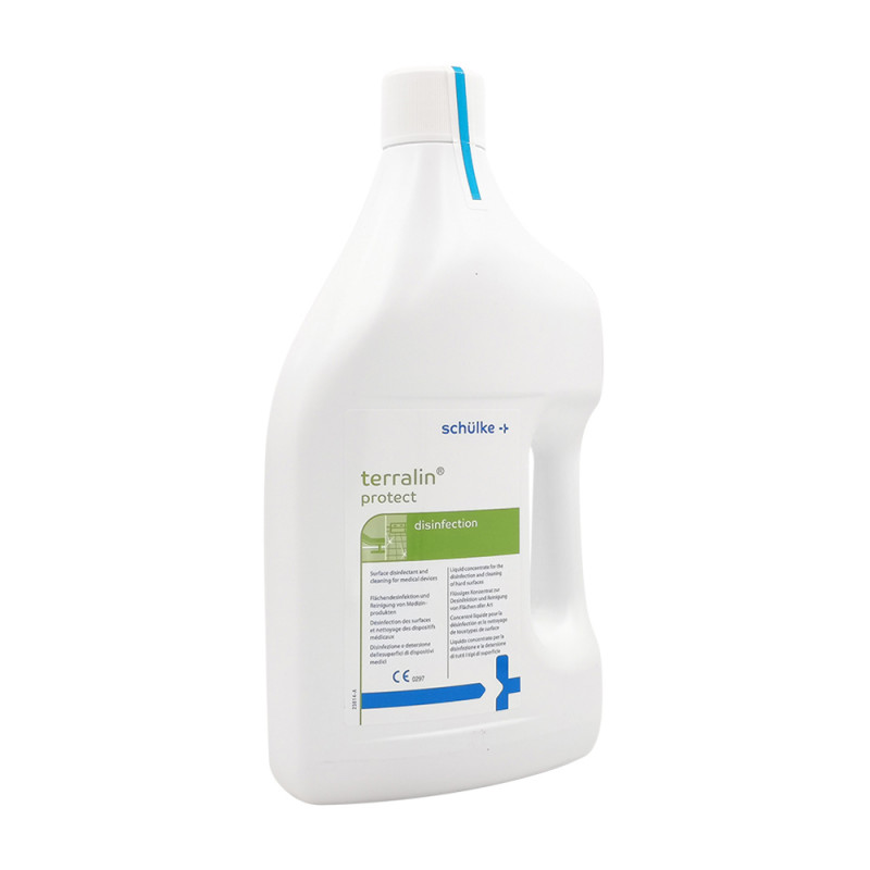 terralin protect ist ein flüssiges Konzentrat zur Desinfektion und Reinigung auf Basis einer Kombination aus aromatischen Alkoholen, quaternären Ammoniumverbindungen, amphoteren Glycinderivaten und nichtionischen Tensiden.