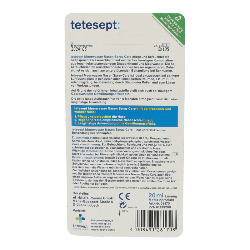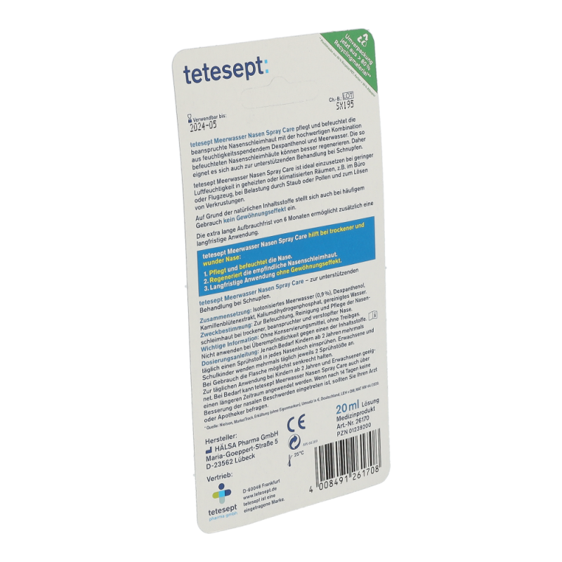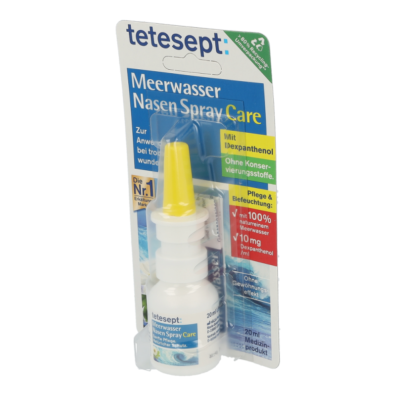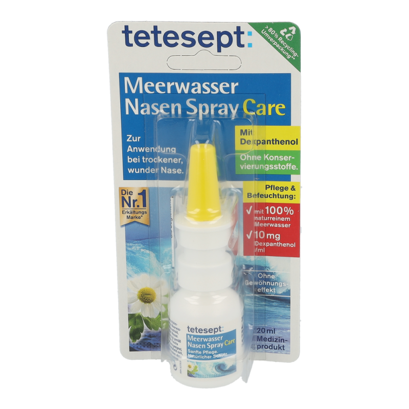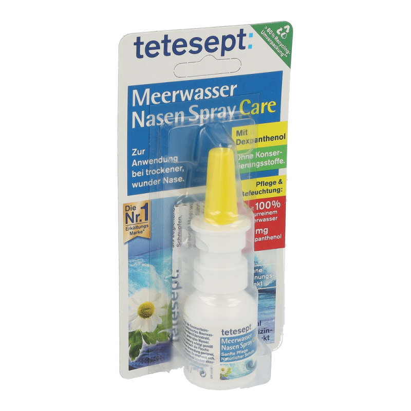 Tetesept Meerwasser Nasenspray Care pflegt und befeuchtet die beanspruchte Nasenschleimhaut mit der hochwertigen Kombination aus feuchtigkeitsspendendem Dexpanthenol und Meerwasser, um ihre Regeneration zu begünstigen. Das Spray ist ideal einzusetzen bei geringer Luftfeuchtigkeit in geheizten oder klimatisierten Räumen, z. B. im Büro oder Flugzeug, bei Belastung durch Staub oder Pollen und zum Lösen von Verkrustungen.