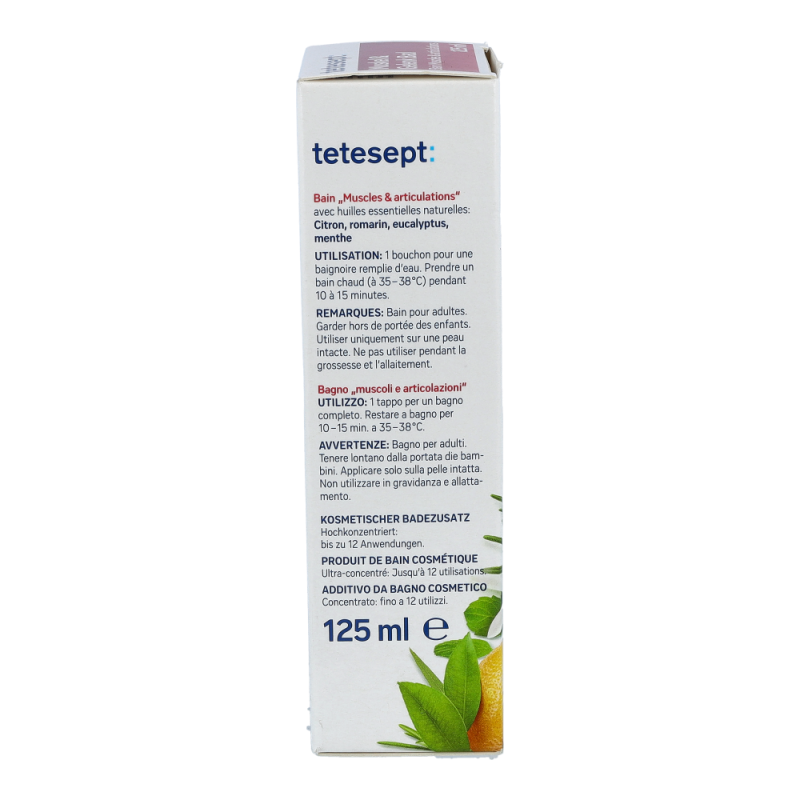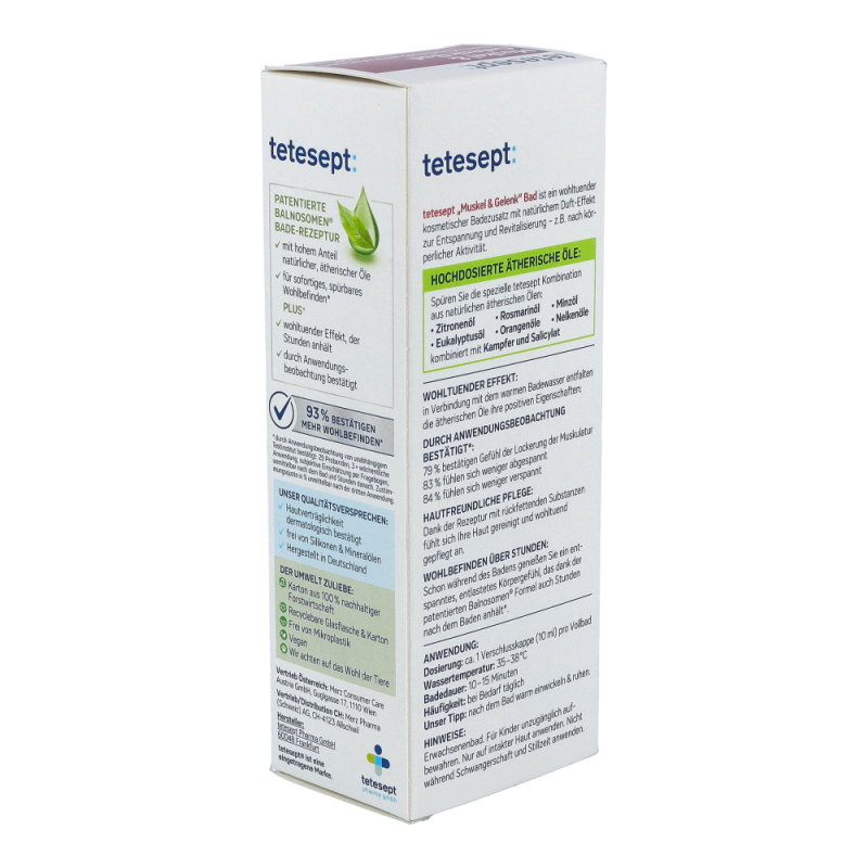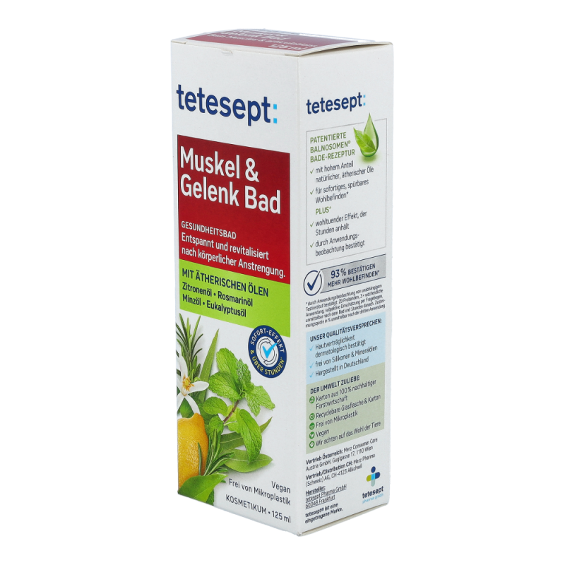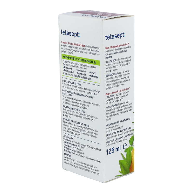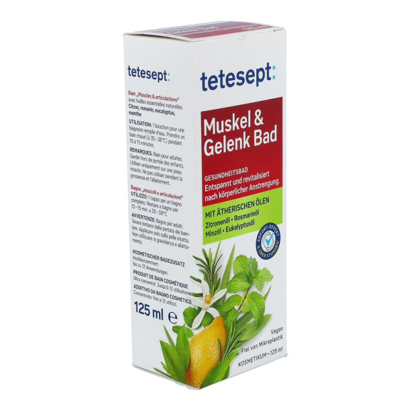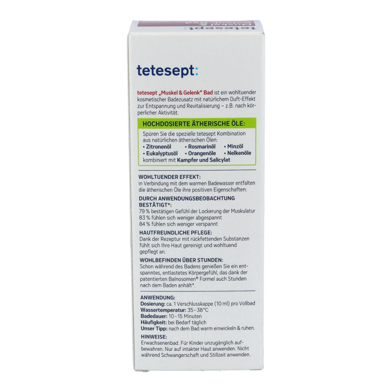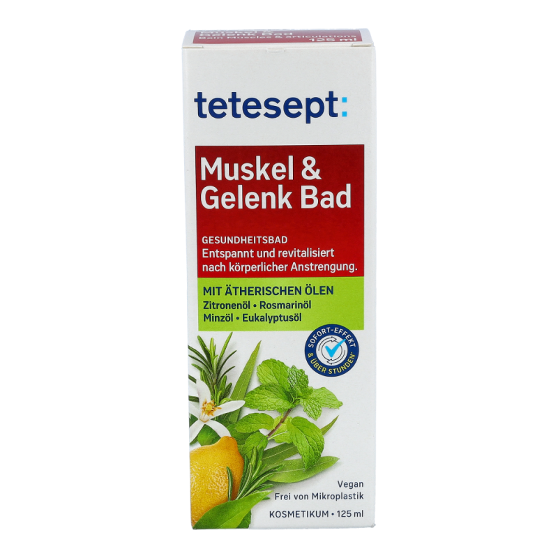 Tetesept Muskel & Gelenk Bad ist besonders wirksam bei Muskelkater und entspannt das Badekonzentrat Ihre Gelenke. Mit Zitronenöl, Minze, Rosmarin, Kampfer und Eukalyptusöl hat das Gesundheitsbad eine Wirkstoffzusammensetzung, die die Durchblutung fördert und Verspannungen löst.
