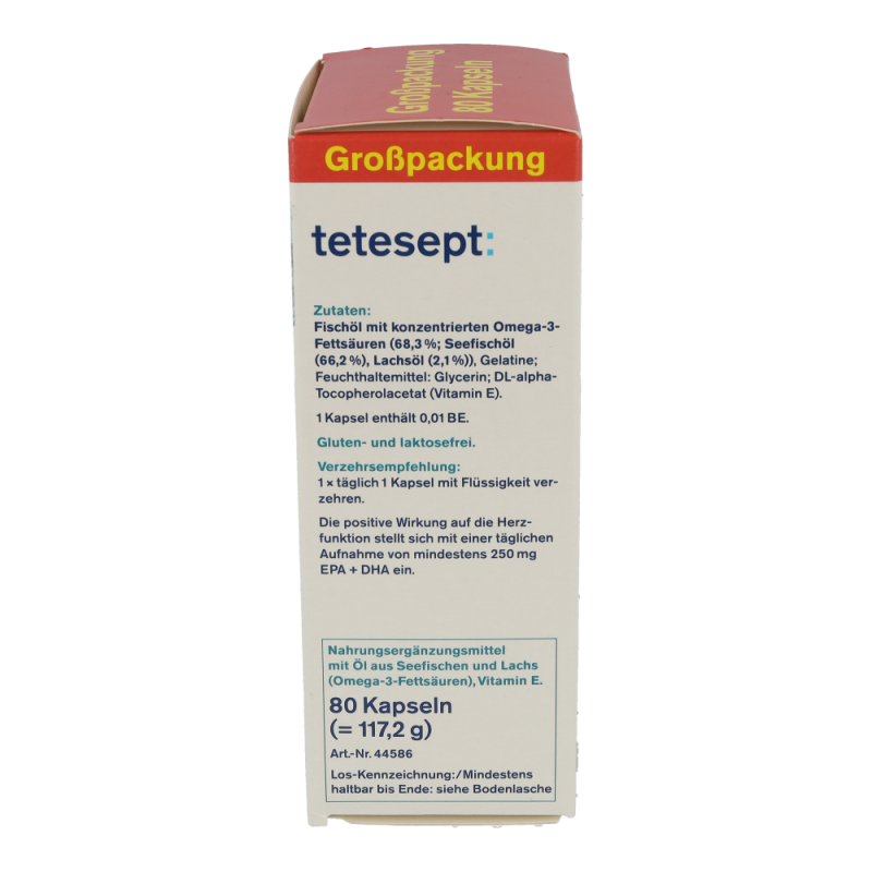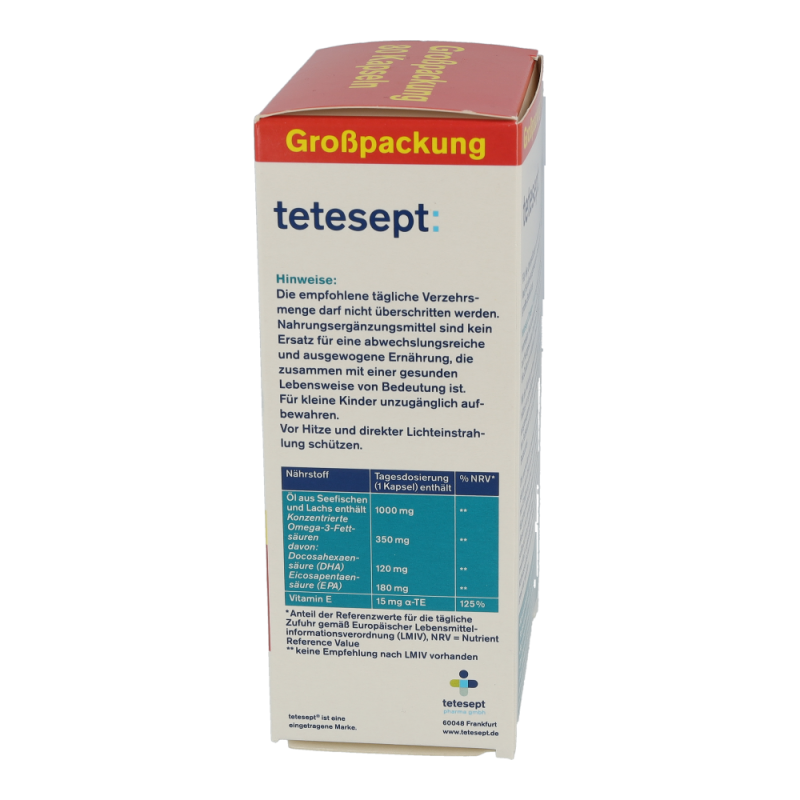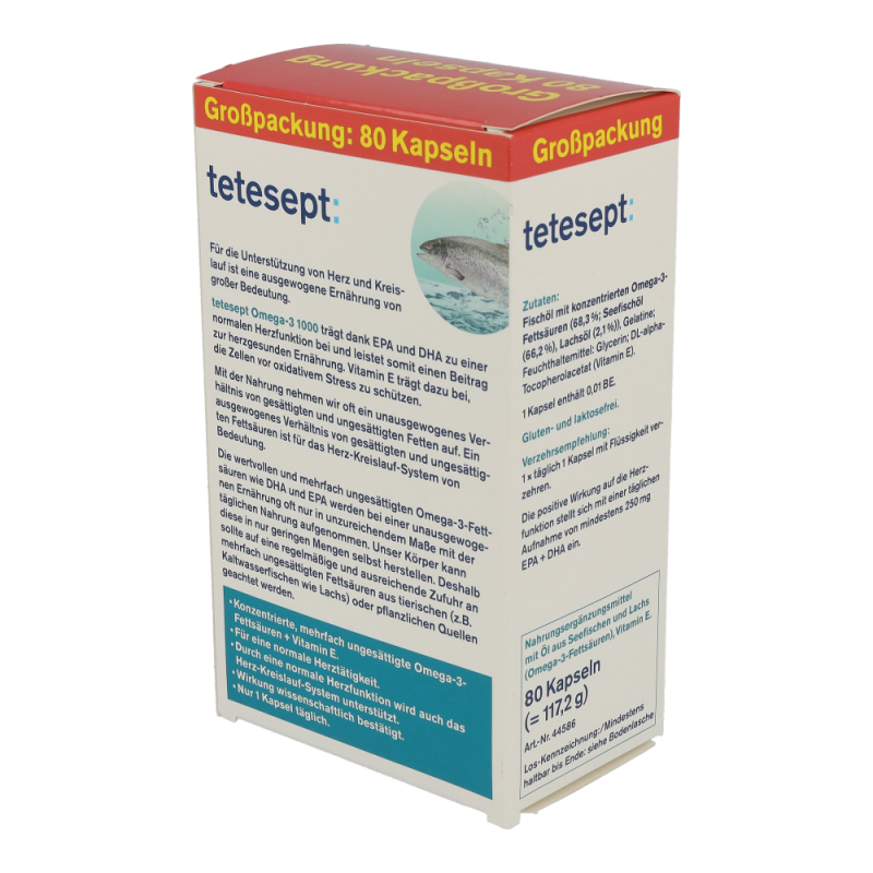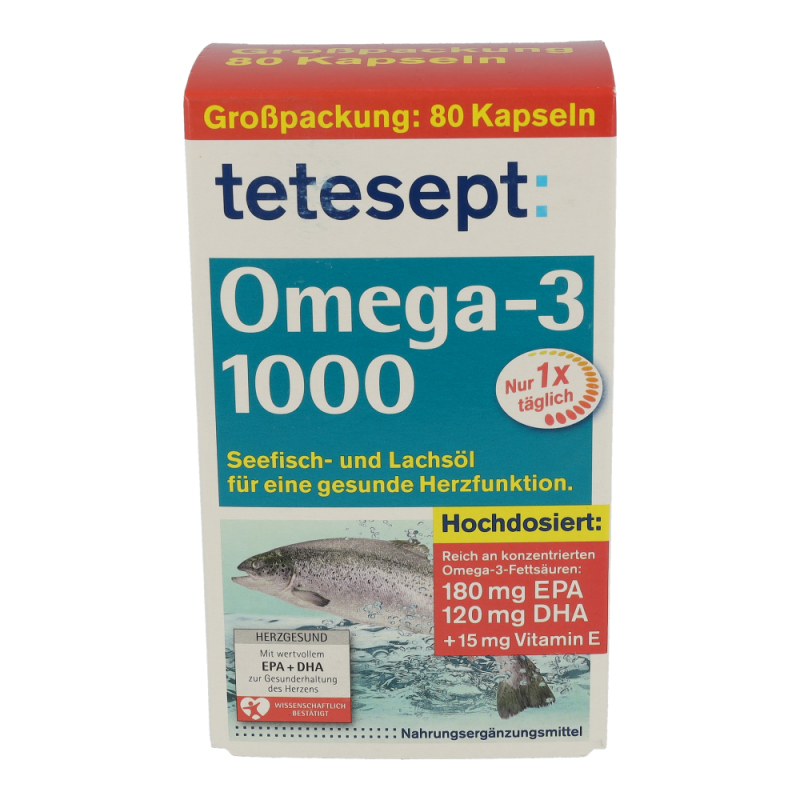Tetesept Omega-3 1000 Kapseln dienen einer herzgesunden Ernährung. Das enthaltene Vitamin E unterstützt den Abbau freier Radikale und hilft dadurch Gefäße und Zellen gesund zu erhalten.