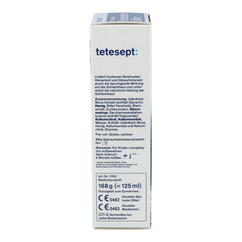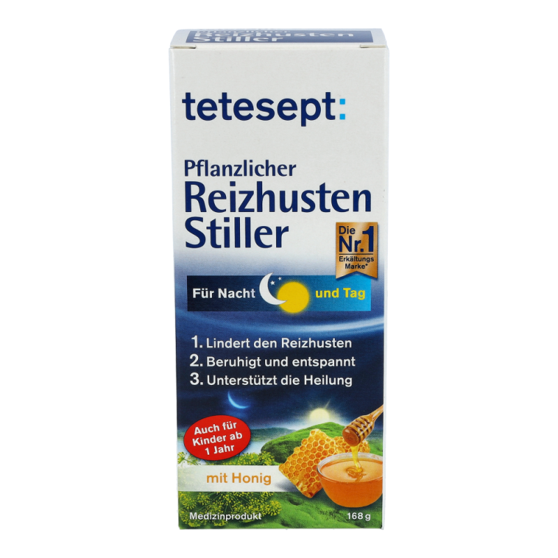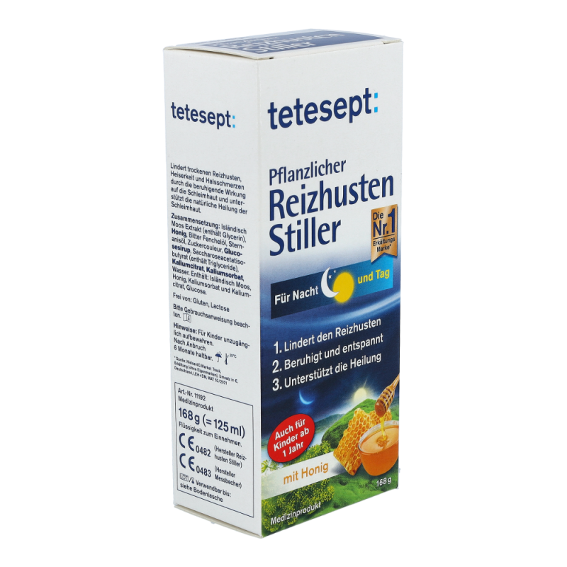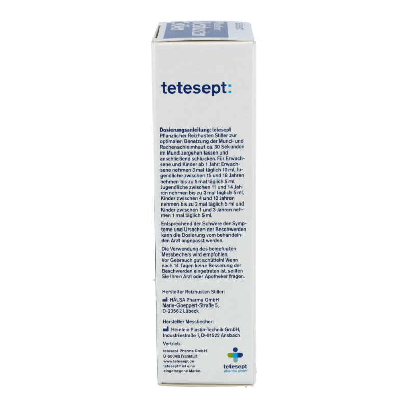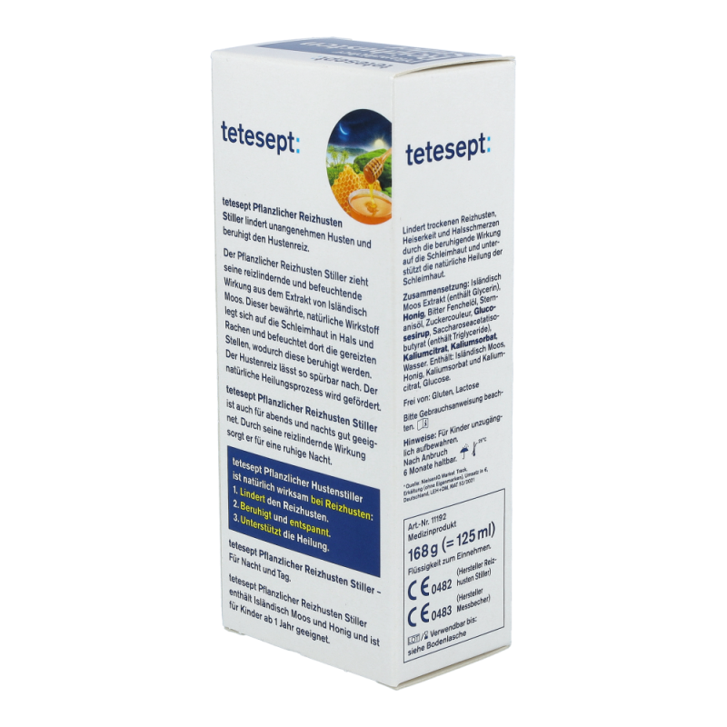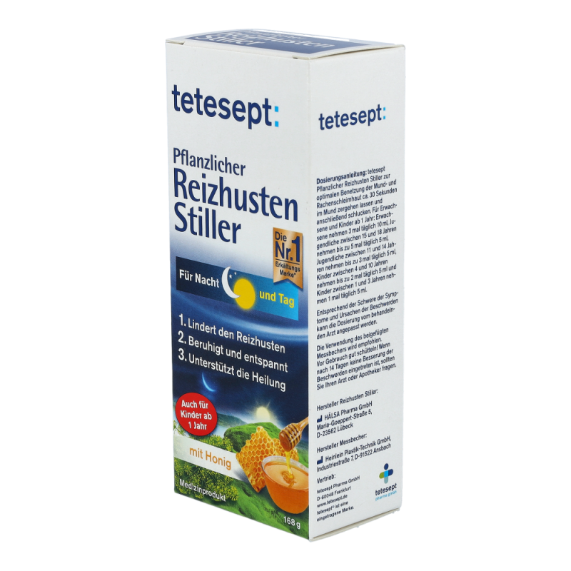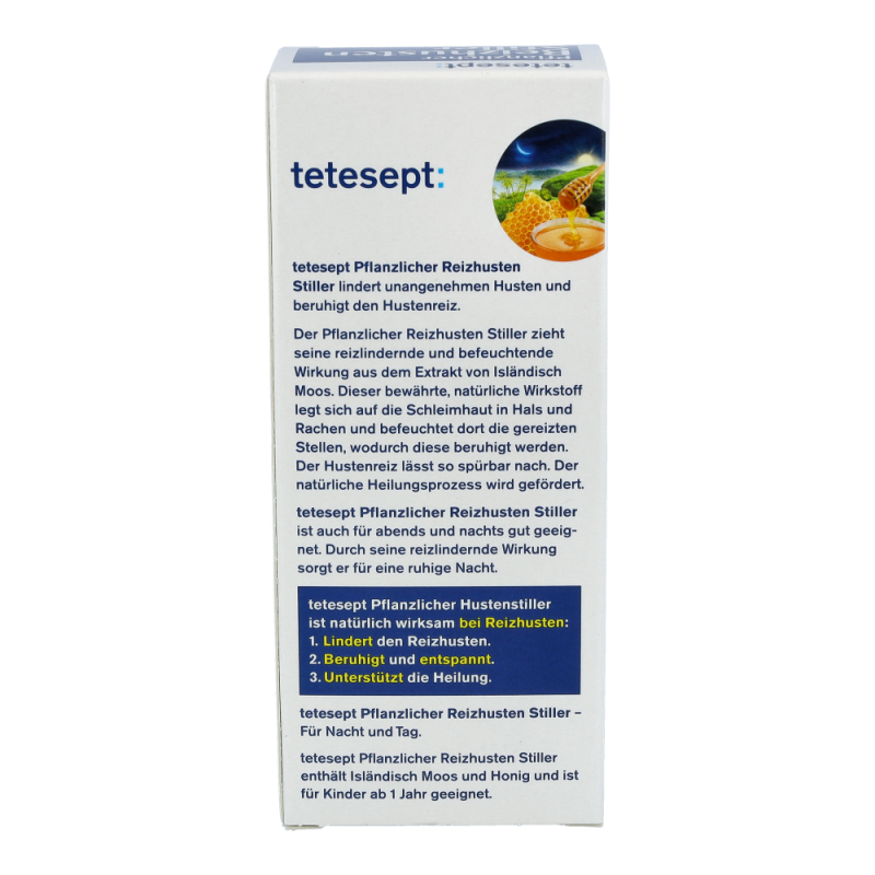 Tetesept Pflanzlicher Reizhusten Stiller legt sich wie ein sanfter Balsam auf die gereizte Schleimhaut, wodurch diese beruhigt wird. Der lästige Hustenreiz wird spürbar gelindert und die Schleimhaut zudem länger befeuchtet..