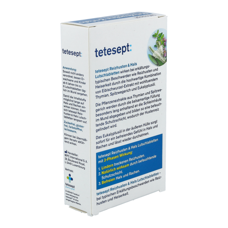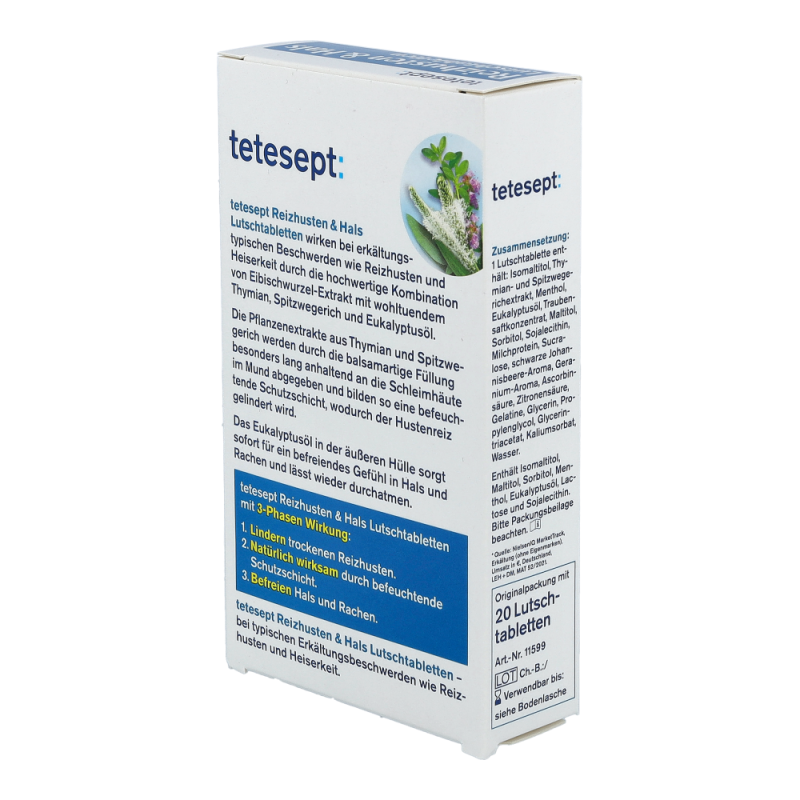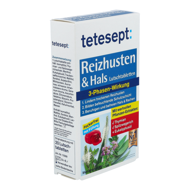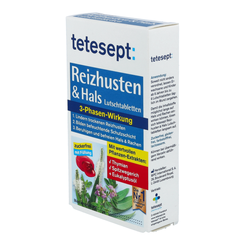 Tetesept Reizhusten und Hals Lutschtabletten wirken in drei Phasen linderns bei Husten, Heiserkeit und leichten Halsschmerzen.