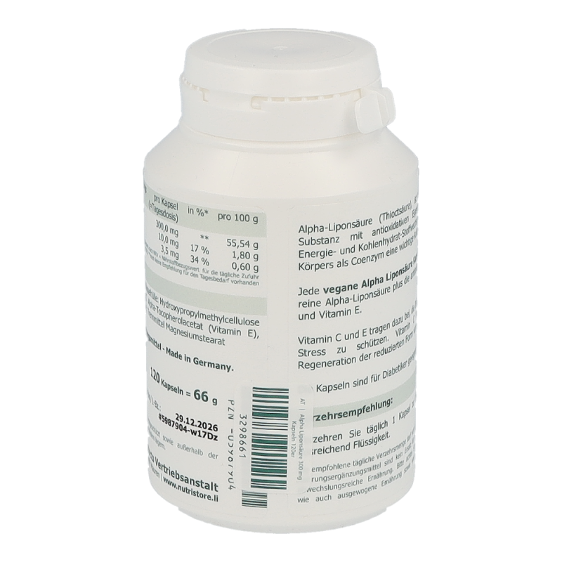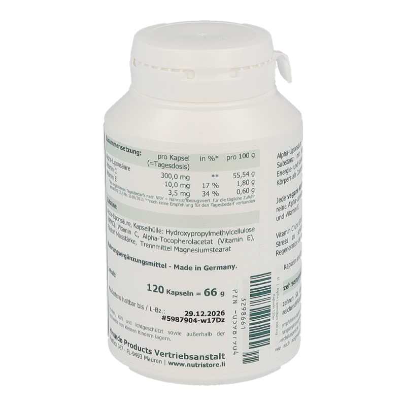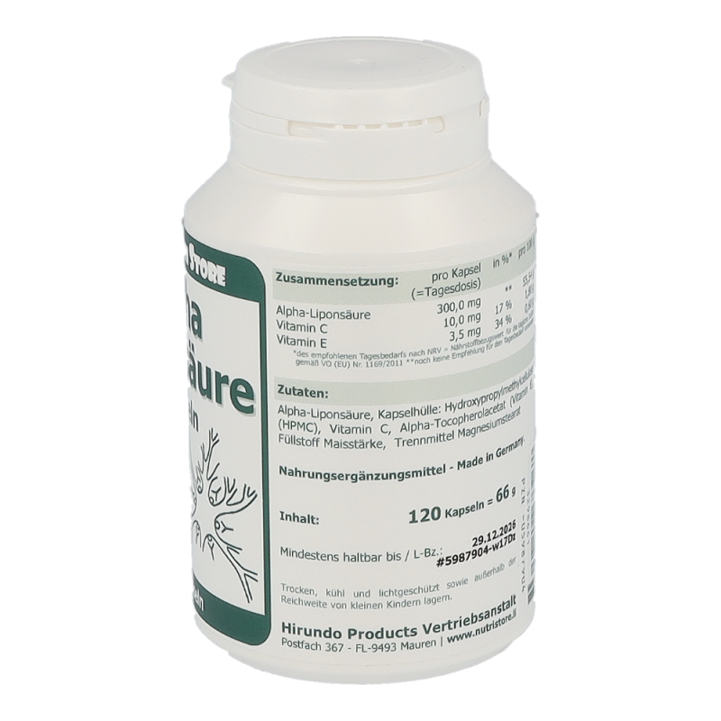 Alpha-Liponsäure Kapseln 300 mg sind ein hochwirksames Antioxidans, dass den Blutzuckerspiegel regulieren und bei neuropathischen Erscheinungen Abhilfe schaffen kann.