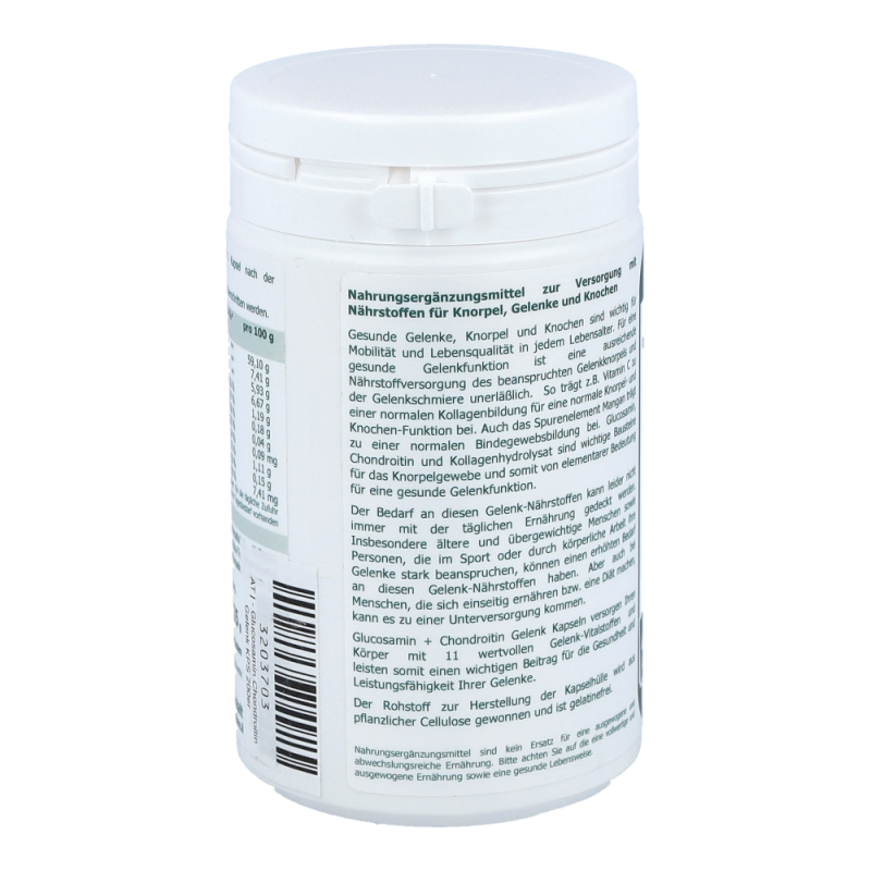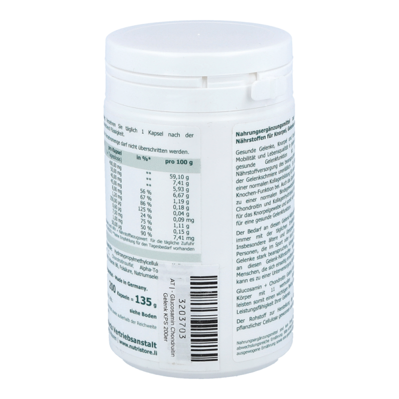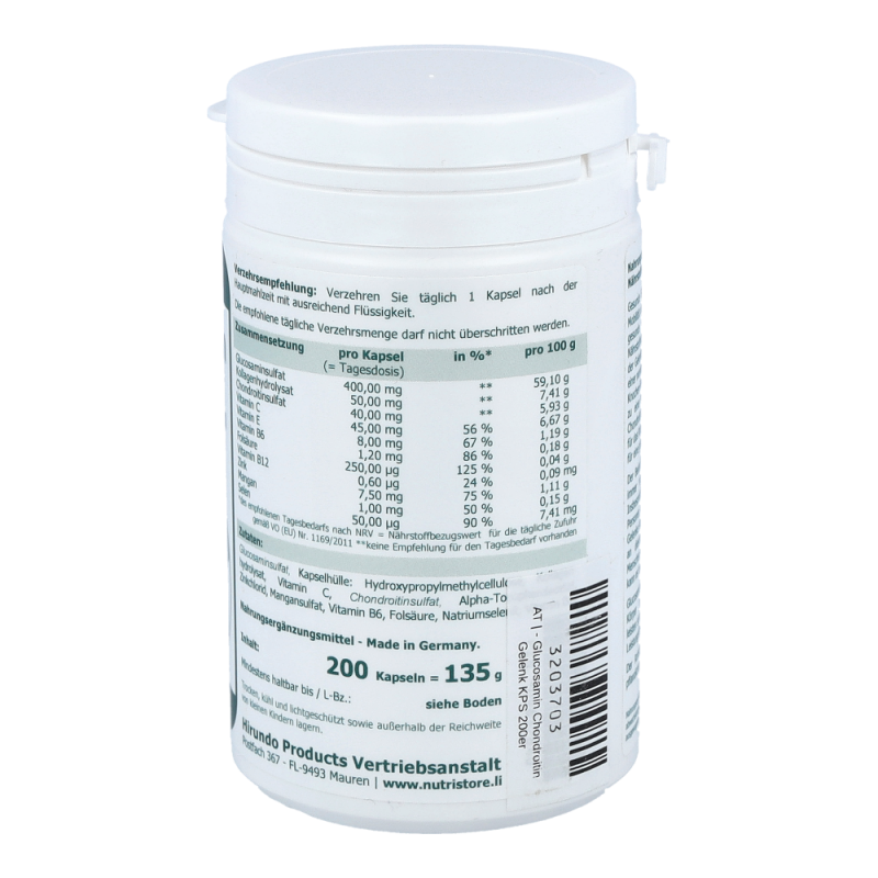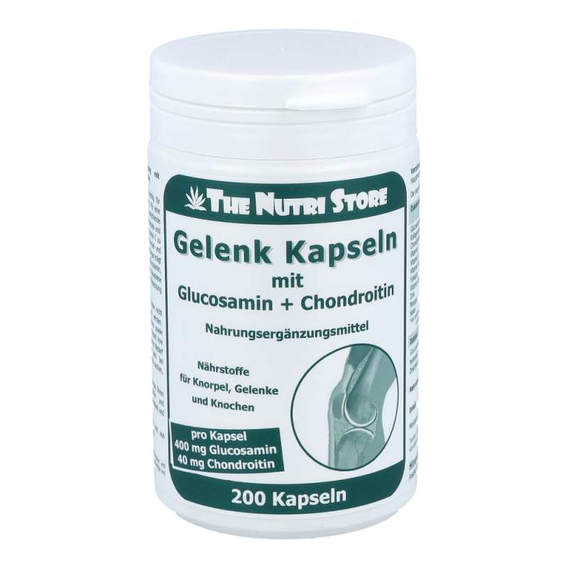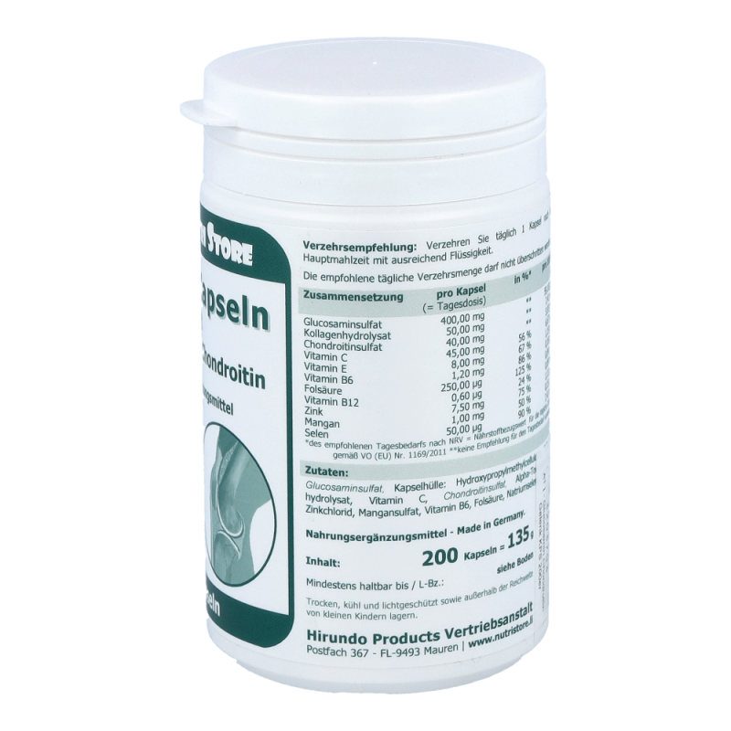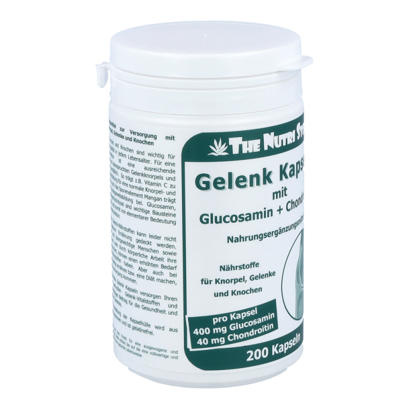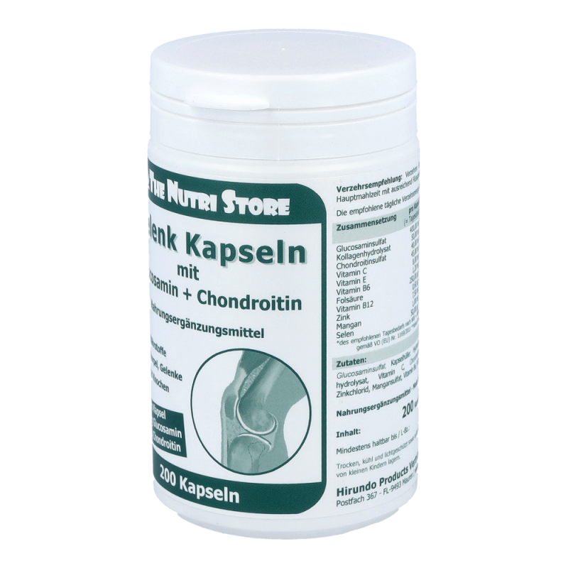 The Nutri Store Gelenk Kapseln mit Glucosamin + Chondroitin enthalten 400 mg Glucosamin, 50 mg Kollagenhydrolysat, 40 mg Chondroitin und 8 weitere Vitalstoffe. Verzehrsempfehlung: Verzehren Sie täglich 1 Kapsel mit ausreichend Flüssigkeit.