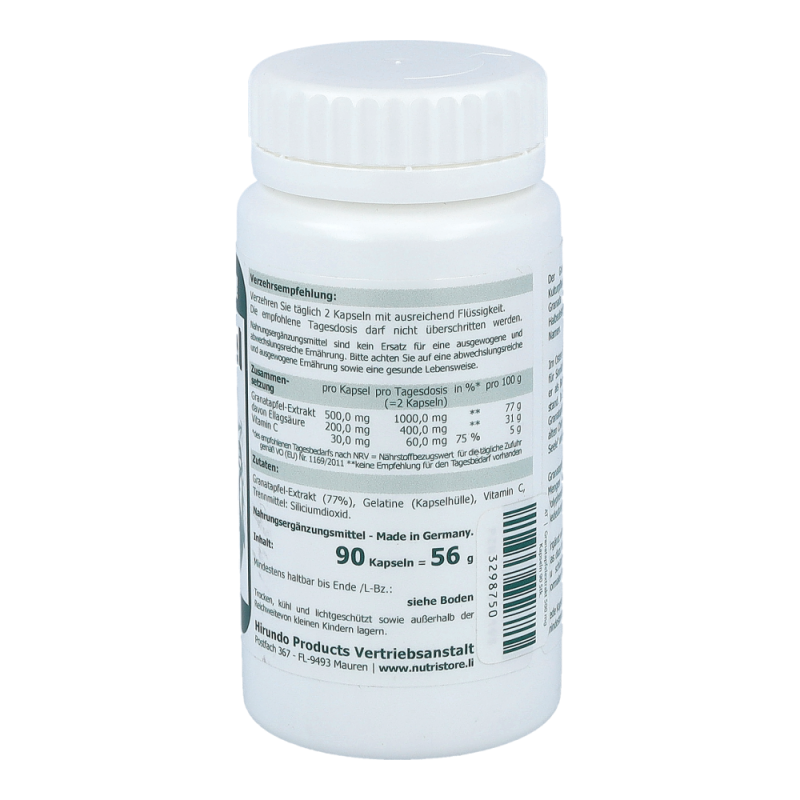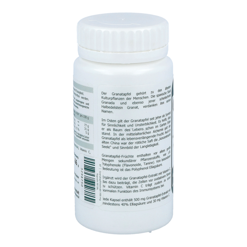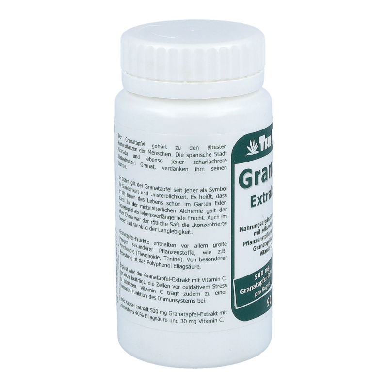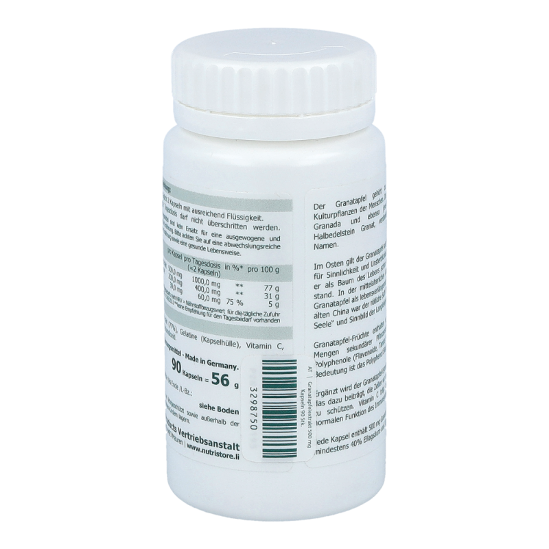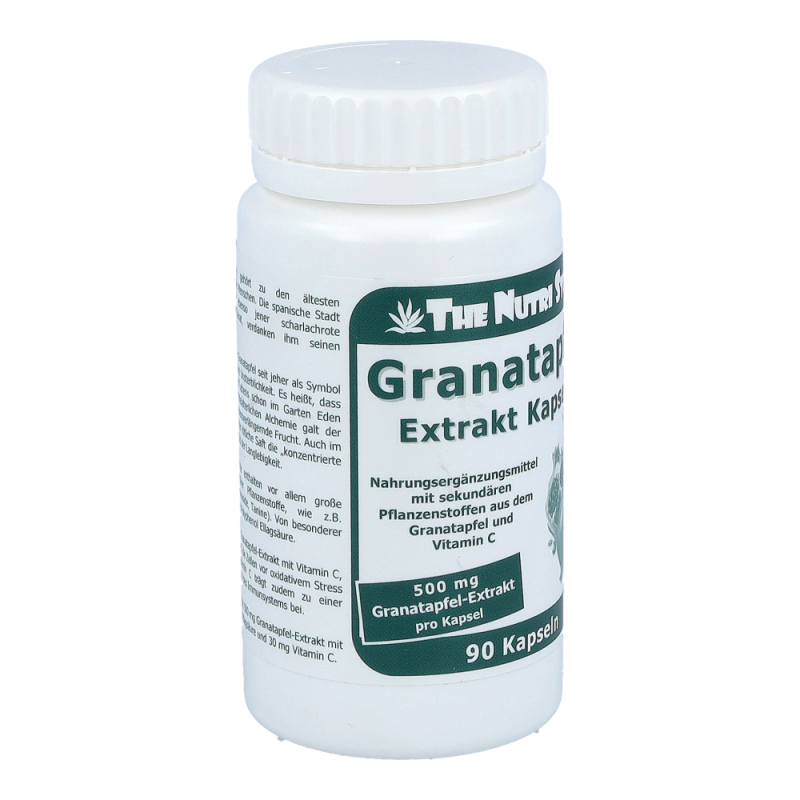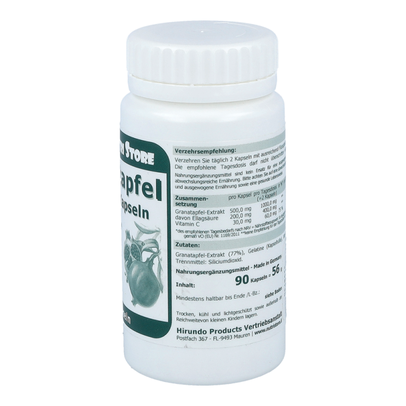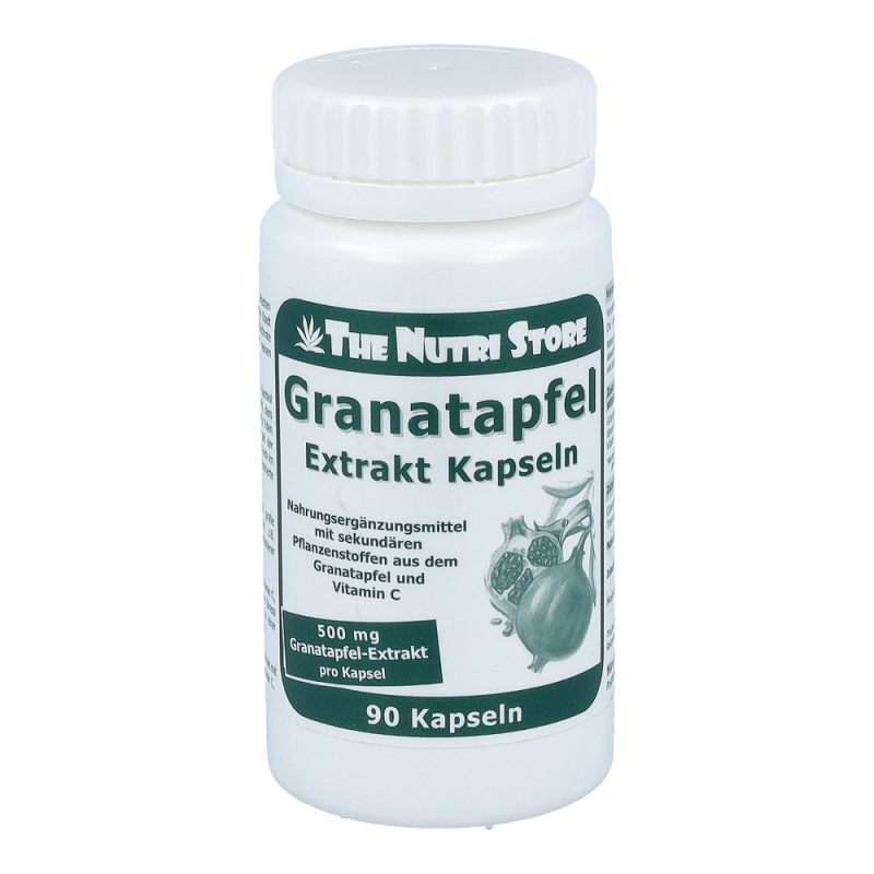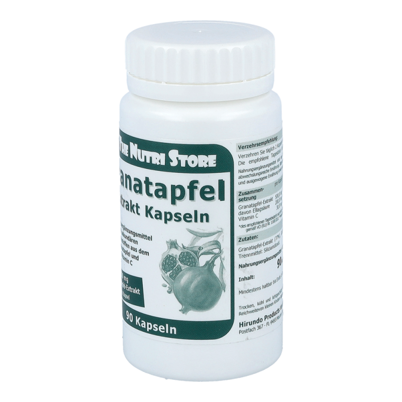 The Nutri Store Granatapfel Extrakt 500 mg Kapseln enthalten 500 mg Granatapfel-Extrakt mit mindestens 40% Ellagsäure und 30 mg Vitamin C.