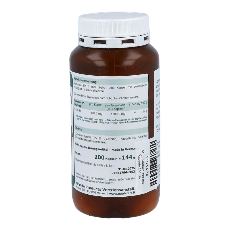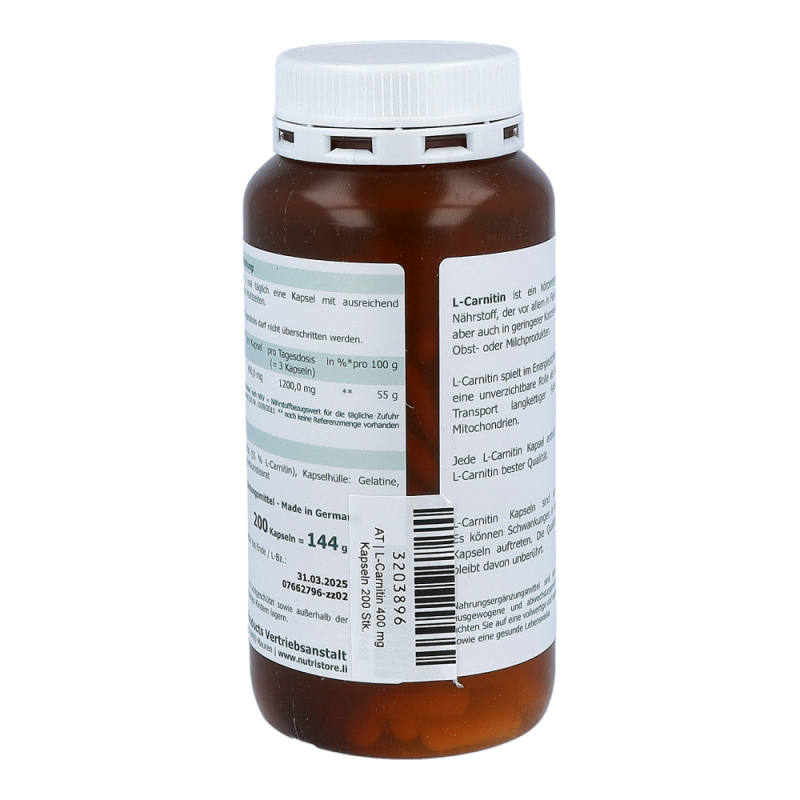 The Nutri Store L-Carnitin 400 mg vegetarische Kapseln enthalten 400 mg reines L-Carnitin bester Qualität.Verzehrsempfehlung: Verzehren Sie 2 mal täglich eine Kapsel mit ausreichend Flüssigkeit zu den Mahlzeiten.