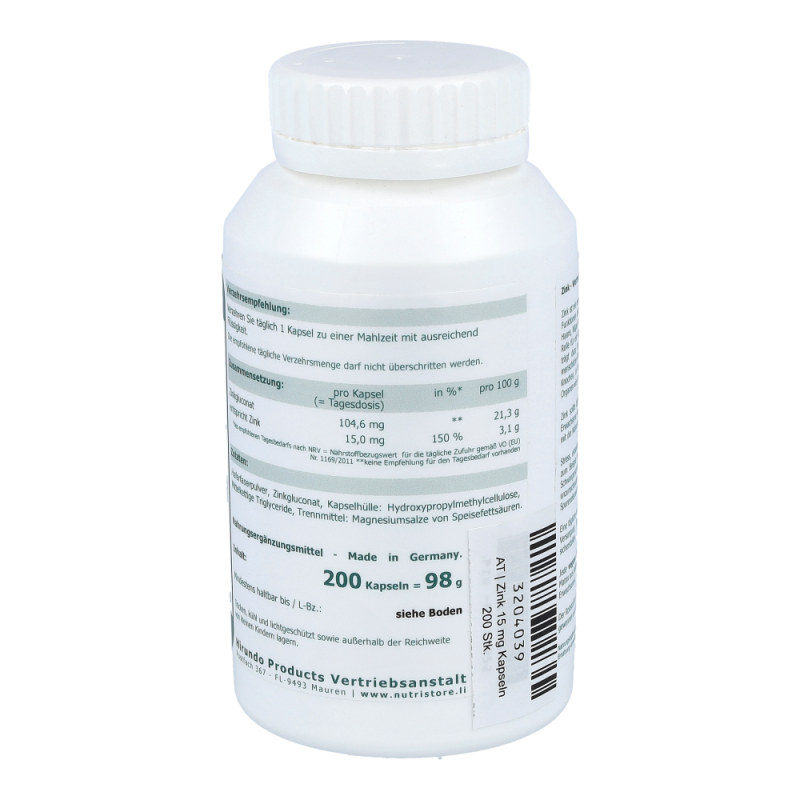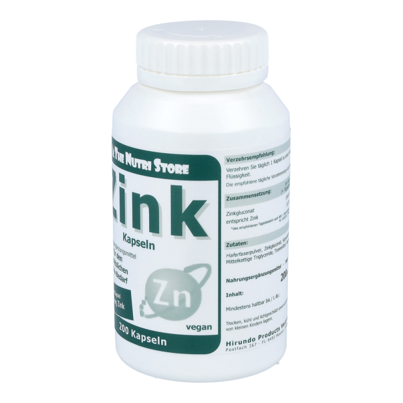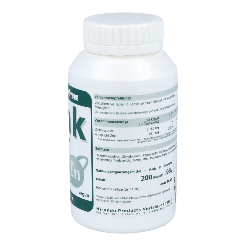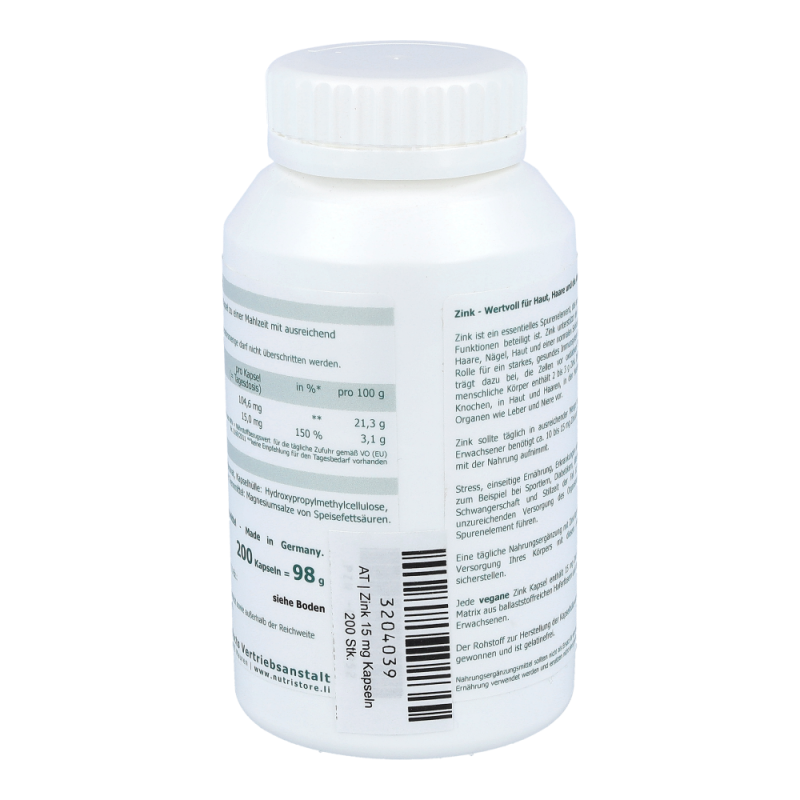 The Nutri Store Zink 15 mg Kapseln enthalten 15 mg Zink in einer gut verträglichen Matrix aus ballaststoffreichen Haferfasern und deckt den Tagesbedarf eines Erwachsenen.