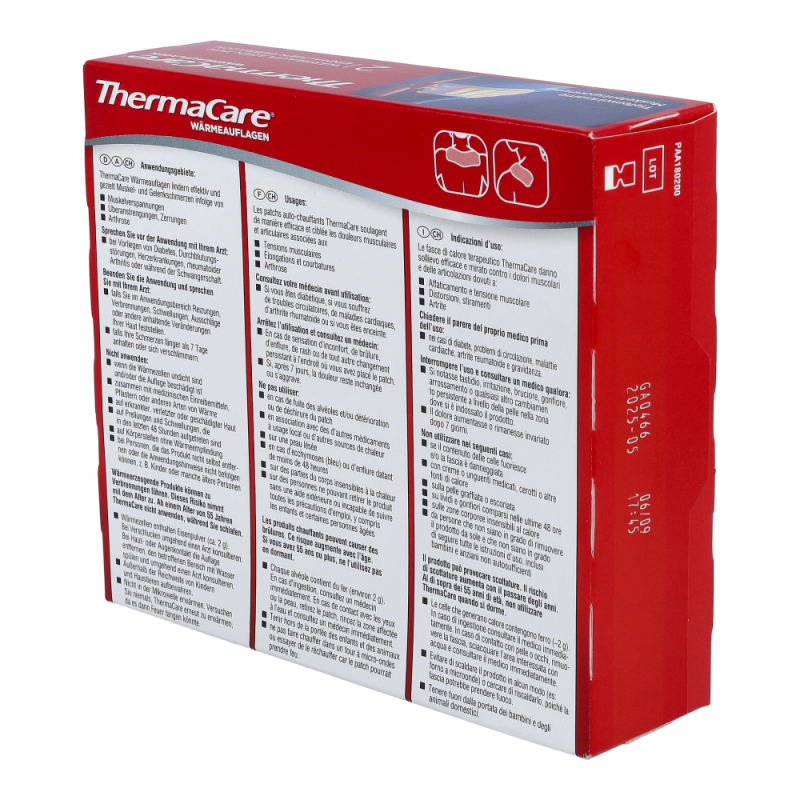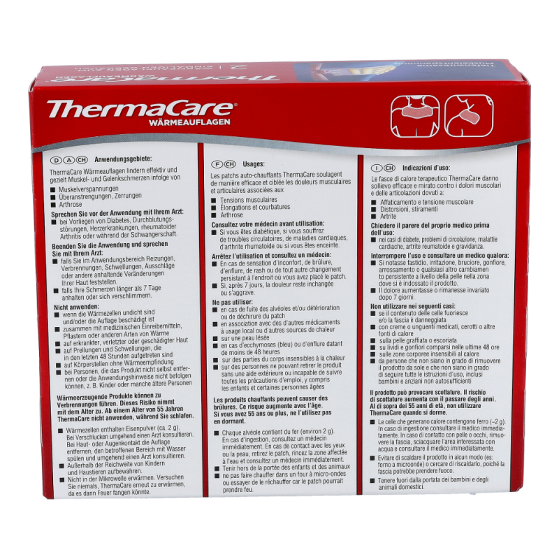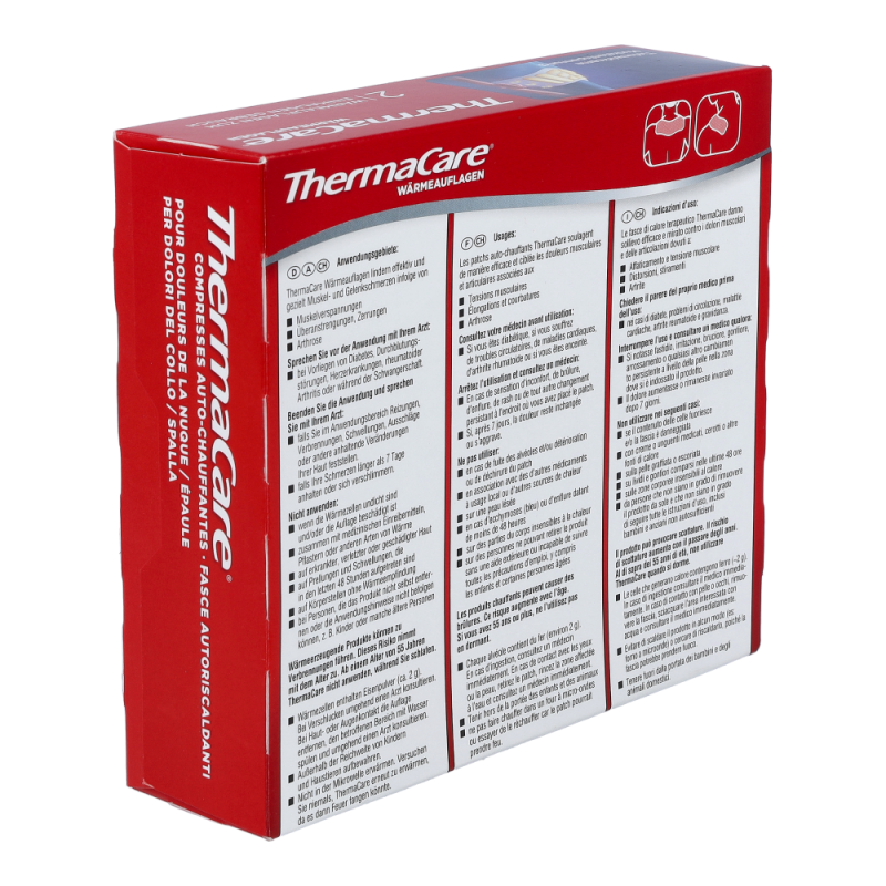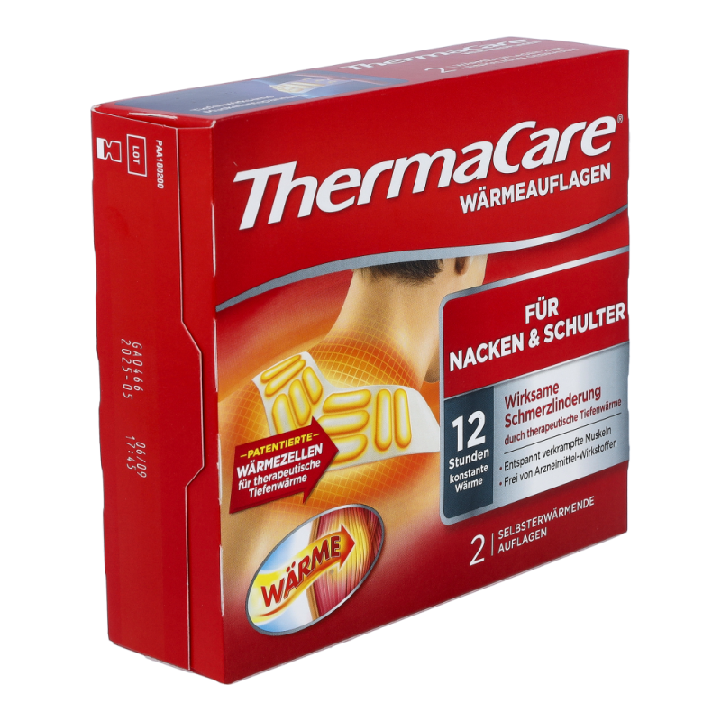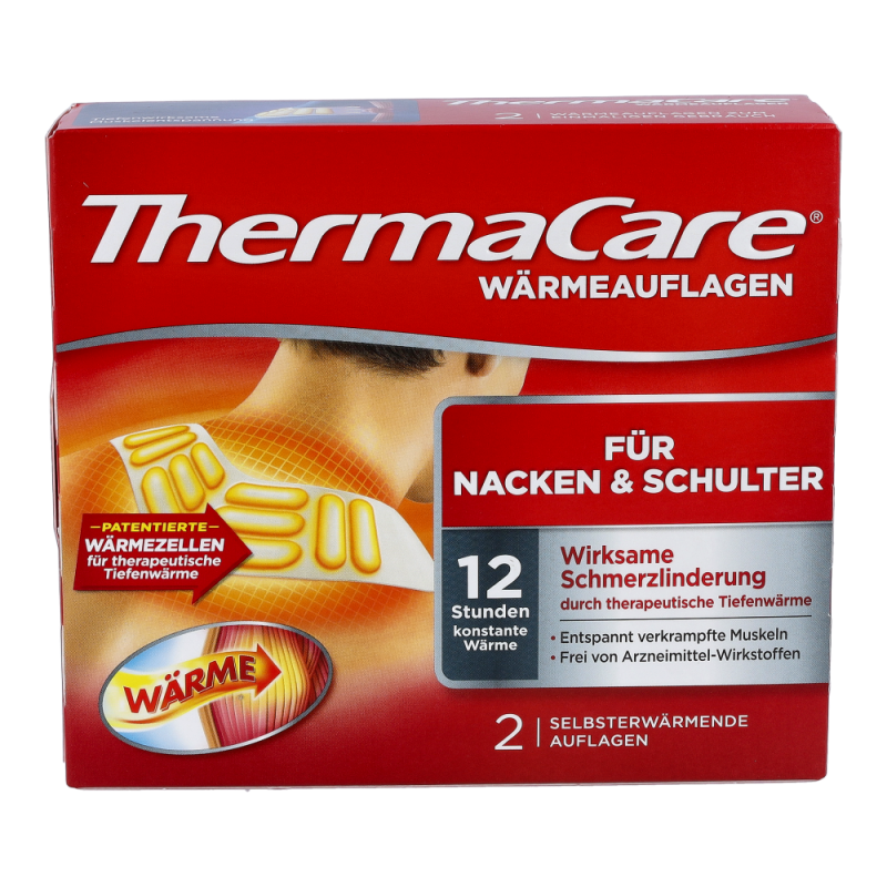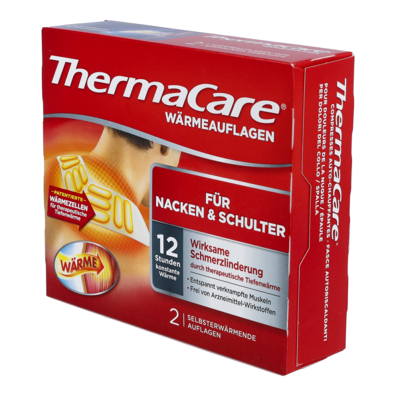 ThermaCare Nacken- & Schulterauflagen lindern Schmerzen im Nacken sowie in Schulter- und Armbereich. Die Auflagen passen sich bei der Anwendung exakt an und sind durch ihre reduzierte Klebefläche sehr hautfreundlich. Sie verkleben kaum und können diskret unter der Kleidung getragen werden..