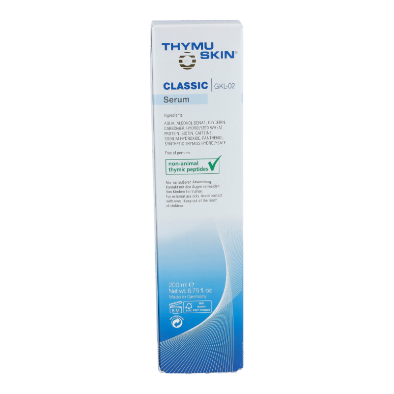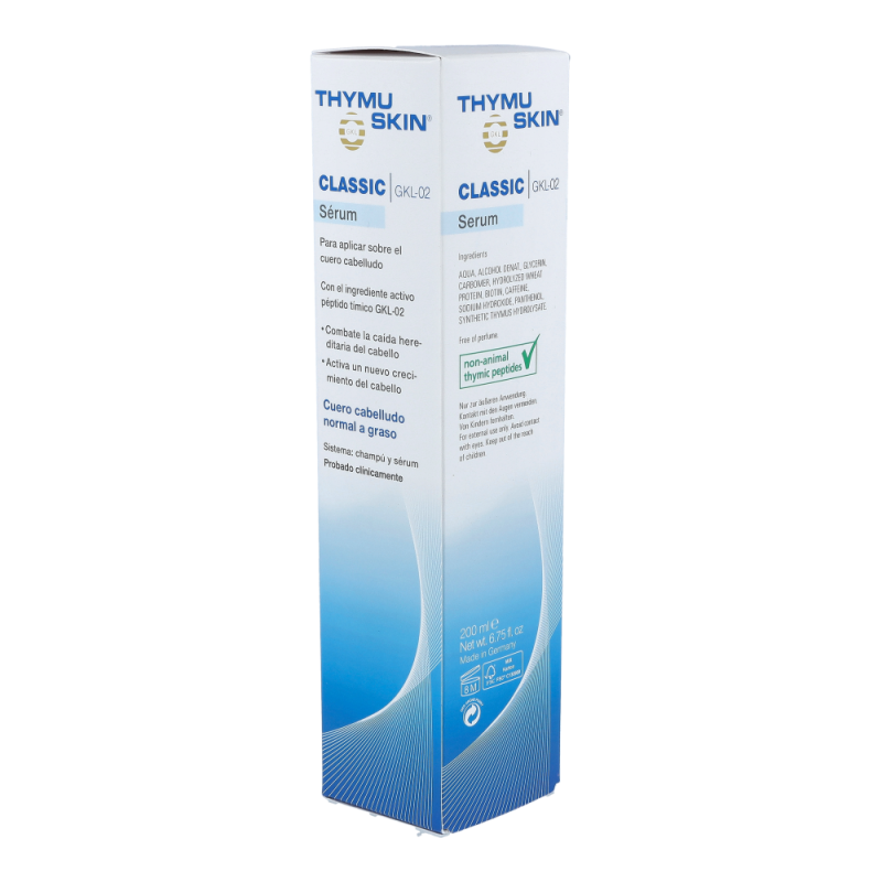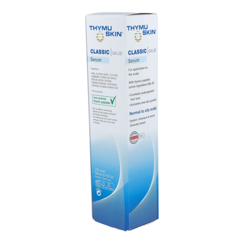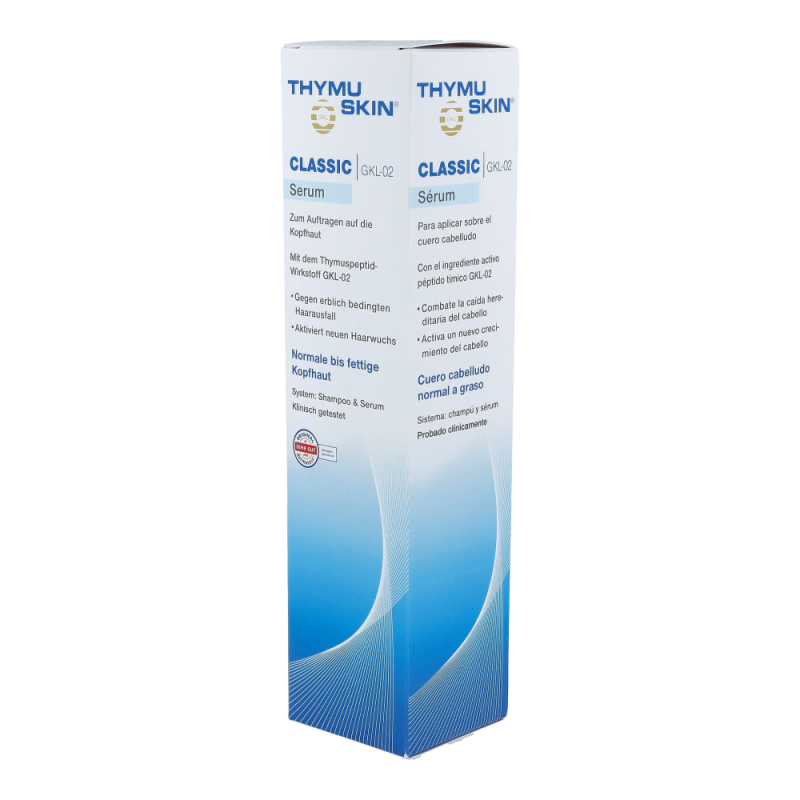 Thymuskin Classic Serum stoppt Haarausfall und aktiviert neuen Haarwuchs. Dieses Produkt zeichnet sich durch seine hohe Wirksamkeit ebenso wie durch die gute Verträglichkeit aus. Die in Thymuskin enthaltenen Pflegestoffe revitalisieren und regenerieren das Haar. Das Ergebnis sind schöne, natürliche und kräftige Haare, frei von unerwünschten Zusatzstoffen – jetzt mit hohem Rabatt bestellen > durch GRATIS Lieferung* bares Geld sparen!