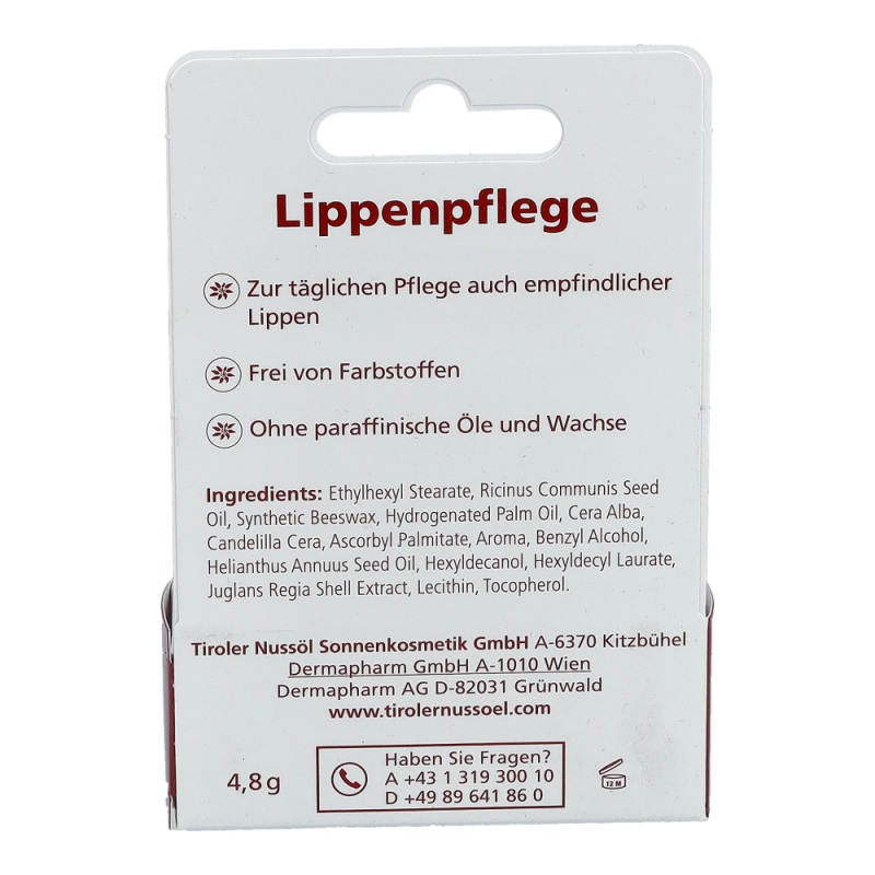 Tiroler Nussöl Original Lippenpflege ist ein feuchtigkeitsspendender und regenerierender Lippenpflegestift, der für empfindliche und trockene Lippen geeignet ist.
