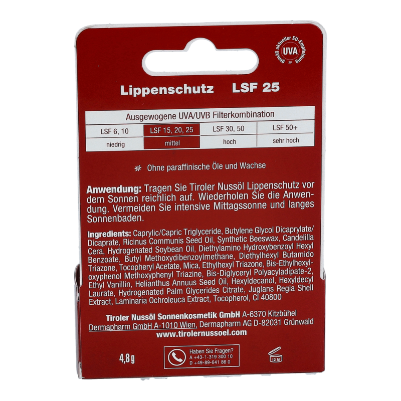 Tiroler Nussöl Lippenschutz-Stift mit Sonnenschutzfaktor 25 eignet sich ideal zur täglichen Pflege auch von empfindlichen Lippen.