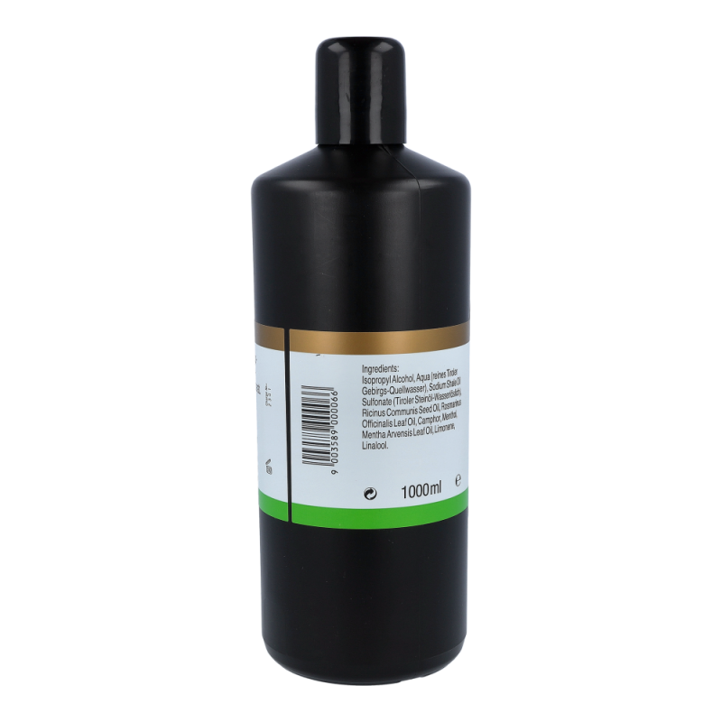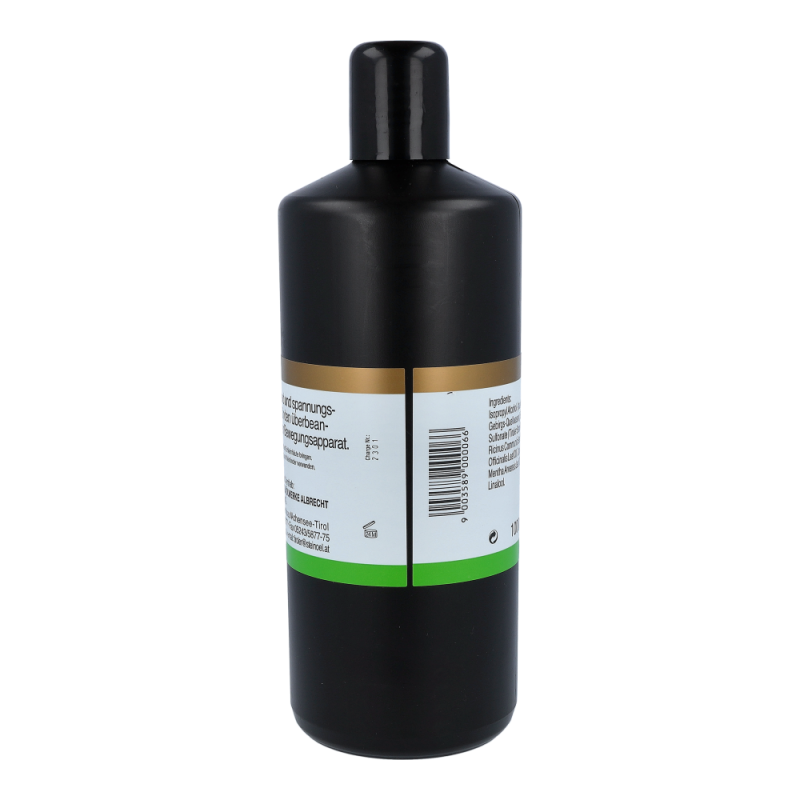 Isopropyl Alcohol (Alkohol), Aqua (reines Tiroler Gebirgs-Quellwasser), Sodium Shale Oil Sulfonate (Tiroler Steinöl-Wasserlöslich), Ricinus Communis Seed Oil (Rizinusöl), Rosmarinus Officinalis Leaf Oil (Rosmarinöl), Camphor (Kampfer), Menthol (Menthol), Mentha Arvensis Leaf Oil (Ackerminzenblattöl), Limonene (Bestandteil natürl. ätherischer Öle), Linalool (Bestandteil natürl. ätherischer Öle)
