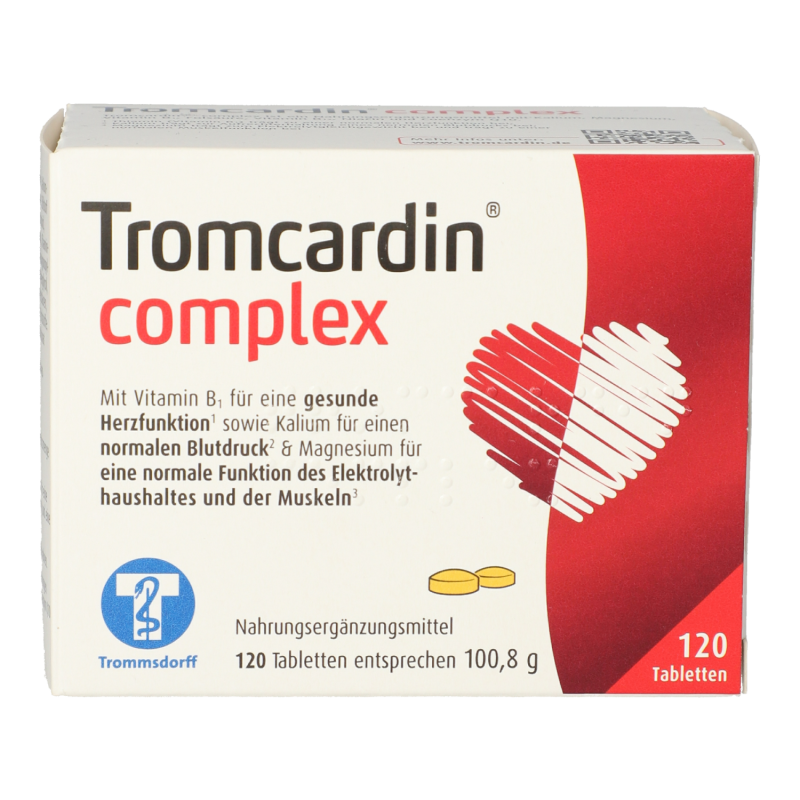 Tromcardin complex ist eine ergänzende bilanzierte Diät mit Kalium, Magnesium, Folsäure, Vitamin B12, Niacin und Coenzym Q10 zur diätetischen Behandlung von Personen mit Herz-Erkrankungen, insbesondere Herzrhythmusstörungen. ei Herzkreislauferkrankungen wird ein spezifischer Bedarf an den Vitaminen Folsäure, B12, Niacin, Coenzym Q10 sowie den Mineralstoffen Kalium und Magnesium beschrieben. Für die Kombination dieser Mikronährstoffe sprechen nicht nur die Effekte dieser Nährstoffe auf das Herz-Kreislauf-System im Einzelnen, sondern auch die gegenseitig unterstützenden Effekte. .