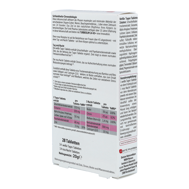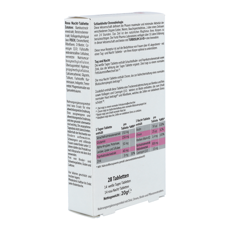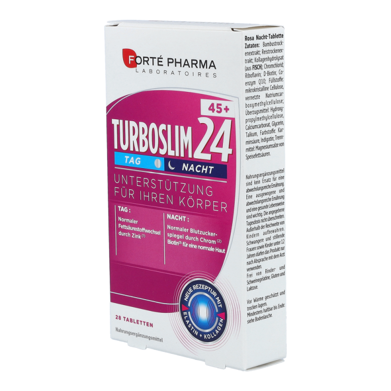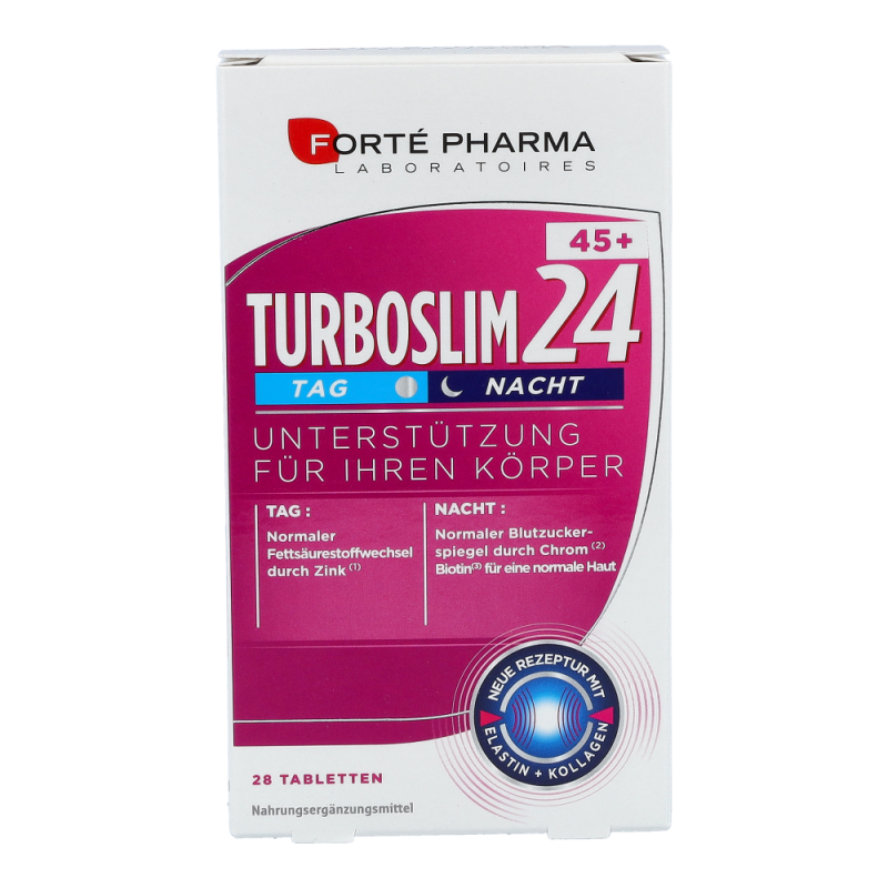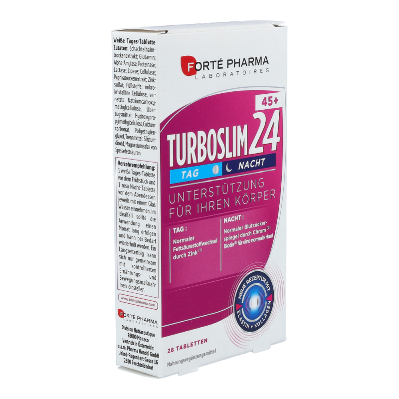 TURBOSLIM 24 45+ wurde speziell für die Ansprüche von Frauen über 45 entwickelt. Das Prinzip der Chronobiologie berücksichtigt die unterschiedlichen Aktivitätsphasen der Organe im Laufe des Tages. Diese Rezeptur ist auf die Bedürfnisse von Frauen über 45 abgestimmt – mit einer Tag- und Nachtwirkung – um ihren Körper zu unterstützen – dauerhaft mit hohem Rabatt bestellen!