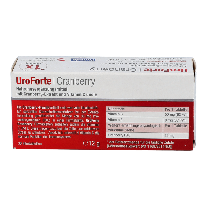 BIOGELAT® UroForte Cranberry Filmtabletten Nahrungsergänzungsmittel mit Cranberry-Extrakt (36 mg Proanthocyanidine) und den Vitaminen C und E. Vitamin C unterstützt Ihr Immunsystem und Vitamin E schützt die Zellen vor oxidativem Stress. 1 Filmtablette (= Tagesempfehlung) enthält: 120 mg Cranberry-Extrakt, entsprechend 36 mg Proanthocyanidine (PAC) 50 mg Vitamin C (63%**) 8,0 mg Vitamin E (67%**) ** des Nährstoffbezugswertes (VO EU 1169/2011) BIOGELAT® UroForte Cranberry Filmtabletten ist ein Nahrungsergänzungsmittel, das dazu bestimmt ist die tägliche Ernährung mit einem hochwertigen Extrakt aus der Cranberry-Frucht und den Vitaminen C und E gezielt zu ergänzen. Die Cranberry-Frucht enthält viele wertvolle Inhaltsstoffe. Ein spezielles Konzentrationsverfahren bei der Extraktherstellung gewährleistet die Menge von 36 mg Proanthocyanidinen (PAC) in einer Filmtablette. BIOGELAT® UroForte Cranberry Filmtabletten enthalten zudem die Vitamine C und E. Vitamin C und E tragen dazu bei, die Zellen vor oxidativem Stress zu schützen. Zusätzlich unterstützt Vitamin C die normale Funktion des Immun systems. Nährwertangaben pro 100 g pro Tablette* (= Tagesempfehlung) Brennwert 1602 kJ/381 kcal 6 kJ/1 kcal Fett 4,4 g < 0,1 g davon gesättigte Fettsäuren 2,4 g < 0,1 g Kohlenhydrate 73 g < 0,5 g davon Zucker 9,4 g < 0,1 g Eiweiß < 0,1 g < 0,1 g Salz 0,02 g < 0,01 g Vitamin C 12500 mg (15625%**) 50 mg (63%**) Vitamin E 2000 mg (16667%**) 8,0 mg (67%**) * Eine Packung enthält 30/60 Portionen. ** der Referenzmenge für die tägliche Zufuhr (Nährstoffbezugswert (VO 1169/2011/EU)) 759 759 526263_Packz.pdf 3 28. 03. 2019 14:23:13 Anwendung: Täglich 1 Filmtablette mit etwas Flüssigkeit zu einer Mahlzeit einnehmen. Achten Sie zusätzlich auf eine ausreichende Flüssigkeitszufuhr von insgesamt 1,5 bis 2 Liter pro Tag. Für Kinder ab 4 Jahren, Jugendliche und Schwangere geeignet. Für Kinder und Personen mit Schluckbeschwerden bei der Einnahme von Tabletten empfi ehlt sich die Anwendung von BIOGELAT® UroForte Cranberry Granulat oder BIOGELAT® UroForte Cranberry Liquidum. Hinweis für Diabetiker: Eine Anrechnung von BE ist nicht erforderlich. Allgemeine Hinweise: Nahrungsergänzungsmittel sind kein Ersatz für eine abwechslungsreiche Ernährung. Eine ausgewogene Ernährung und eine gesunde Lebensweise sind wichtig. Die angegebene empfohlene Tagesdosis nicht überschreiten. Nicht über 25 °C und außerhalb der Reichweite von Kindern lagern. Die Marke BIOGELAT® ist ein seit 1988 im Bereich Arzneimittel und Nahrungsergänzungsmittel geschütztes Warenzeichen der Firma Kwizda Pharma GmbH und stellt keinen Hinweis dar, dass das gegenständliche Produkt aus biologischer Landwirtschaft stammt oder nur aus ökologisch/ biologisch produzierten Bestandteilen zusammengesetzt ist. Nur in Apotheken erhältlich. Zutaten: Cranberry Extrakt (30%)1 ; Ascorbinsäure (Vitamin C); Füllstoffe: modifi zierte Stärke, Cellulose, Hydroxypropylmethylcellulose; Tocopherolacetat (Vitamin E); Trennmittel: Siliziumdioxid, Talkum, Magnesiumstearat; Feuchthalte mittel: Polydextrose; Maltodextrin; Kokosöl; Farbstoffe: Karmin, Titandioxid, Eisenoxid. 1mit wertvollen Cranberries aus Amerika Ohne Zuckerzusatz. Enthält von Natur aus Zucker. Laktosefrei, glutenfrei, ohne Konservierungsstoffe Weitere Produkte: BIOGELAT® UroForte Cranberry Granulat BIOGELAT® UroForte Cranberry Liquidum BIOGELAT® UroForte Cranberry plus Birke Granulat Hersteller und Vertrieb: Kwizda Pharma GmbH, Effi ngergasse 21, 1160 Wien www.kwizda-otc.at www.gesunde-blase.at Stand der Information: Februar 2019 759 759 13182_13_AT 759