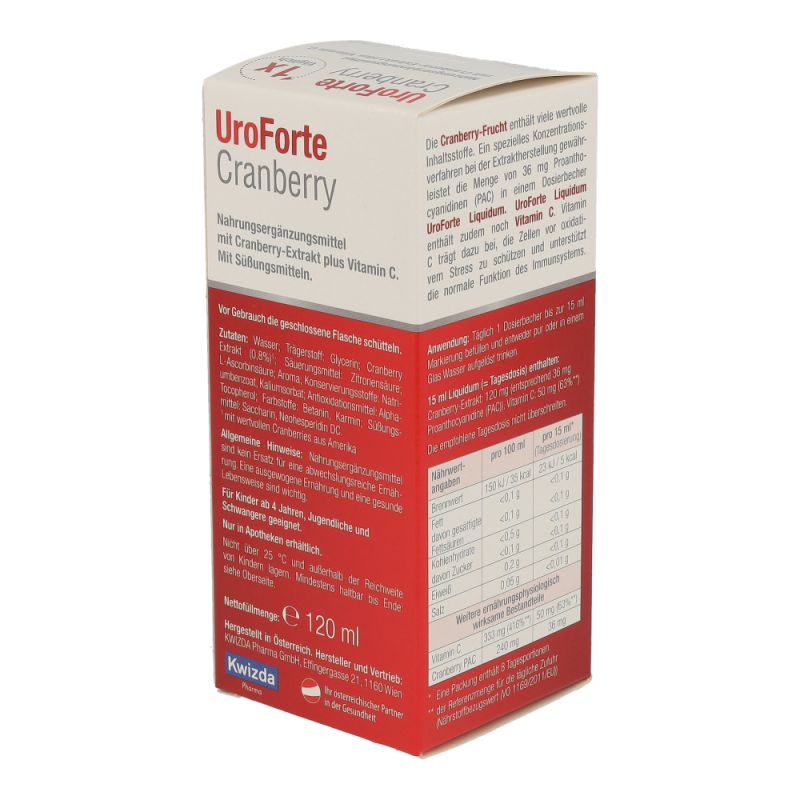 BIOGELAT® UroForte Cranberry Liquidum Nahrungsergänzungsmittel mit Cranberry-Extrakt plus Vitamin C. Mit Süßungsmitteln. Vitamin C unterstützt Ihr Immunsystem. 15 ml Liquidum (= Tagesempfehlung) enthalten: 120 mg Cranberry-Extrakt, entsprechend 36 mg Proanthocyanidine (PAC) 50 mg Vitamin C (63%**) ** des Nährstoffbezugswertes (VO EU 1169/2011) BIOGELAT® UroForte Cranberry Liquidum ist ein Nahrungsergänzungsmittel, das dazu bestimmt ist die tägliche Ernährung mit einem hochwertigen Extrakt aus der Cranberry-Frucht und Vitamin C gezielt zu ergänzen. Die Cranberry-Frucht enthält viele wertvolle Inhaltsstoffe. Nur in Apotheken erhältlich. Nicht über 25 °C und für Kinder unerreichbar lagern. Haltbarkeit nach 1. Öffnen: 4 Wochen Weitere Produkte: BIOGELAT® UroForte Cranberry Filmtabletten BIOGELAT® UroForte Cranberry Granulat BIOGELAT® UroForte Cranberry plus Birke Granulat Hersteller und Vertrieb: Kwizda Pharma GmbH, Effi ngergasse 21, 1160 Wien www.kwizda-otc.at www.gesunde-blase.at Stand der Information: Februar 2019 13203_13_AT 764 Pharmacode 764 Pharmacode 764 526264_Packz.pdf 2 05. 03. 2019 09:07:12 Ein spezielles Konzentrationsverfahren bei der Extraktherstellung gewährleistet die Menge von 36 mg Proanthocyanidinen (PAC) in einem Dosierbecher BIOGELAT® UroForte Cranberry Liquidum. BIOGELAT® UroForte Cranberry Liquidum enthält zudem Vitamin C. Vitamin C trägt dazu bei, die Zellen vor oxidativem Stress zu schützen und unterstützt die normale Funktion des Immunsystems. Nährwertangaben pro 100 ml pro 15 ml Liquidum* (= Tagesempfehlung) Brennwert 150 kJ/35 kcal 23 kJ/5 kcal Fett davon gesättigte Fettsäuren < 0,1 g < 0,1 g < 0,1 g < 0,1 g Kohlenhydrate davon Zucker < 0,5 g < 0,1 g < 0,1 g < 0,1 g Eiweiß 0,2 g < 0,1 g Salz 0,05 g < 0,01 g Weitere ernährungsphysiologisch wirksame Bestandteile: Vitamin C 333 mg (416%**) 50 mg (63%**) Cranberry PAC 240 mg 36 mg * Eine Packung enthält 8 Tagesportionen (Packungsgröße 120 ml) bzw. 13 Tagesportionen (Packungsgröße 200 ml). ** der Referenzmenge für die tägliche Zufuhr (Nährstoffbezugswert (VO 1169/2011/EU)) Anwendung: Täglich 1 Dosierbecher bis zur 15 ml-Markierung befüllen und entweder pur oder in einem Glas Wasser aufgelöst trinken. Vor Gebrauch die geschlossene Flasche schütteln. Achten Sie zusätzlich auf eine ausreichende Flüssigkeits zufuhr von insgesamt 1,5 bis 2 Liter pro Tag. Für Kinder ab 4 Jahren, Jugendliche und Schwangere geeignet. Zutaten: Wasser; Trägerstoff: Glycerin; Cranberry Extrakt (0,8%)1 ; Säuerungsmittel: Zitronensäure; L-Ascorbinsäure; Aroma; Konservierungsstoffe: Natriumbenzoat, Kaliumsorbat; Antioxidationsmittel: Alpha-Tocopherol; Farbstoffe: Betanin, Karmin; Süßungsmittel: Saccharin, Neohesperidin DC. 1mit wertvollen Cranberries aus Amerika Laktosefrei, glutenfrei, zuckerfrei. Allgemeine Hinweise: Nahrungsergänzungsmittel sind kein Ersatz für eine abwechslungsreiche Ernährung. Eine ausgewogene Ernährung und eine gesunde Lebensweise sind wichtig. Die angegebene empfohlene Tagesdosis nicht überschreiten. Die Marke BIOGELAT® ist ein seit 1988 im Bereich Arzneimittel und Nahrungsergänzungsmittel geschütztes Warenzeichen der Firma Kwizda Pharma GmbH und stellt keinen Hinweis dar, dass das gegenständliche Produkt aus biologischer Landwirtschaft stammt oder nur aus ökologisch/biologisch produzierten Bestandteilen zusammengesetzt ist.